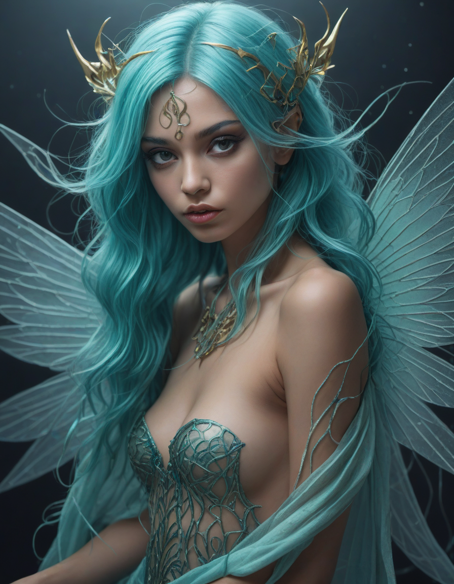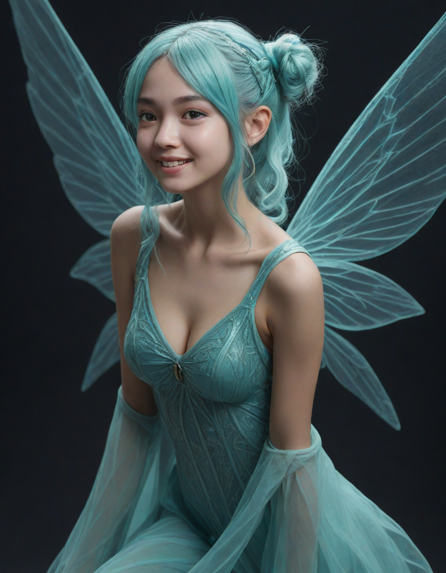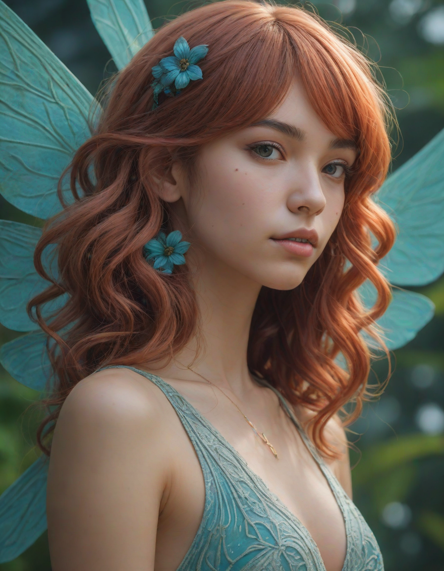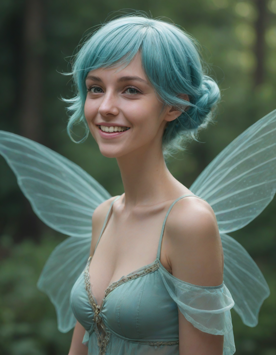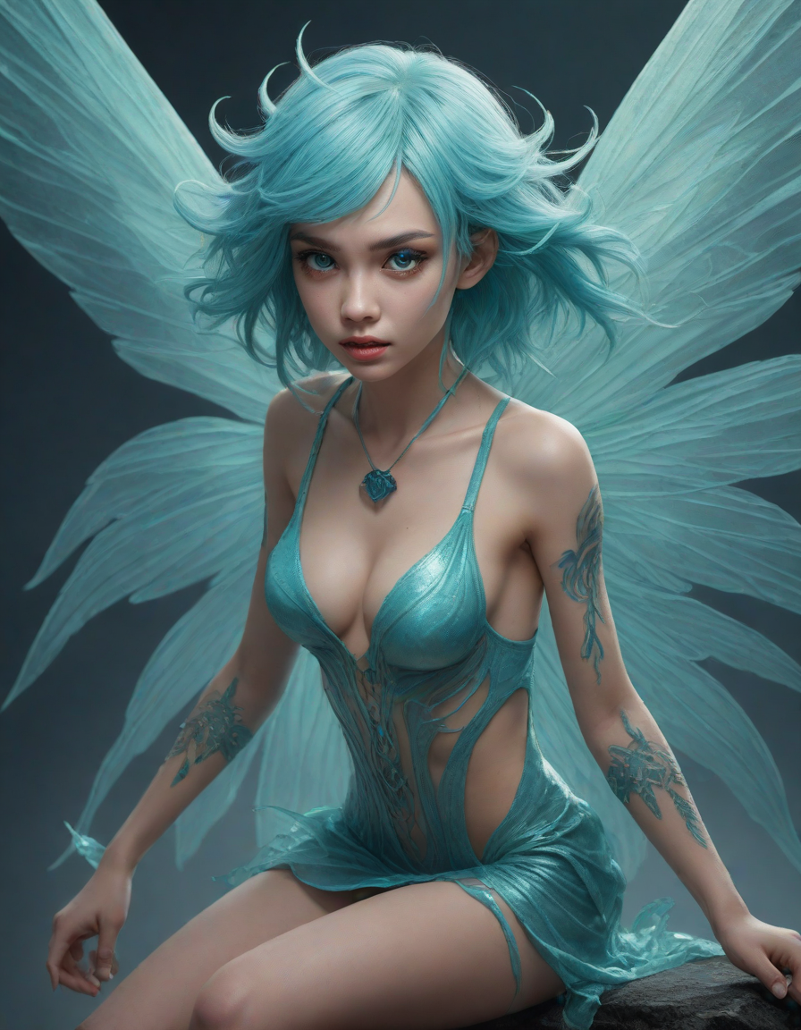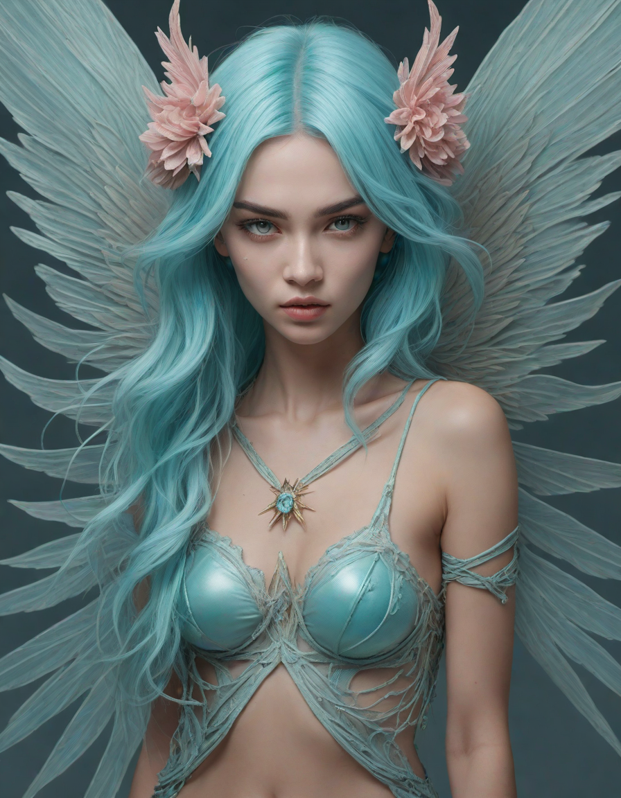 a radiant, aquamarine-haired fairy flitting about on delicate, translucent wings