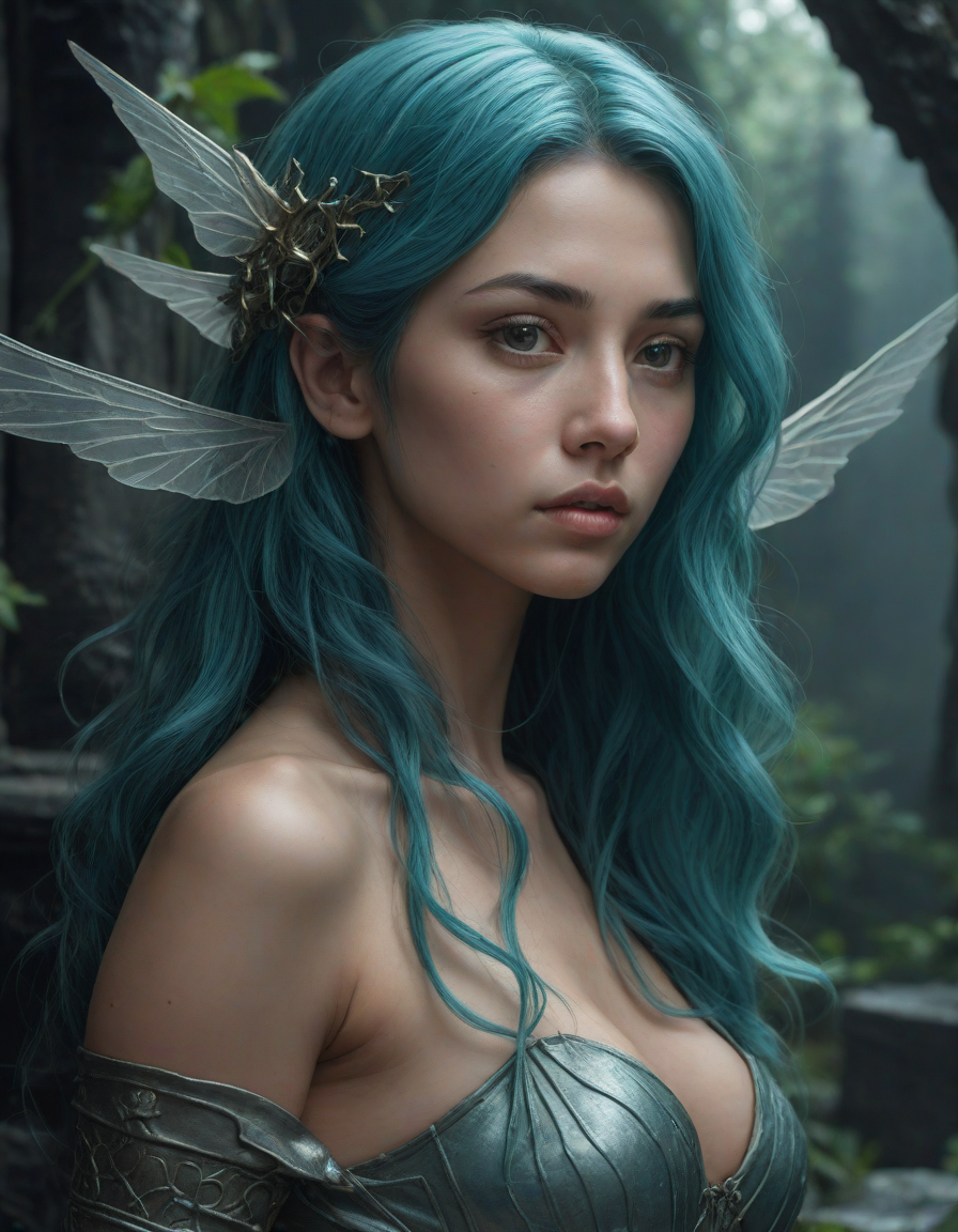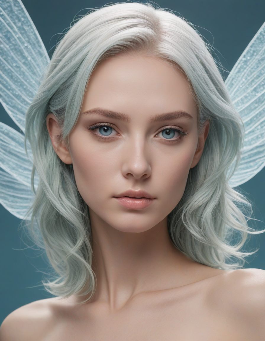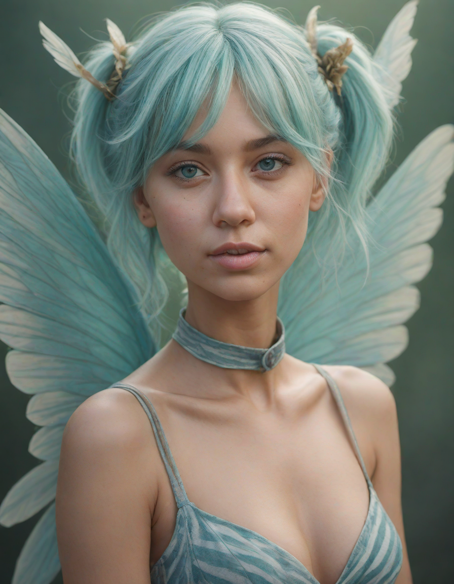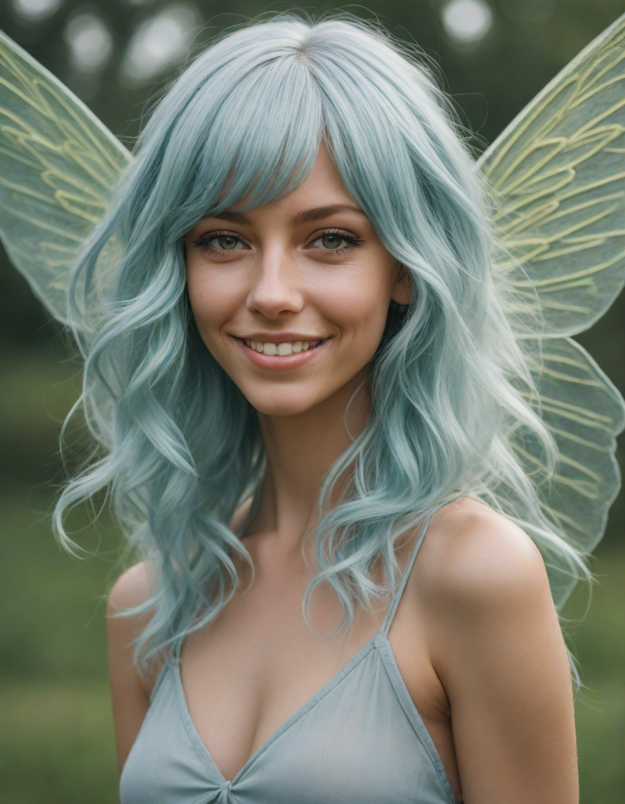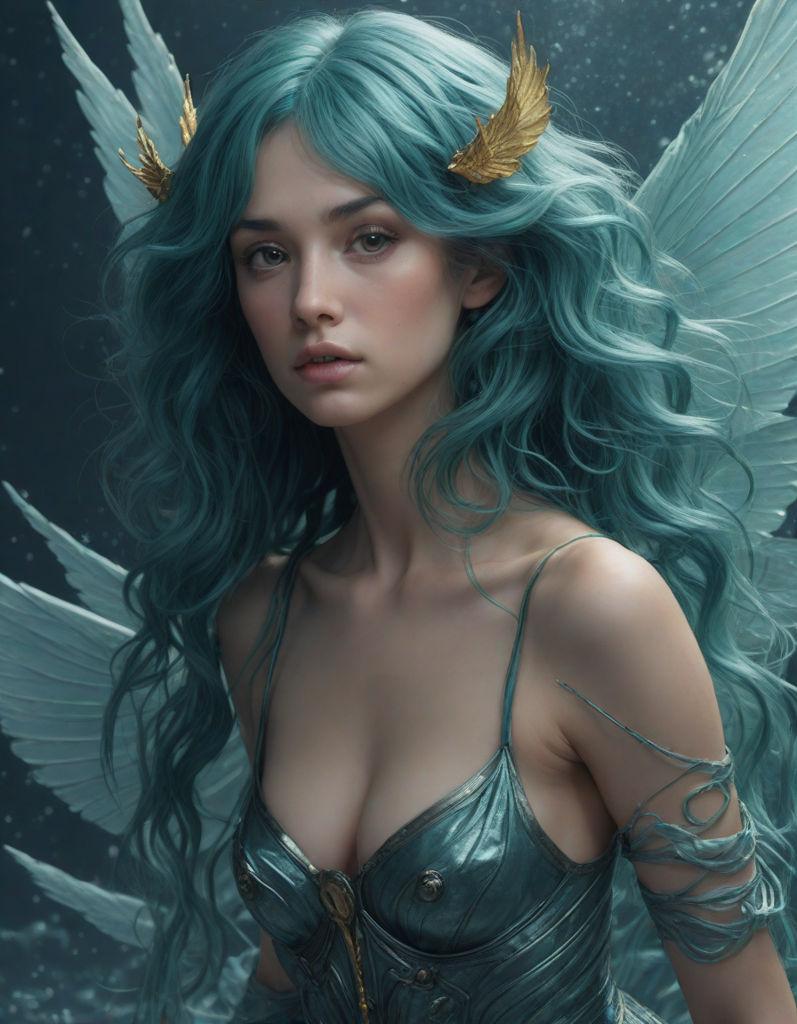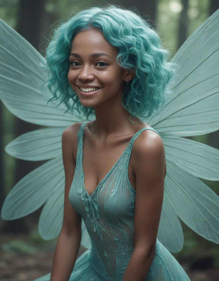 a radiant, aquamarine-haired fairy flitting about on delicate, translucent wings