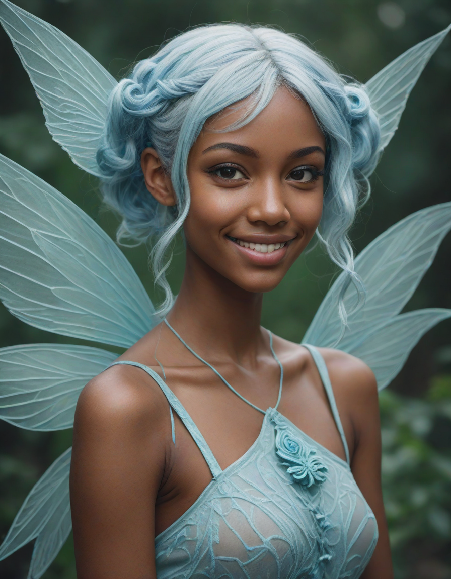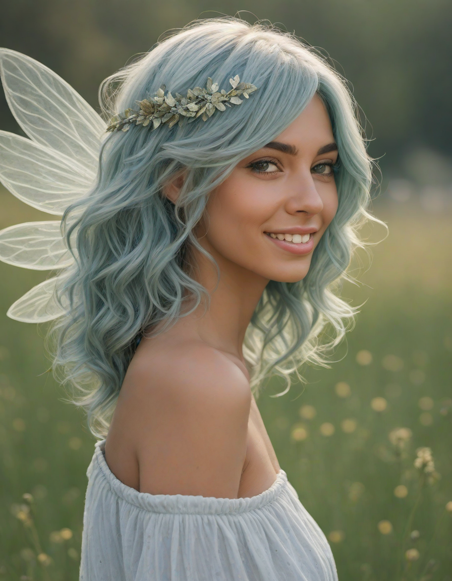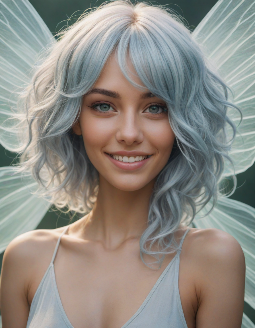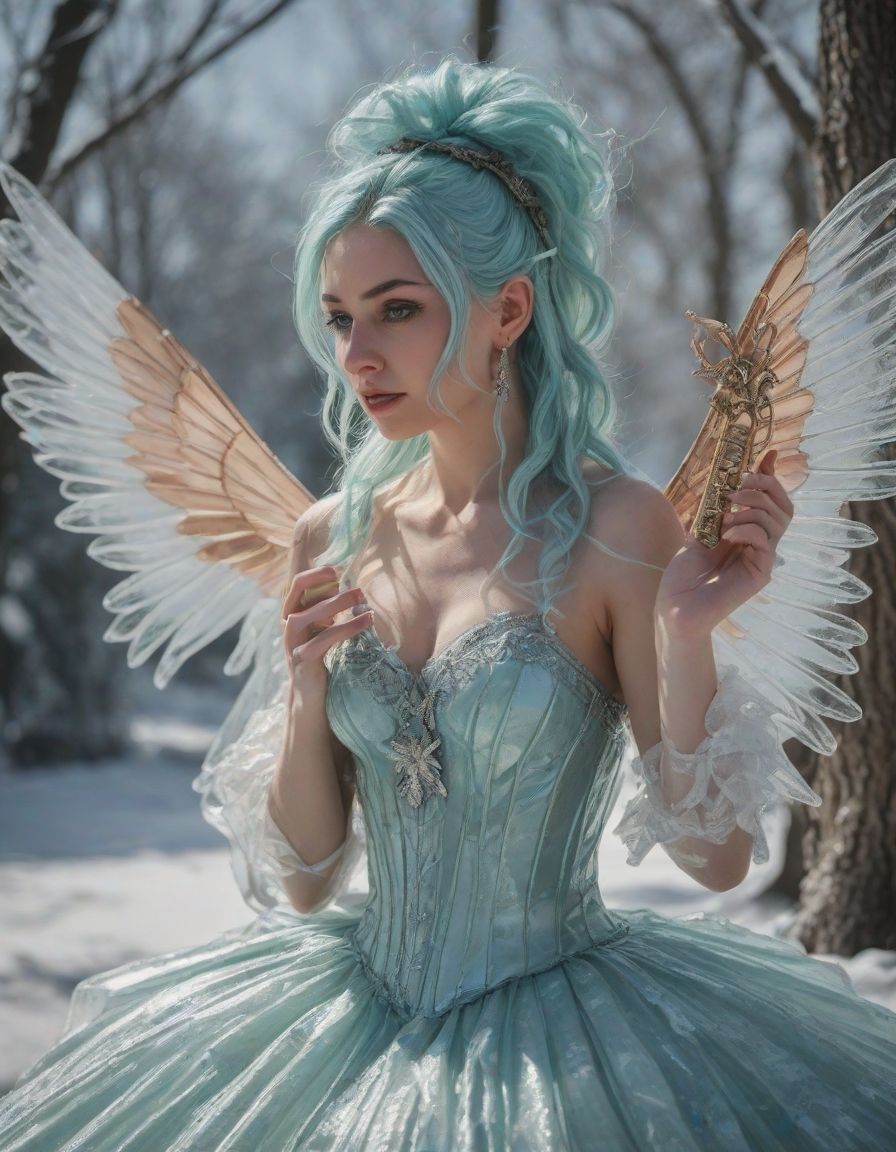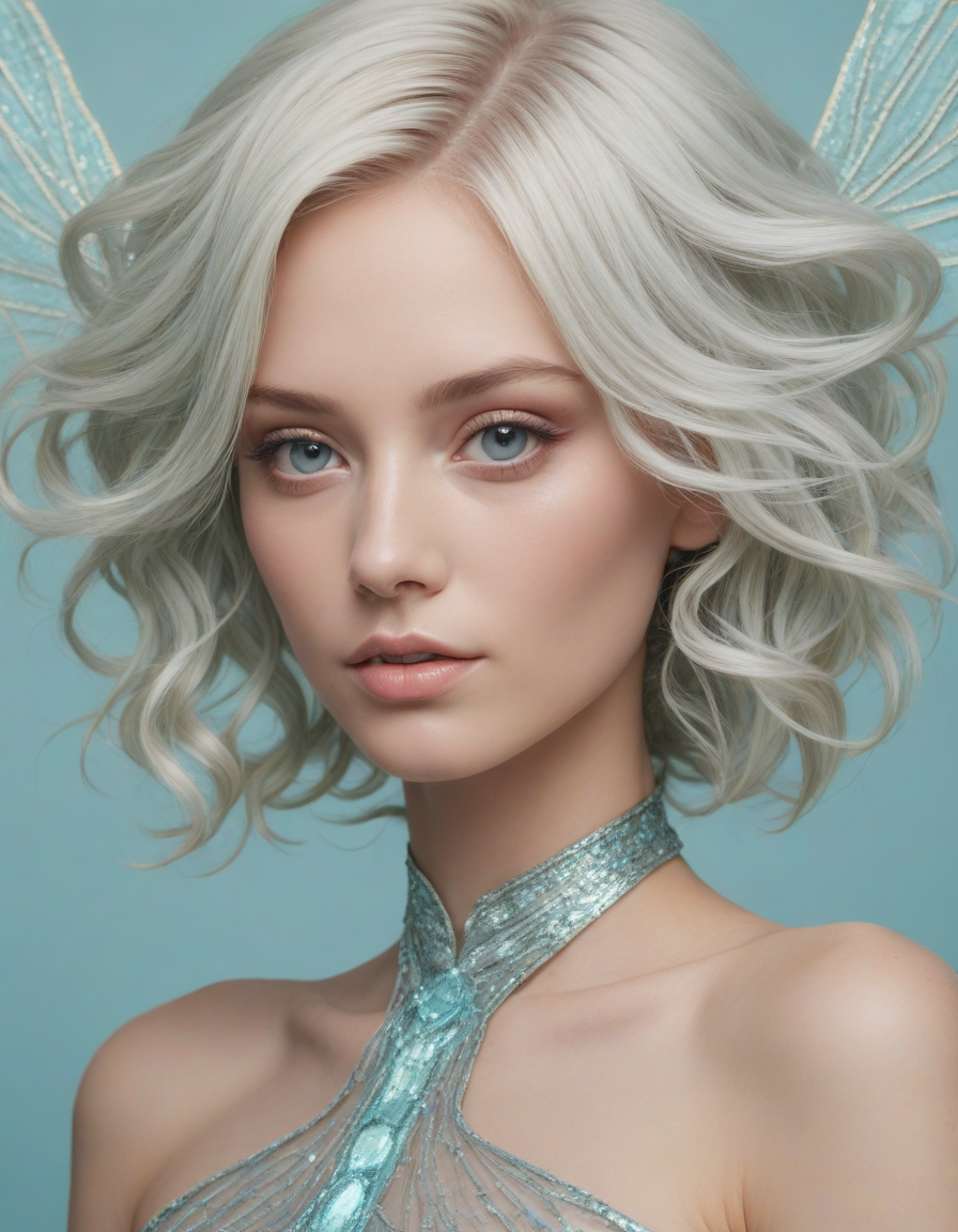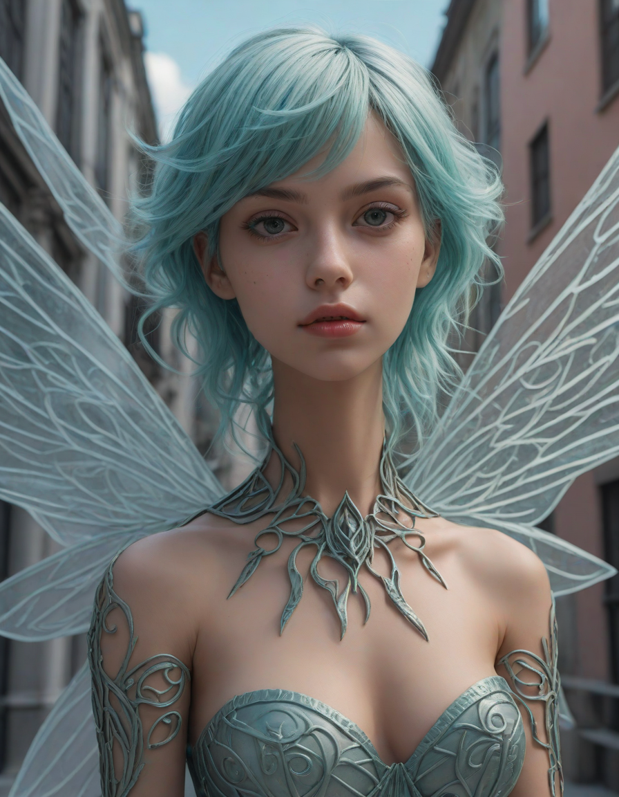 a radiant, aquamarine-haired fairy flitting about on delicate, translucent wings