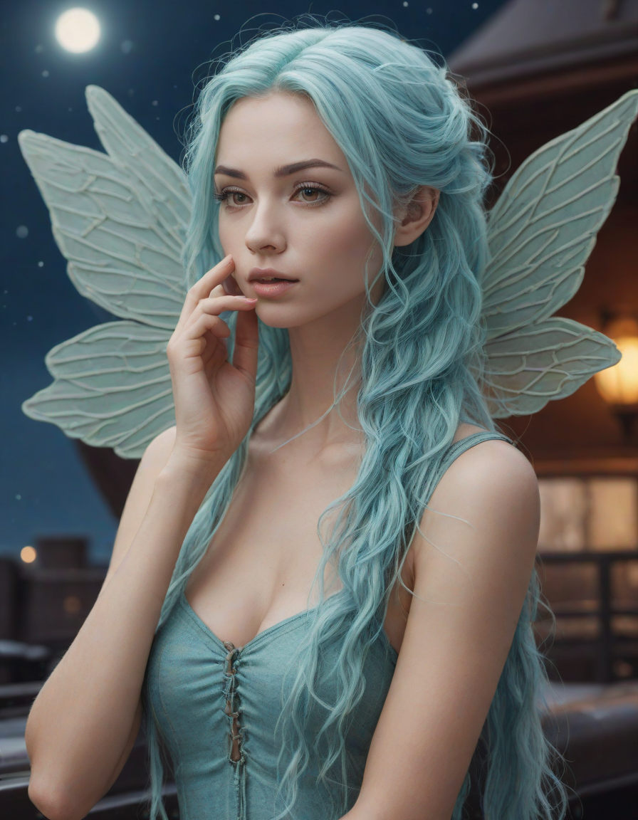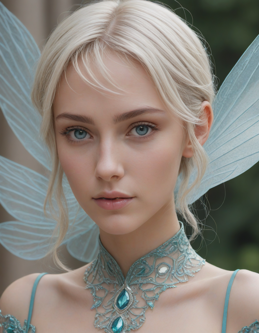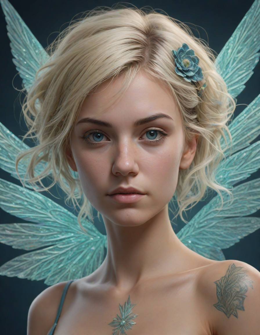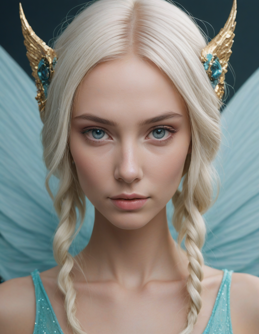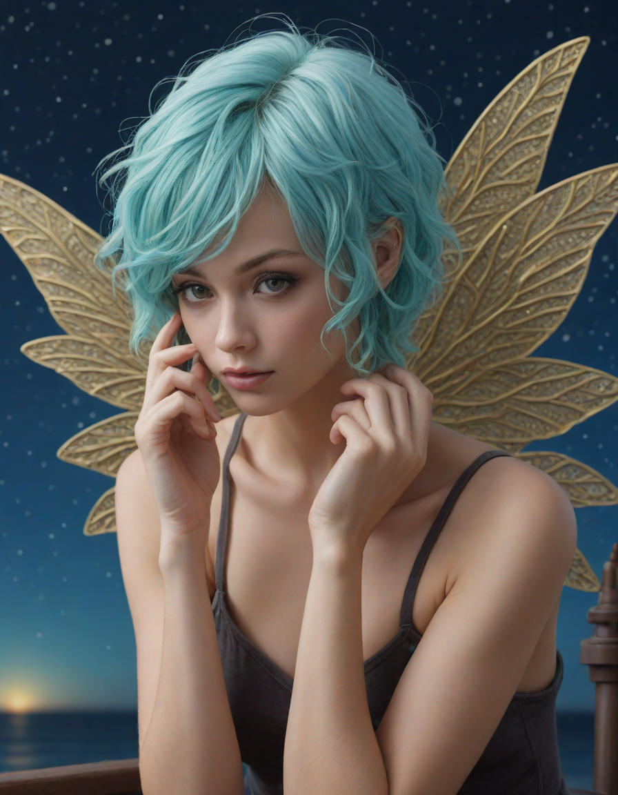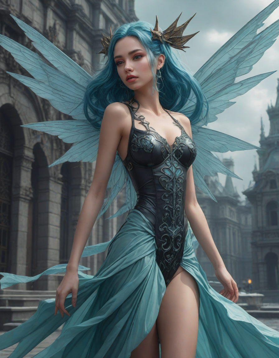 a radiant, aquamarine-haired fairy flitting about on delicate, translucent wings