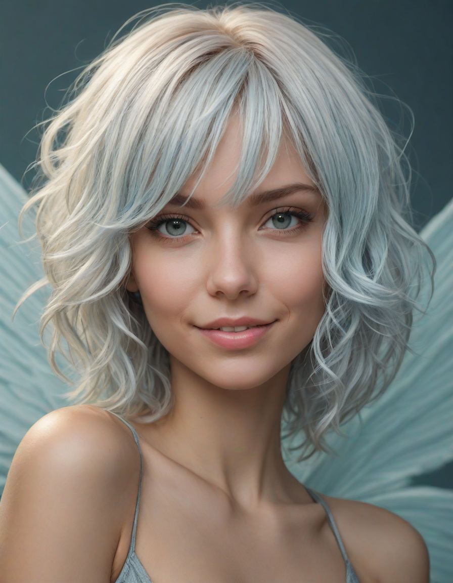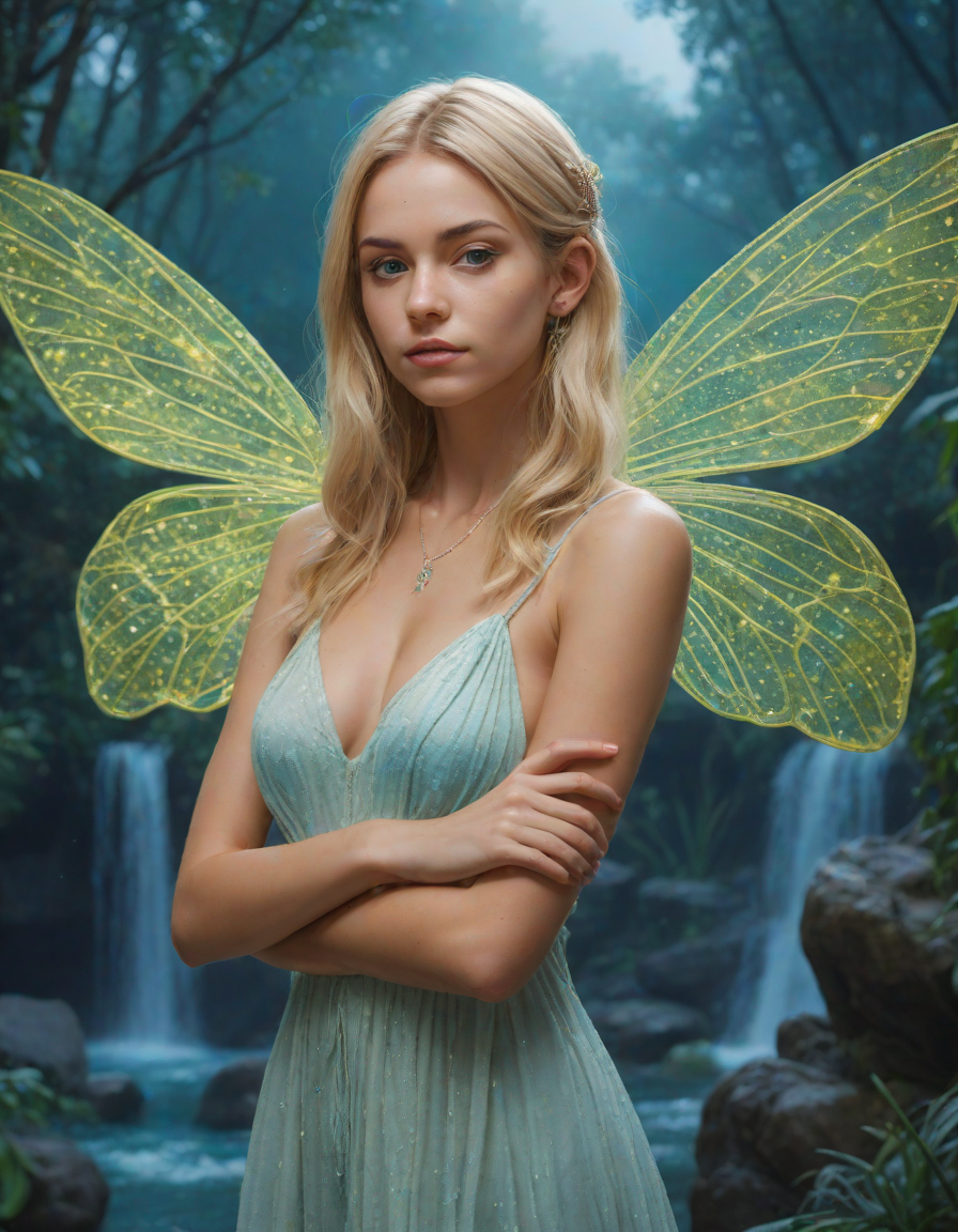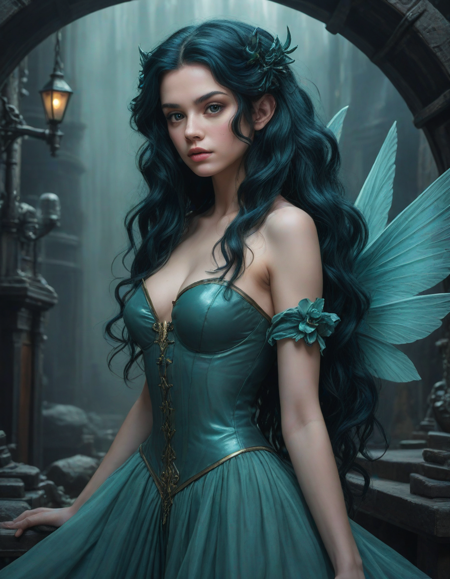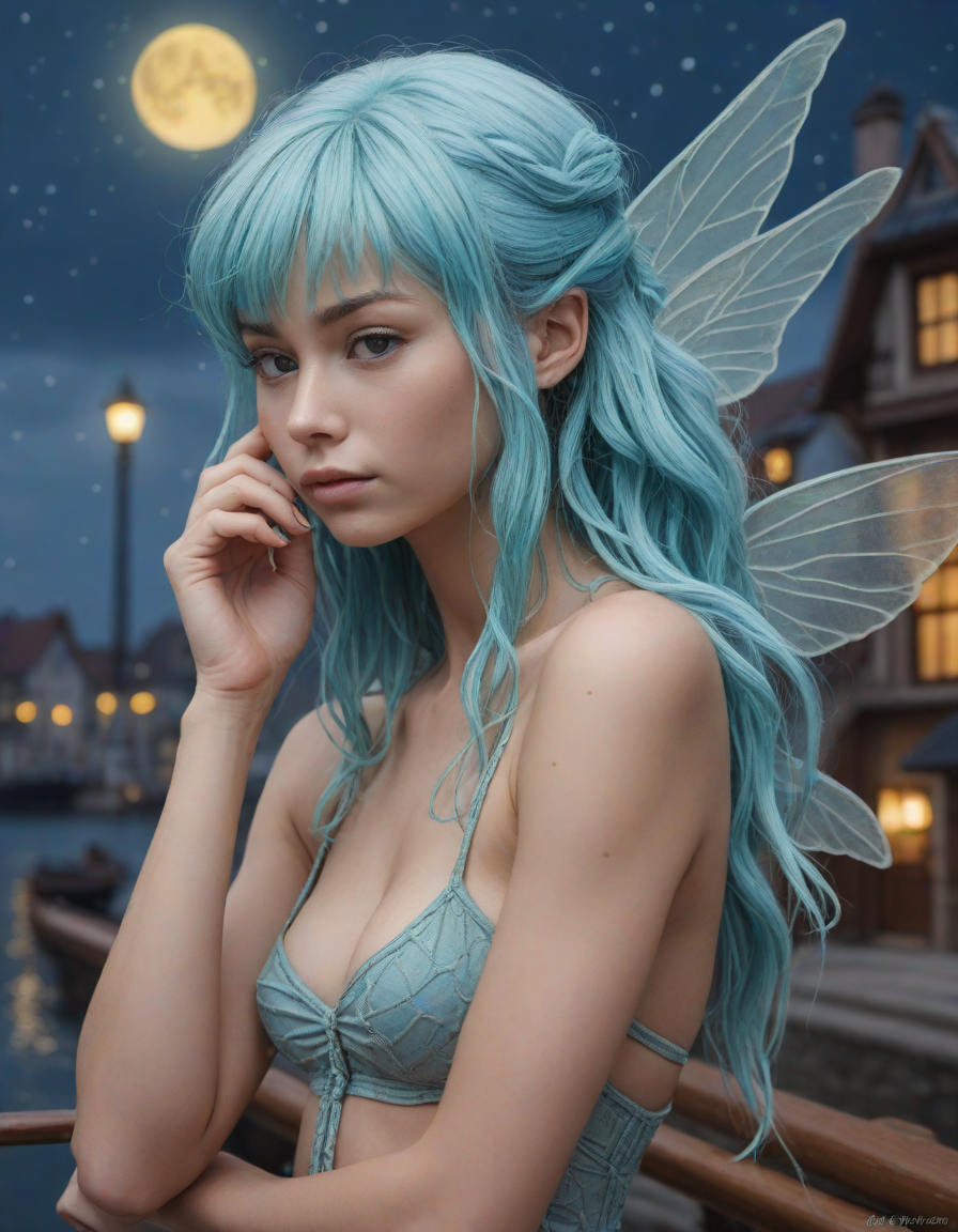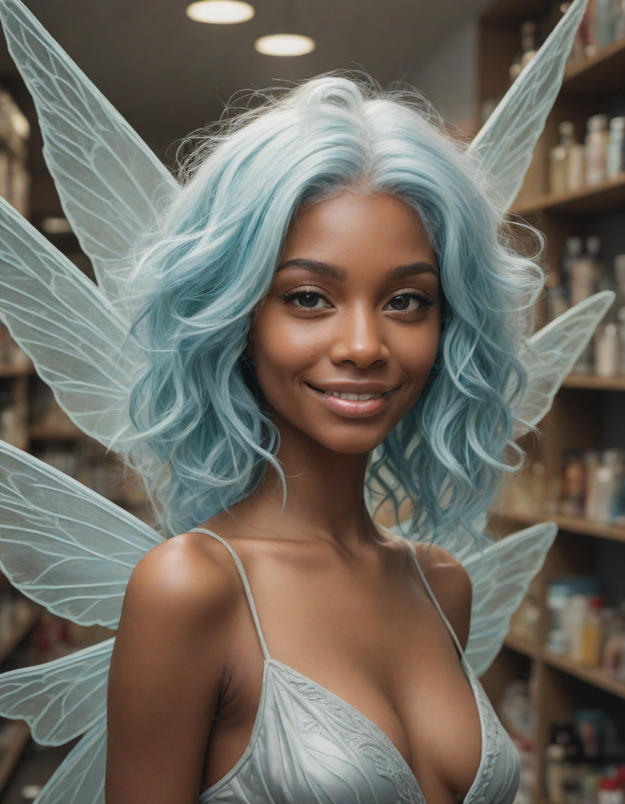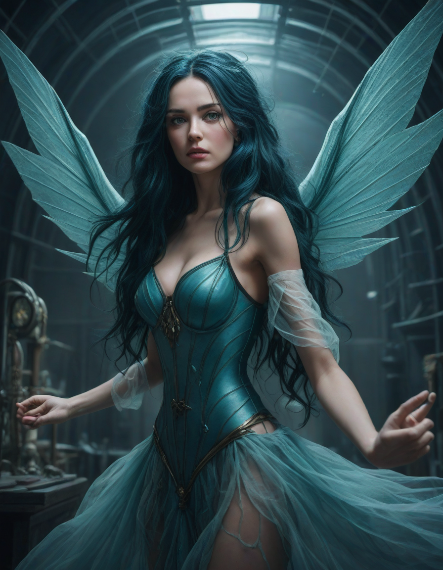 a radiant, aquamarine-haired fairy flitting about on delicate, translucent wings