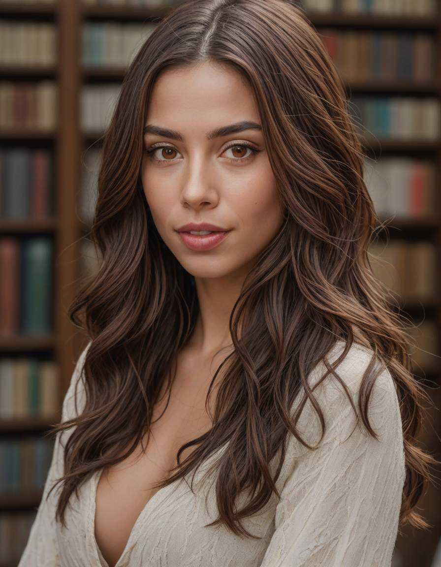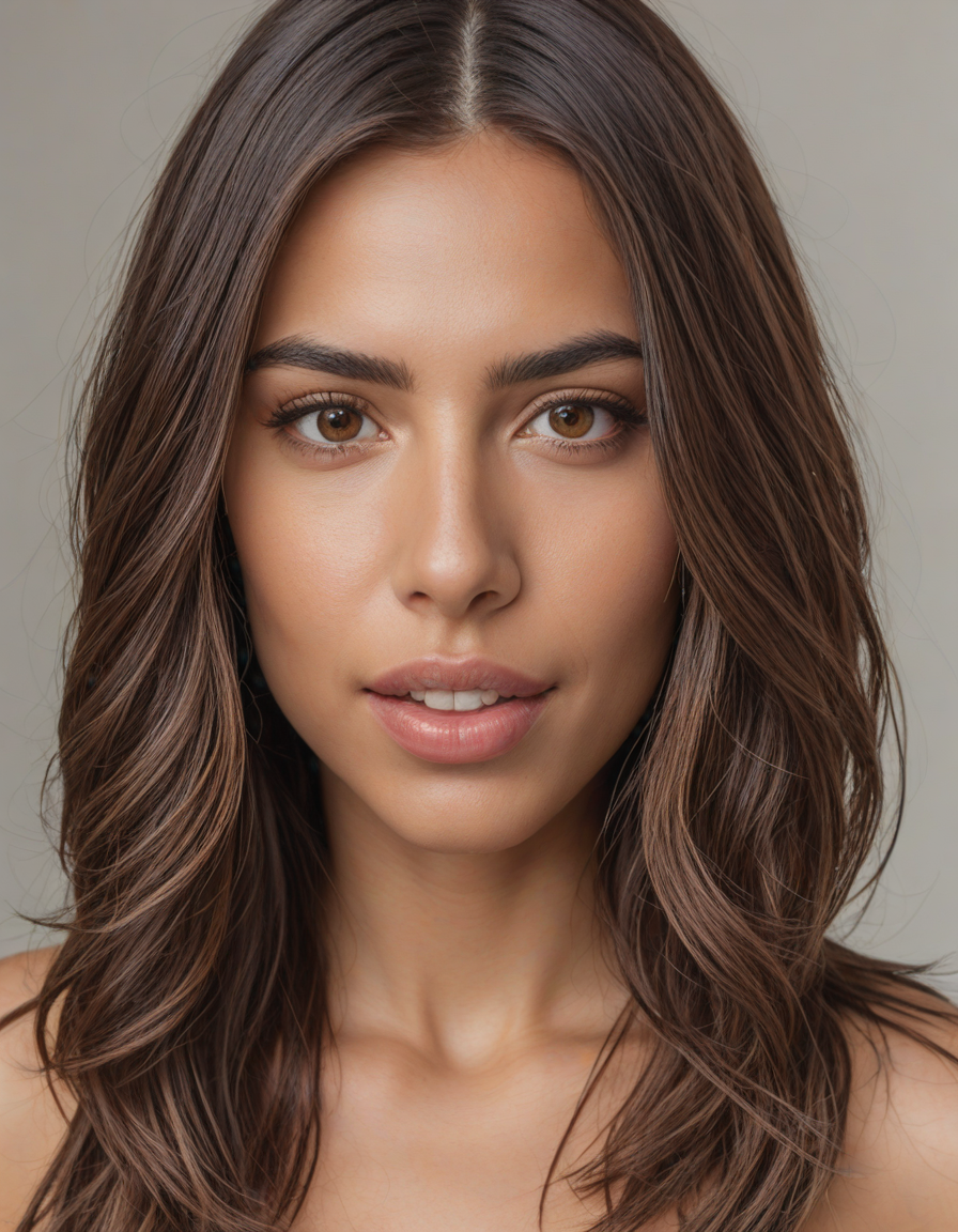 Sofia from Portugal, medium shoulder-length chocolate hair parted in the center with red streaks, brown eyes, curved nose, thick lips, dimples, perfect teeth, teasing look