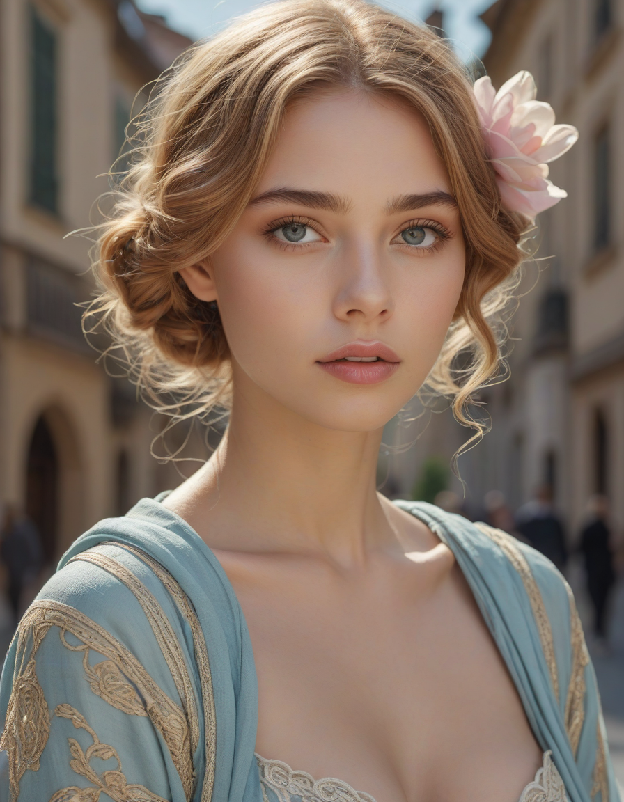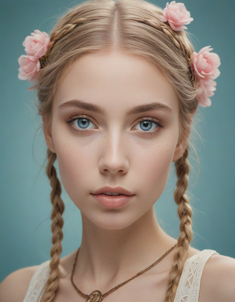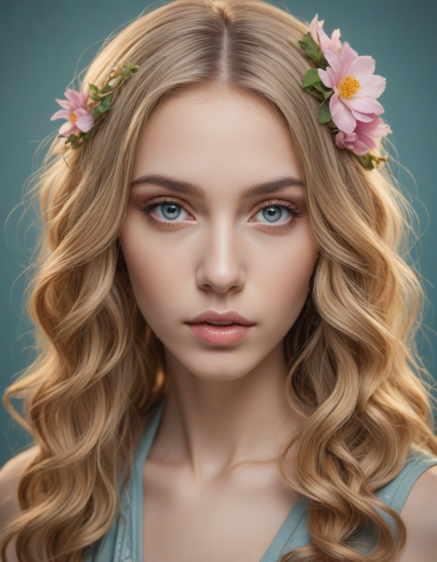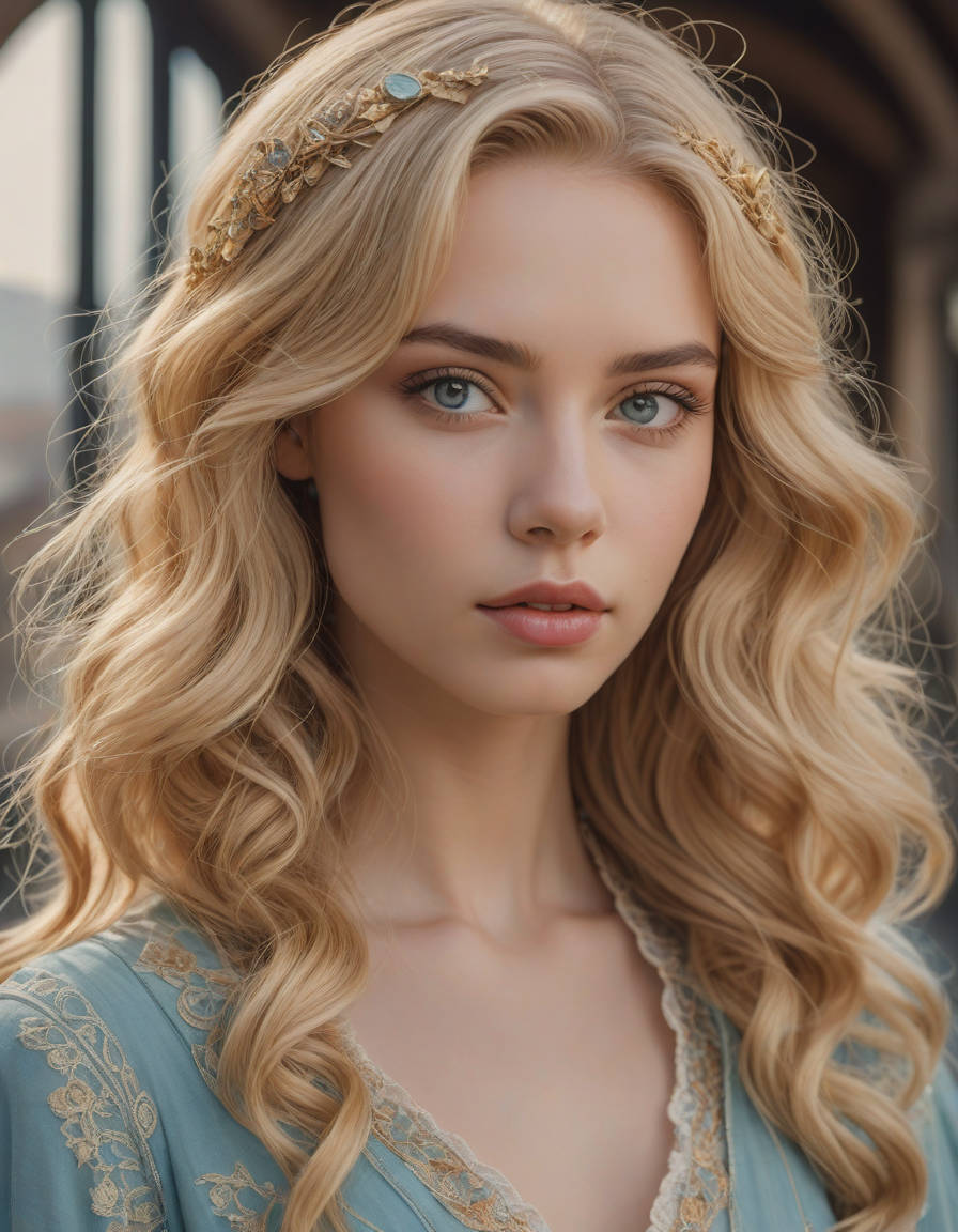 art nouveau style, highly detailed texture, surreal dreamlike composition, physically impossible elements, oval face shape, almond-shaped eyes, voluminous lashes, slightly arched eyebrows, narrow nasal bridge, rounded nose tip, symmetrical nostrils, full lips, pronounced cupid's bow, slightly fuller lower lip, defined cheekbones, rounded chin, smooth complexion, softly contoured jawline, balanced facial proportions, symmetrical features, gently curved eyelids, soft brow ridge, harmonious cheek to jawline transition, subtle philtrum, delicate ear lobes, straight blonde hair, clear skin, hooded eyelids, light pink lip color, slightly pouty expression, casual pose with hand on face, slight head tilt, indoor lighting, Light blue irises, Medium-thickness eyebrows, Softly angled eyebrows, A hint of freckles across the nose and cheeks, Natural makeup, Gentle frown lines between the eyebrows, Soft nasolabial folds, Smooth forehead, Subtle dimple on the chin, Clear facial contour without distinct shadows, Even skin tone with a hint of natural pink undertones, Slightly rosy cheeks, Tapered jawline, Fine hair texture with gentle waves, Youthful appearance with soft facial features