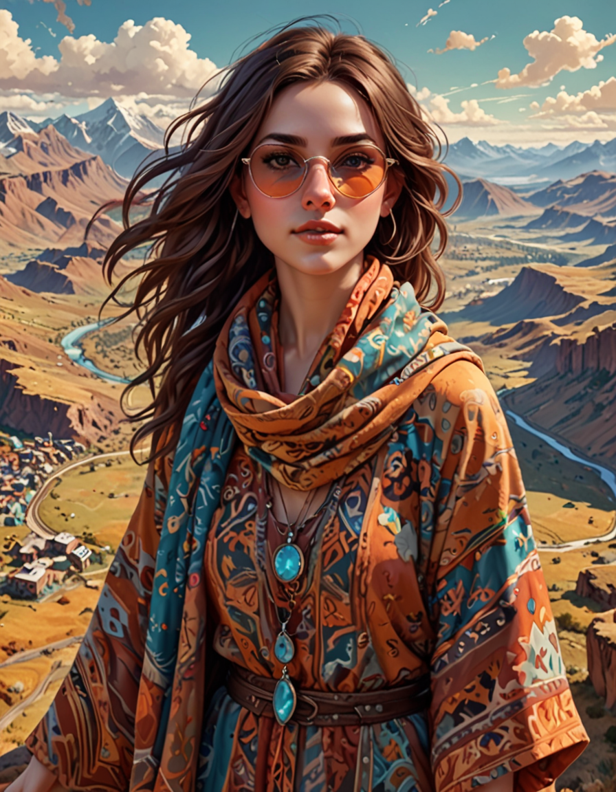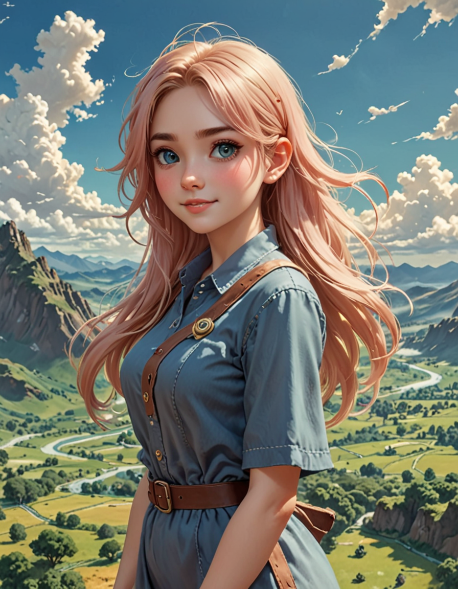 closeup view, limited background, shallow depth of field→bird's eye view, tiny detailed landscape, vast expansive vista
