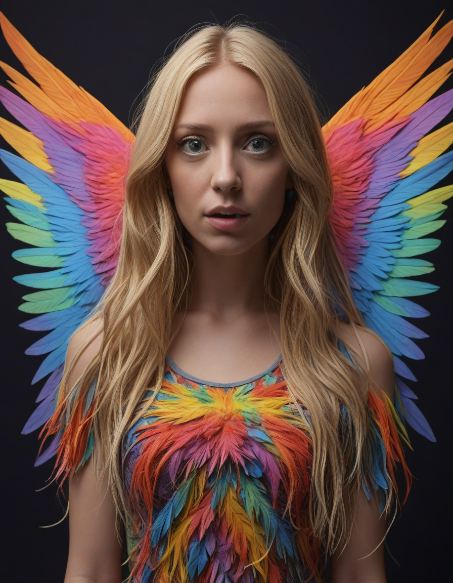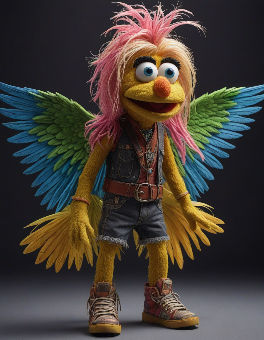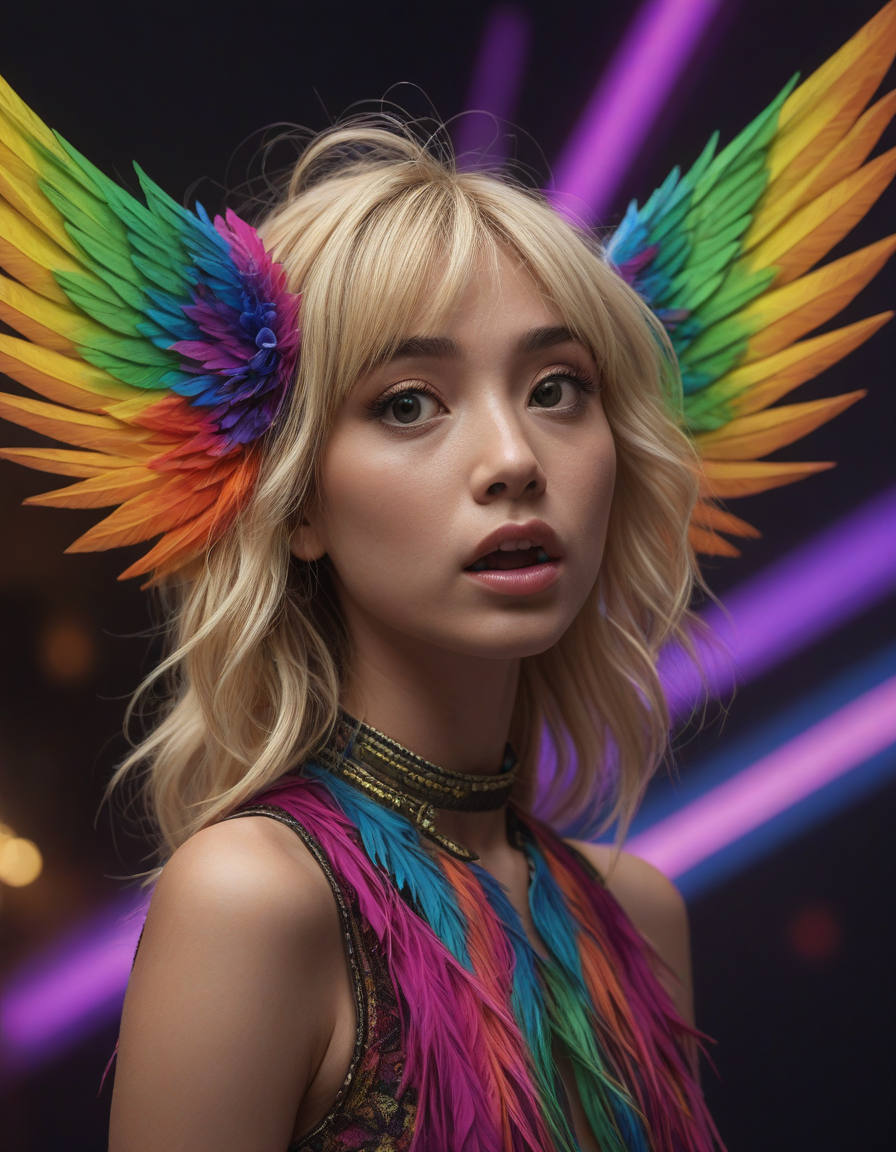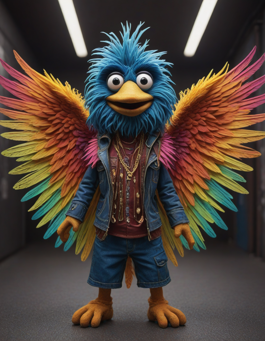 muppet, Low-Key Lighting, Rainbow-colored feathered wings, Stunningly Beautiful, A figure etched in neon lights, appalled, skater punk, eyes, surprised