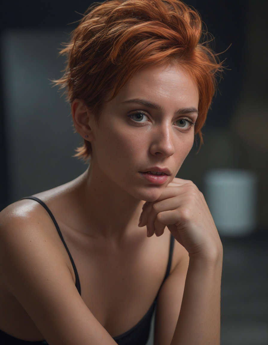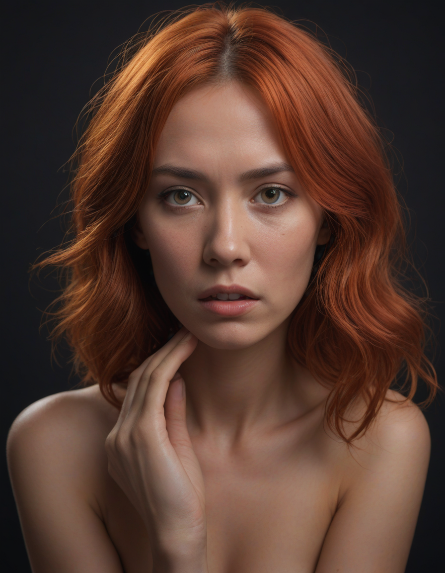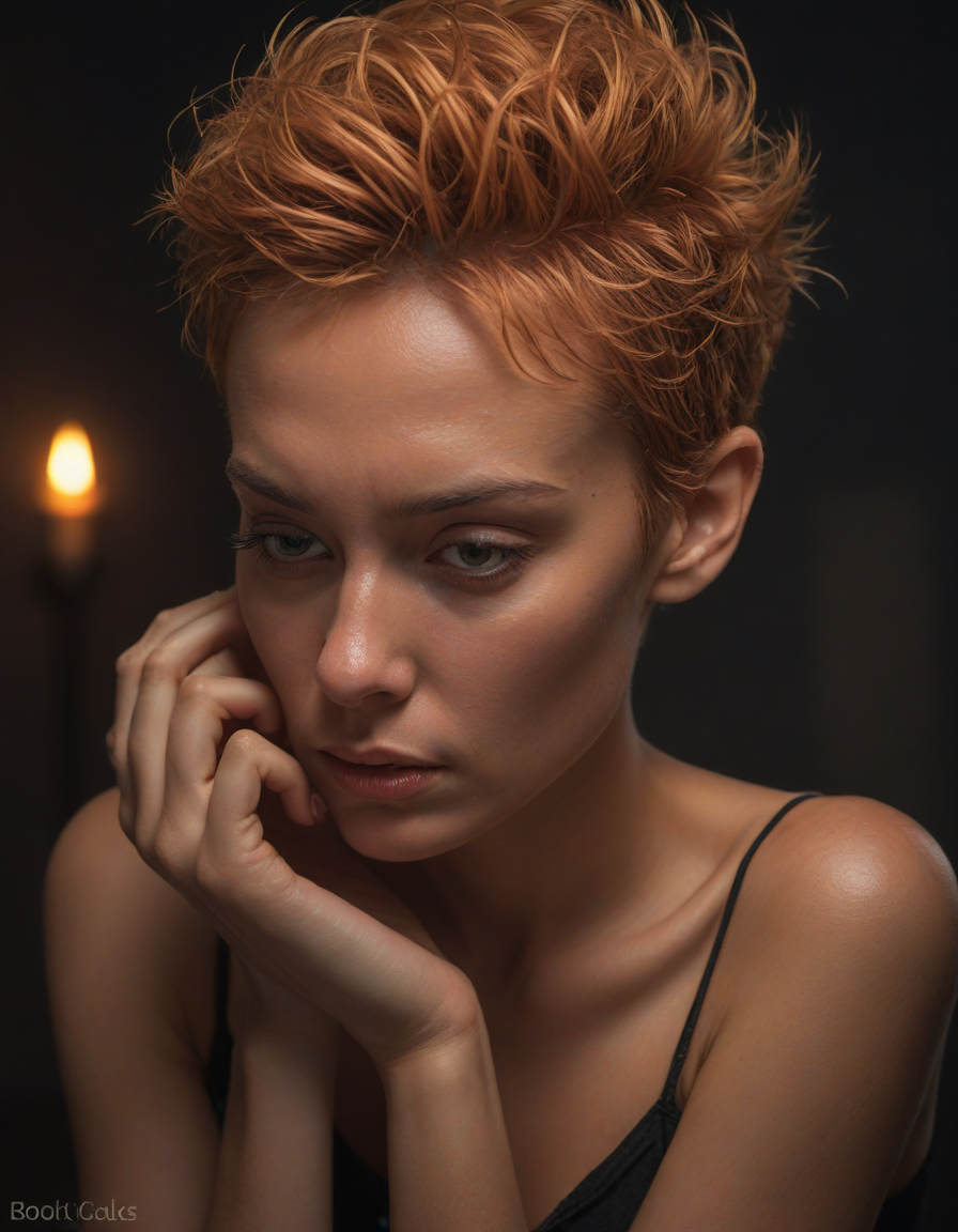 nice hands, slumped in despair, glowing like an ember, Sculpted cheekbones, Focused lights, afraid