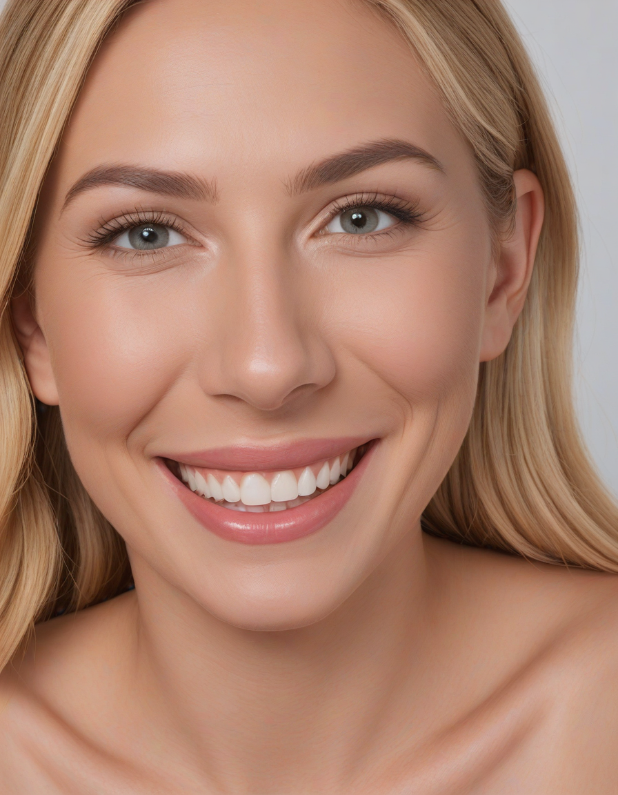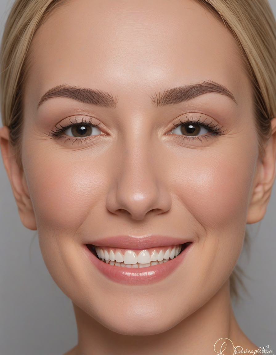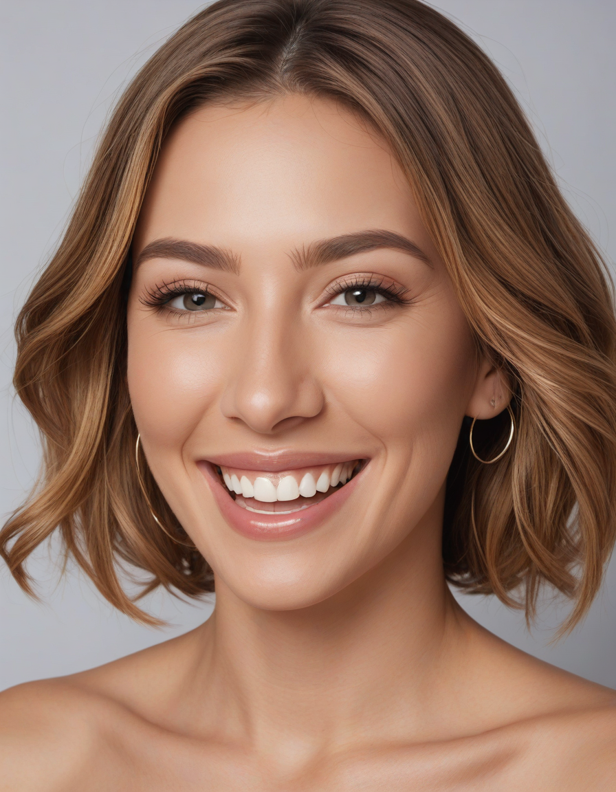 laughing, Lip fillers, thick full lips, enhanced lip volume, accented cupid's bow, Rhinoplasty, refined nose shape, straightened nasal profile, facial symmetry, Botox injections, smoothed facial lines, reduced wrinkles, youthful appearance, Cheek fillers, pronounced cheekbones, sculpted contours, lifted cheeks, brightened eyes, reduced under-eye bags, rejuvenated area, Liposuction contoured shape, reduced excess fat, sculpted physique, Dermal fillers, restored volume, smoothed texture, diminished lines, strengthened definition, balanced proportions, enhanced jawline, Facelift, tightened skin, reduced sagging, improved skin tone, reduced imperfections, enhanced clarity, Blepharoplasty, Reduced puffiness, restored youthful eye contour, Enhanced chin shape, improves facial harmony, strengthened jawline definition, symmetry facial features, golden_ratio
