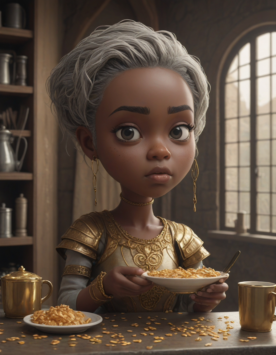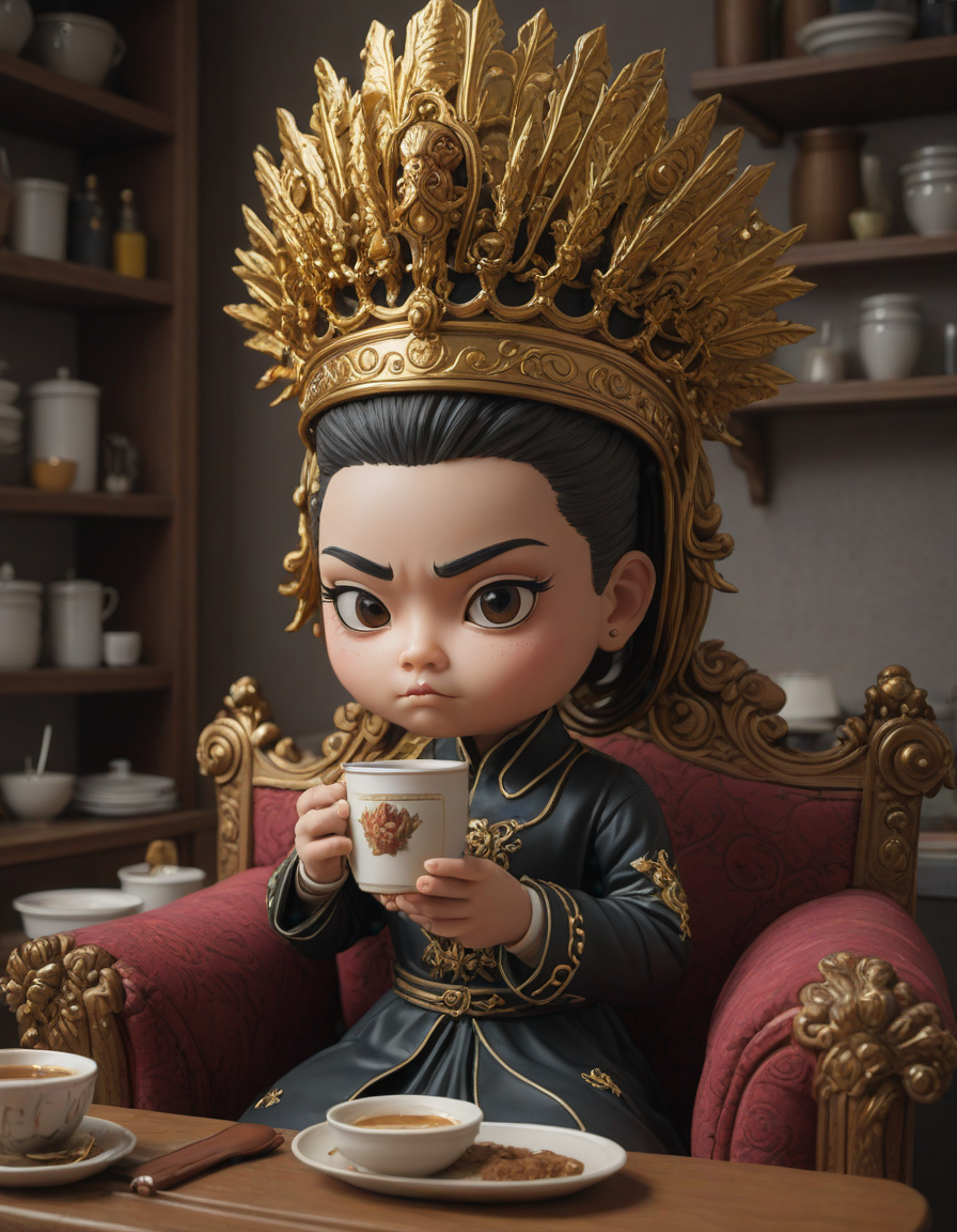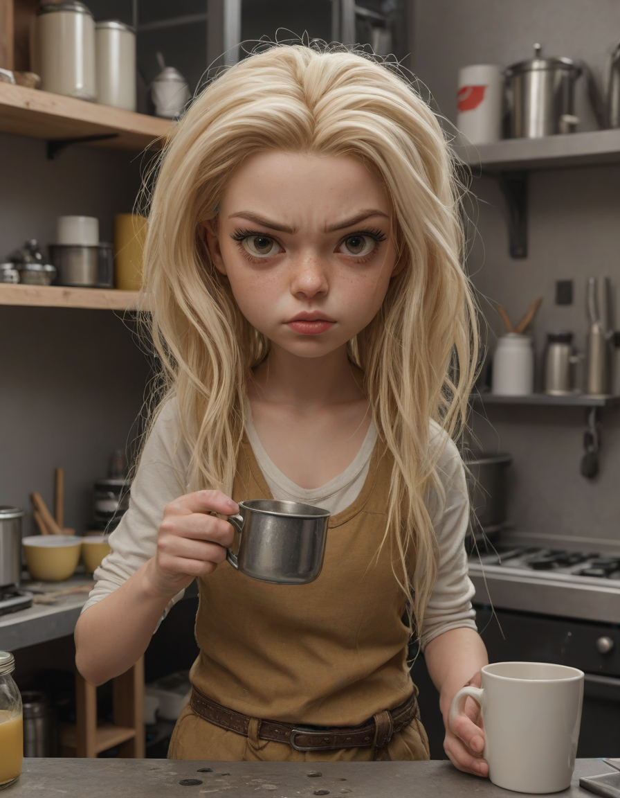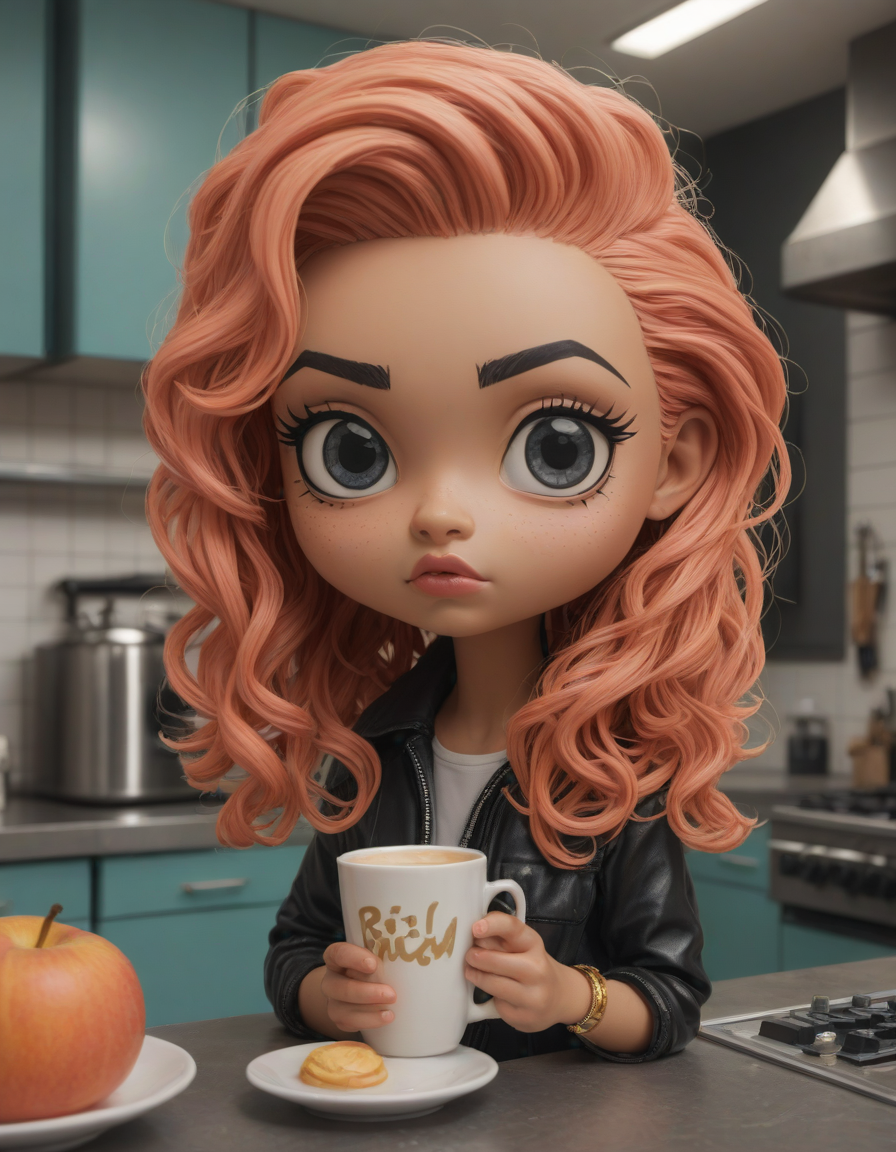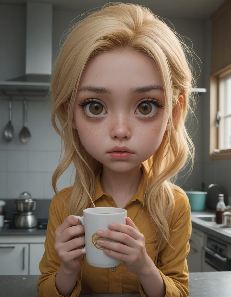 very aesthetic, appalled, the glint of gold, sipping coffee, funko pop big head, big head mode, gigantic head, small body, Glistening grunge, in a kitchen, angry