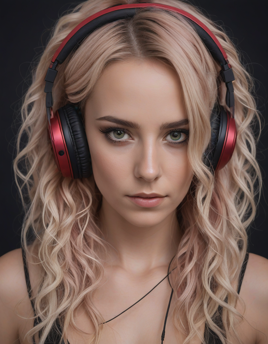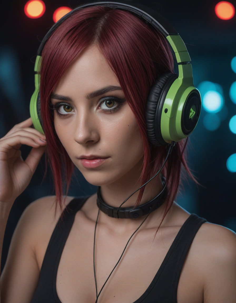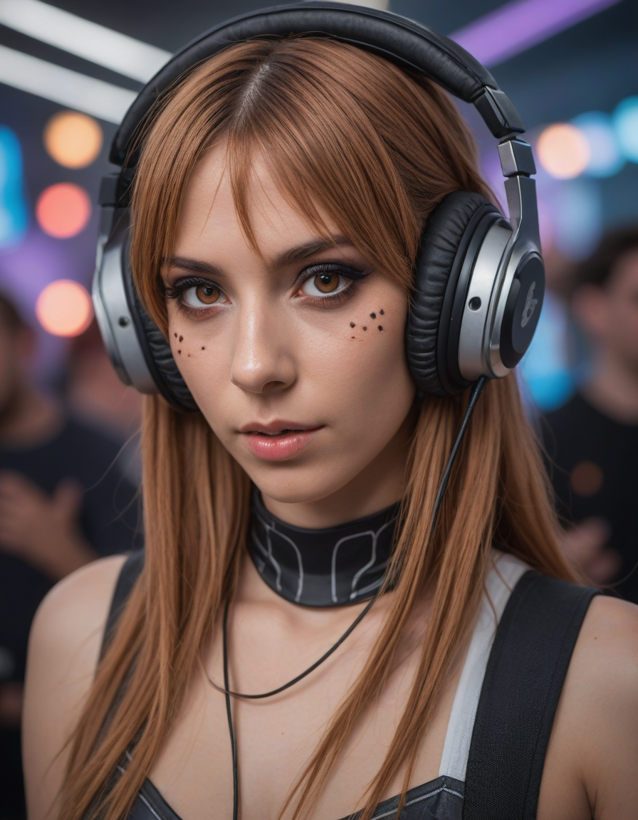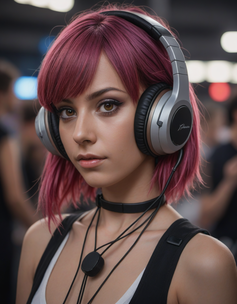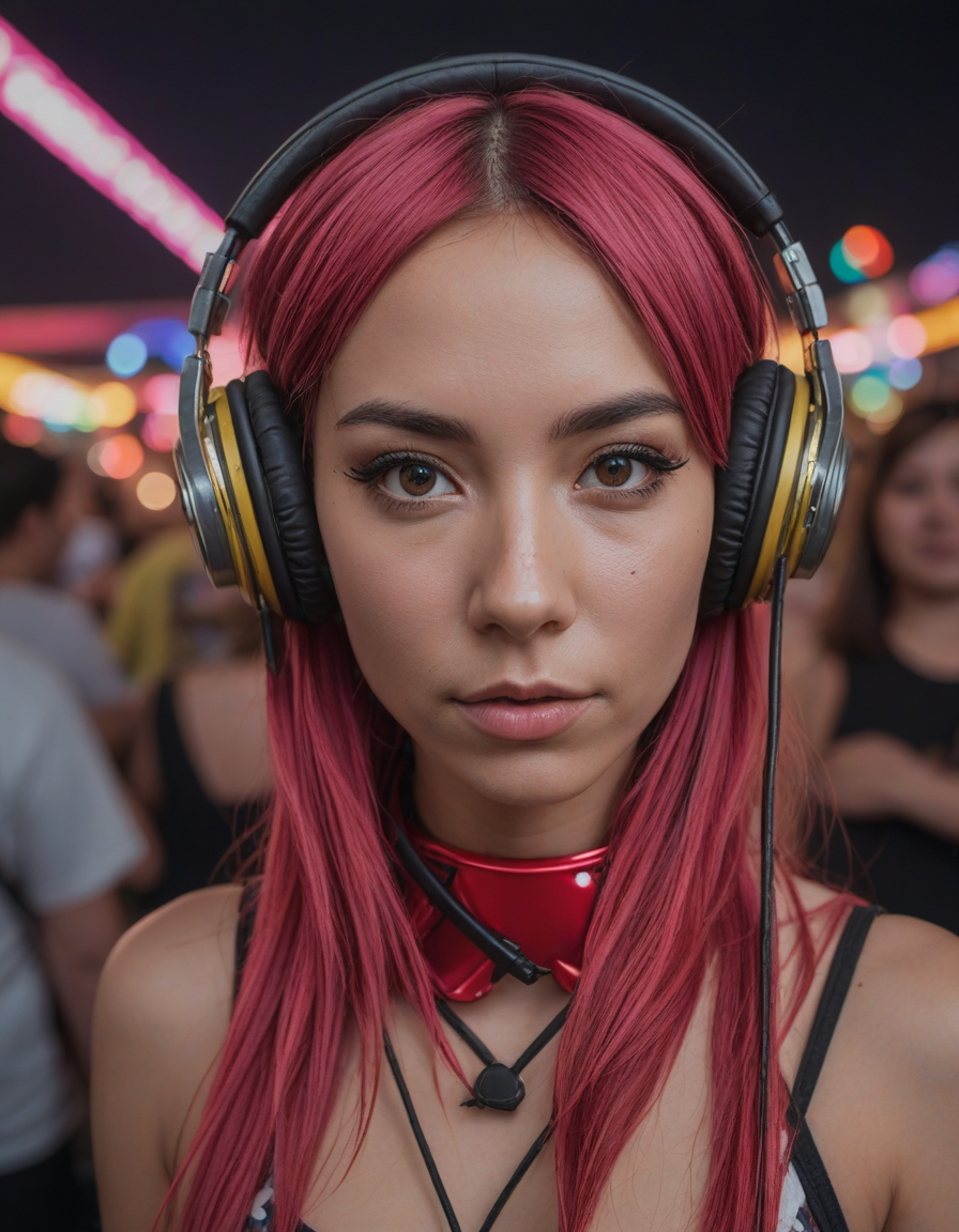 Enigmatic, crimson-flecked eyes, person wearing headphones, at a rave, wearing cosplay outfit