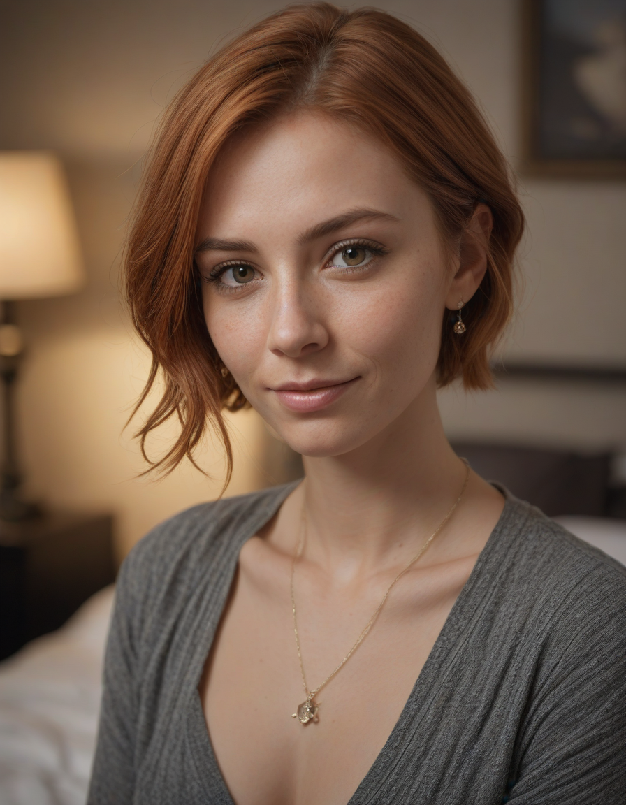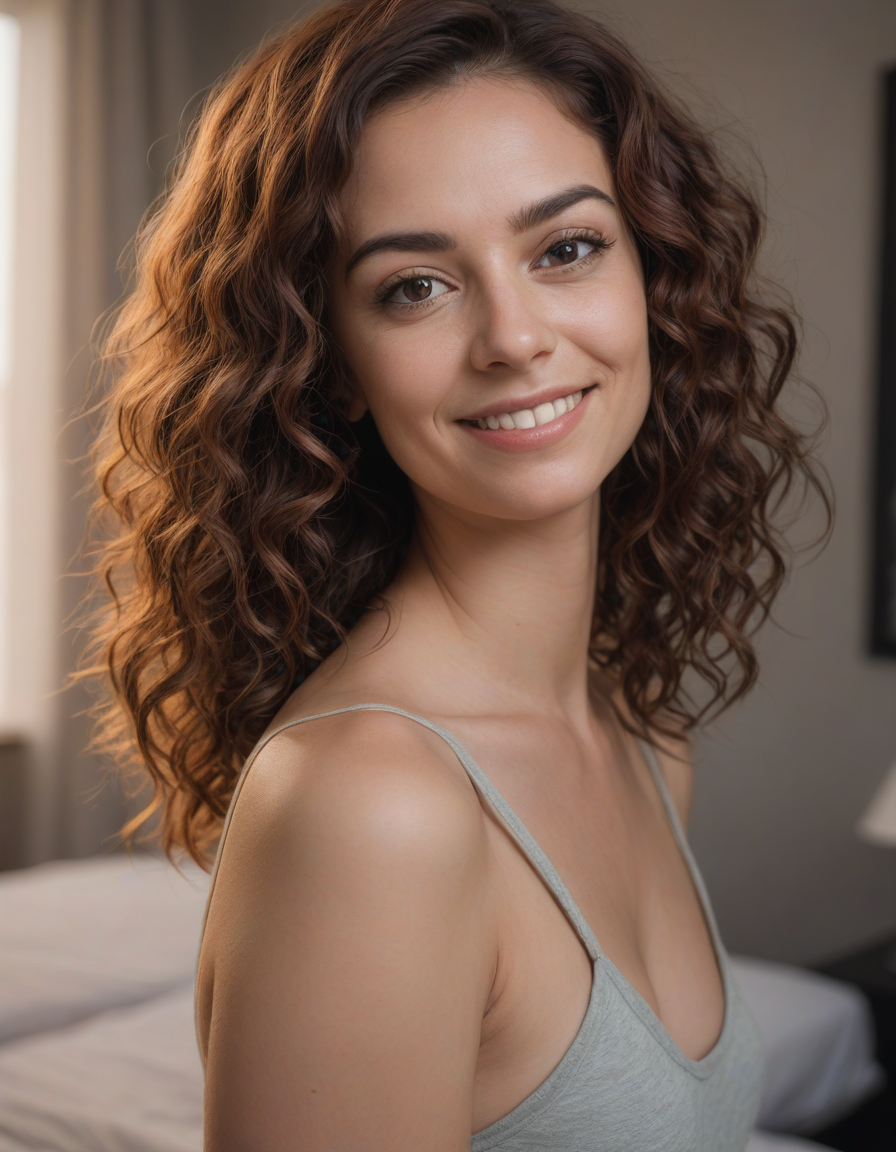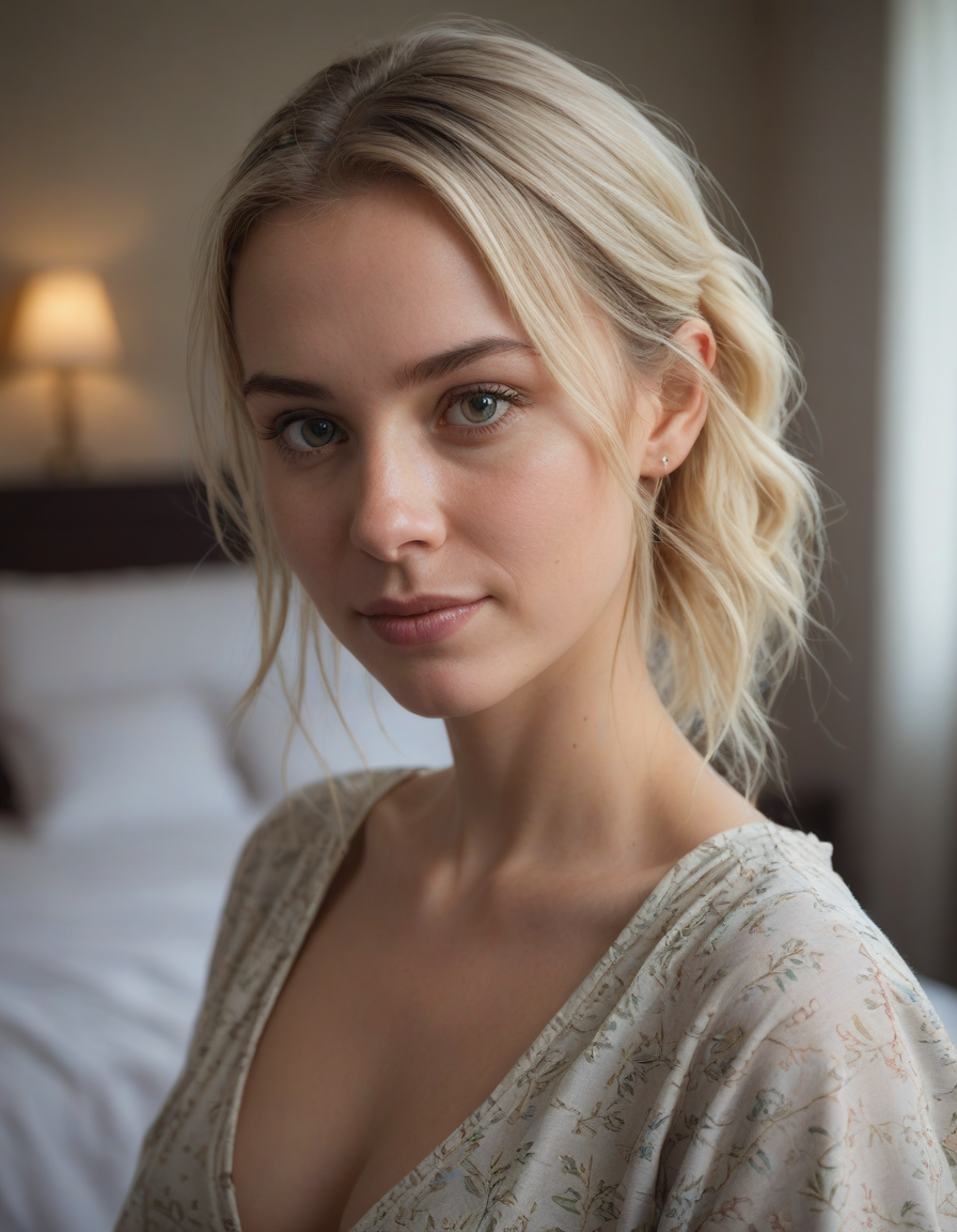 in love, a sharp, first portrait with bokeh effect, in a bedroom, Eyes sparkling with mischief, acting smug