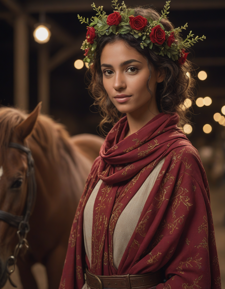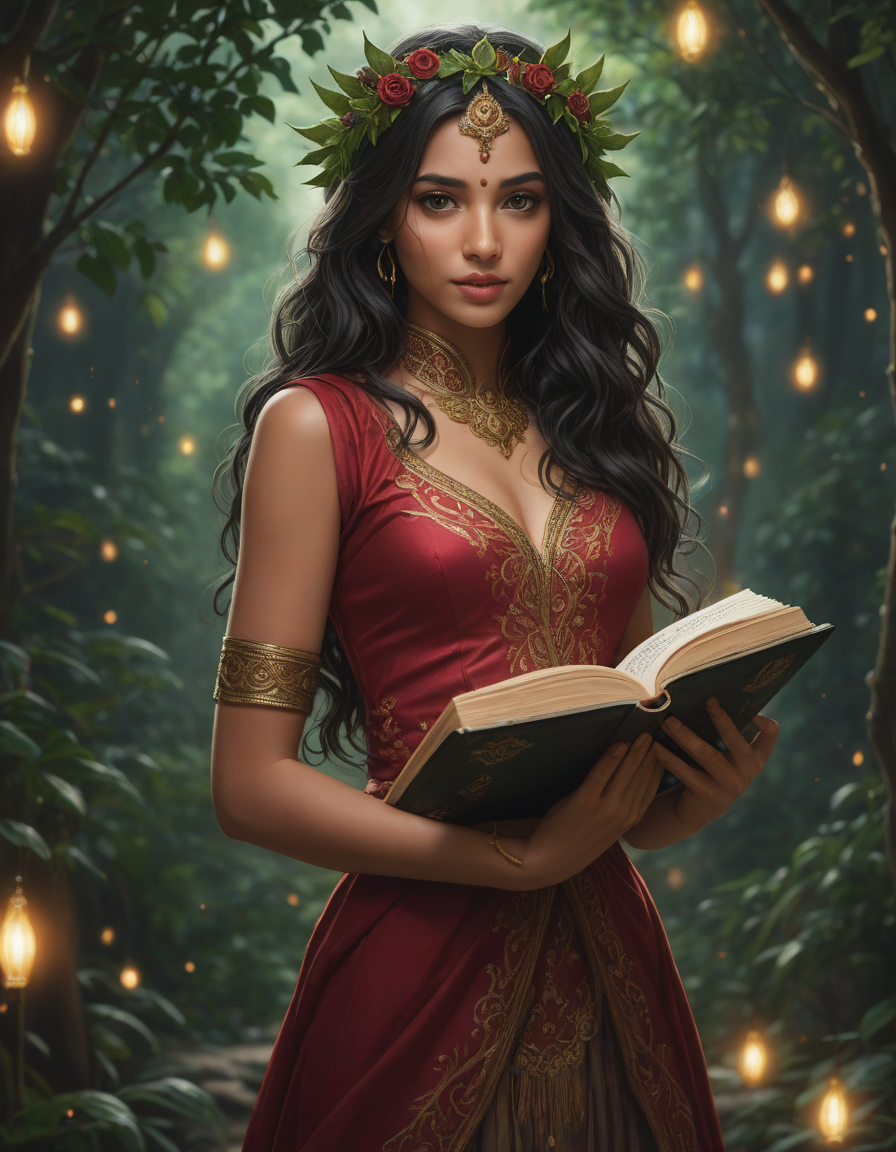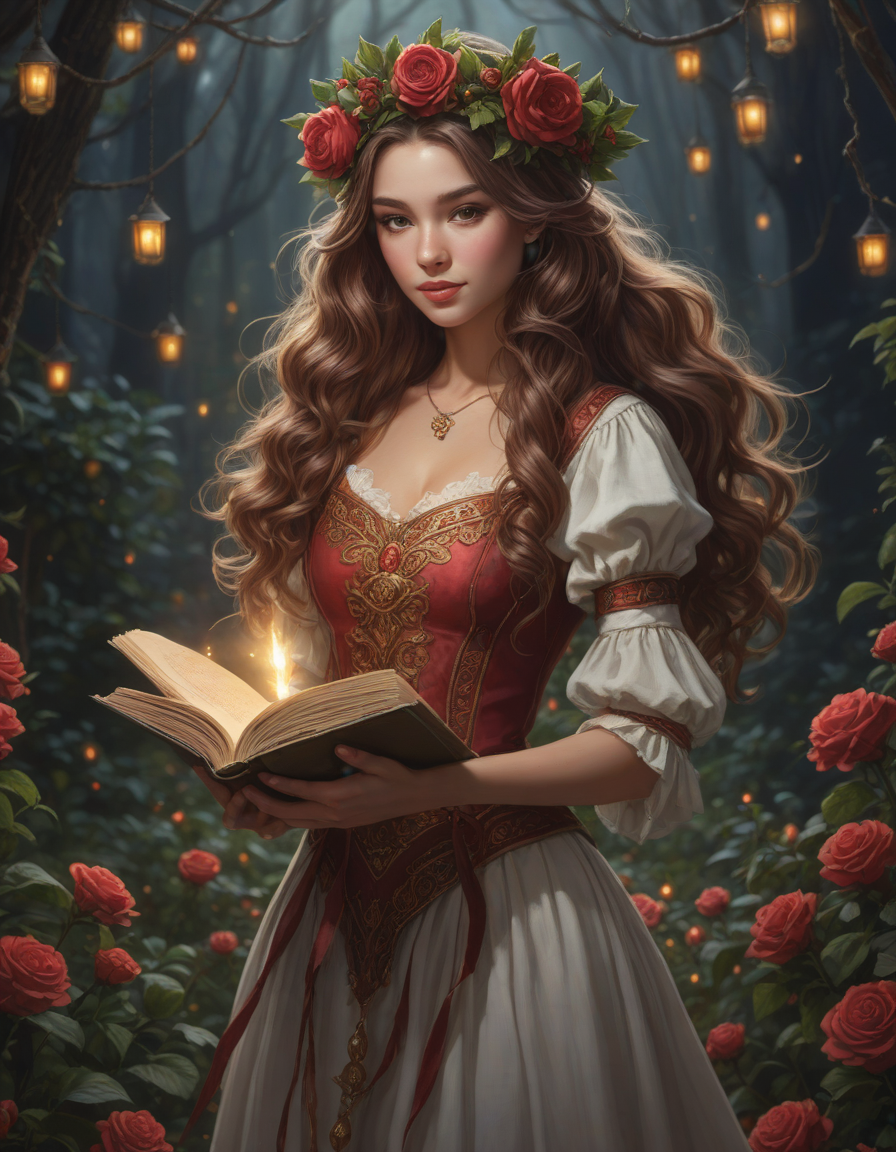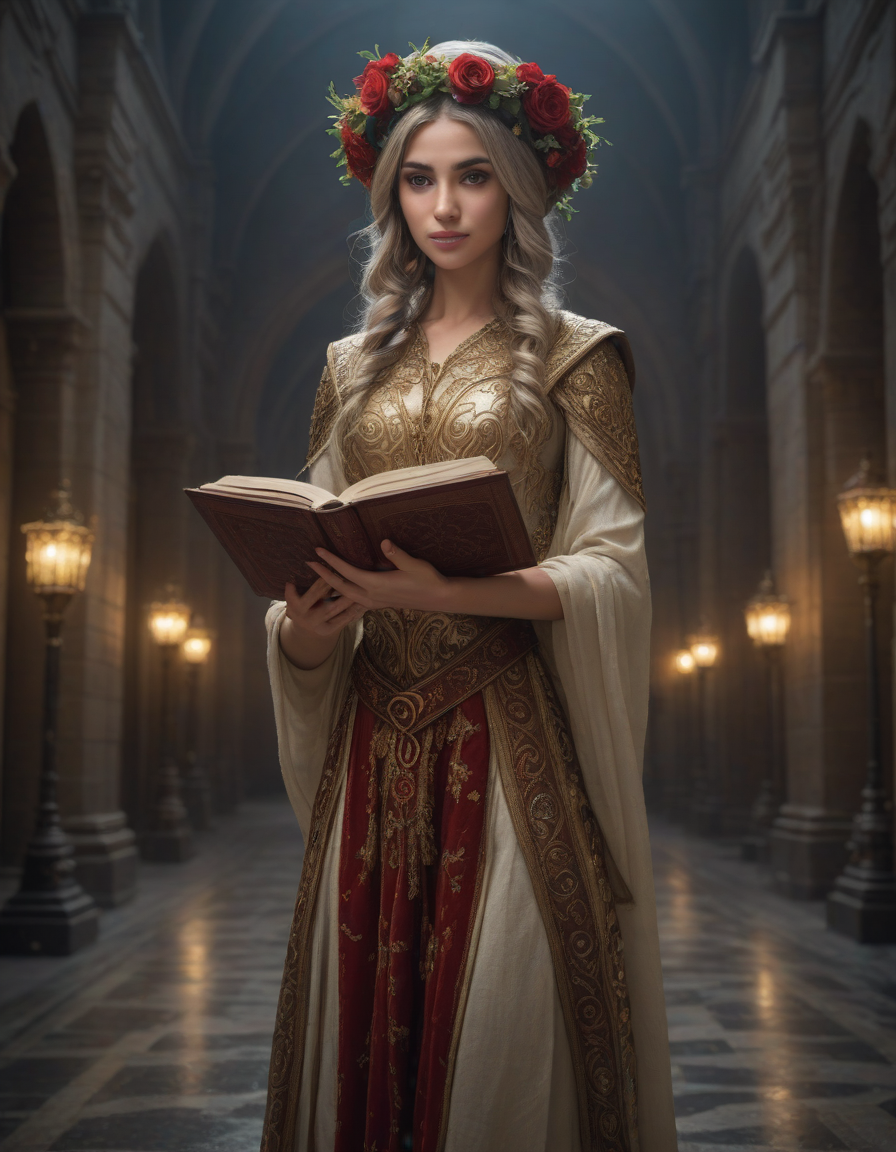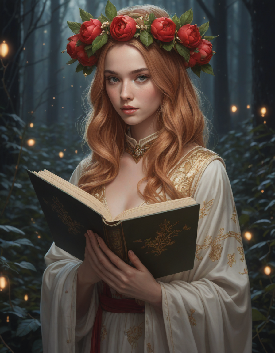 Surrounded by gleaming lights, carrying a large tome, Crimson floral crown