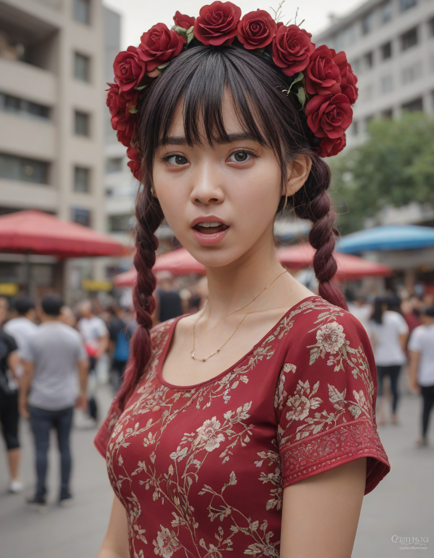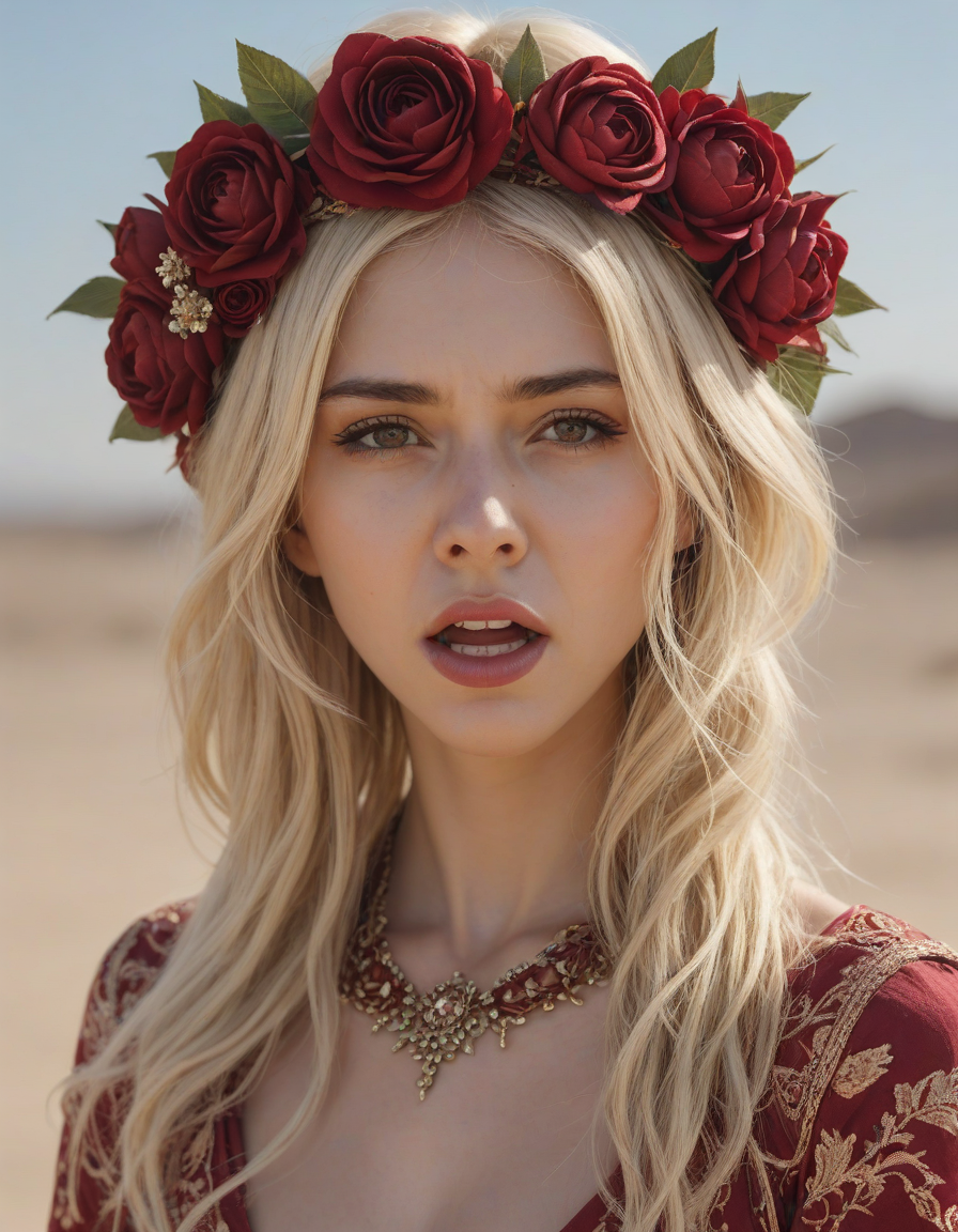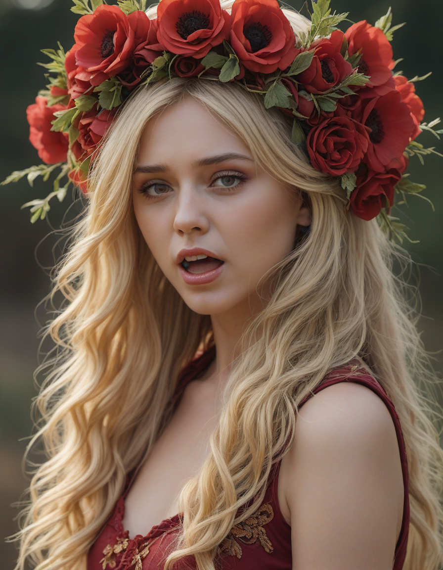 trying to scream but nothing came out, extremely detailed, Crimson floral crown