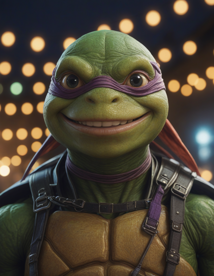 ninja turtle, eyes fixated in horror, Surrounded by gleaming lights, smiling