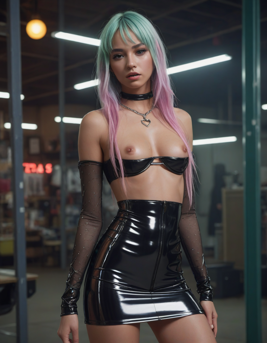 This visualization retains the essence of our previous description, now enhanced by a pose that speaks volumes of her confidence and the vibrant spirit of the e-girl aesthetic. It captures not just the photorealistic image of a young woman in the throes of digital age culture but also the bold statement of identity and self-expression that defines her at this significant moment in her life., Visualize a photorealistic portrayal of an 18-year-old high school senior girl, epitomizing the e-girl aesthetic with a blend of internet culture's vibrancy and personal audacity. Clad in an oversized striped shirt under a black graphic t-shirt dress, her style is a testament to e-girl fashion's layered intricacy, complemented by fishnet tights and chunky boots. Her makeup features dramatic winged eyeliner, neon eyeshadow, and dark lipstick, with blush bringing her face to life. Accessories like silver chains and a heart pendant choker, along with pastel or neon hair streaks, enhance her playful rebellion. Standing hands-on-hips, she exudes confidence and individuality against a backdrop suggestive of e-girl life, with neon signs and string lights. This scene captures her bold identity and expressive spirit at this pivotal moment., excessive cleavage, low neckline, revealing chest, revealing cleavage, cleavage-baring, revealing, excessively revealing, very revealing, lowcut, lowrise, , provocative clothing, slutty clothing, skimpy clothing, revealing clothing, seductive clothing, coquettish clothing, coquettish, seductive, taboo, sheer clothing,