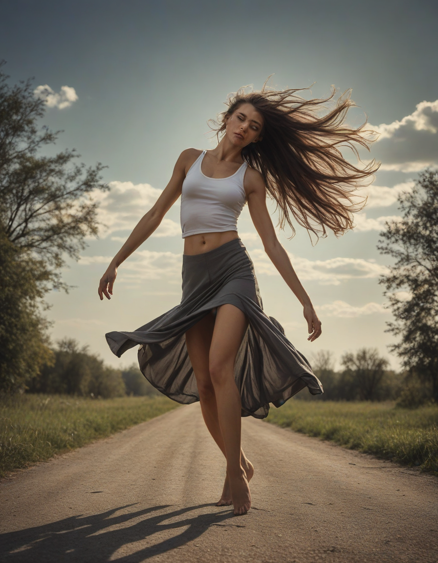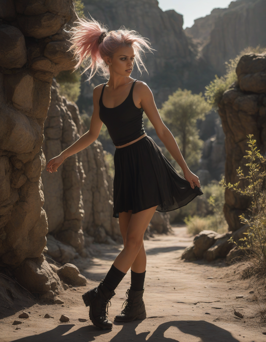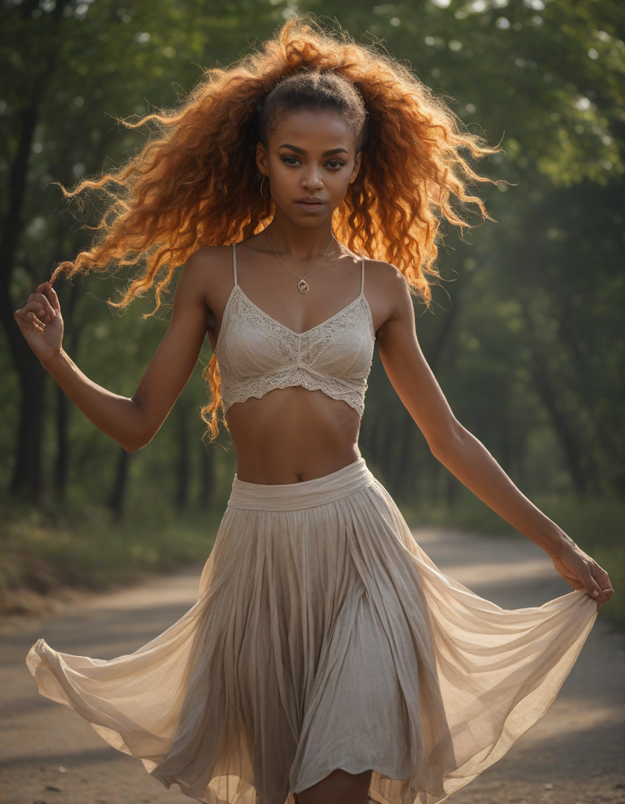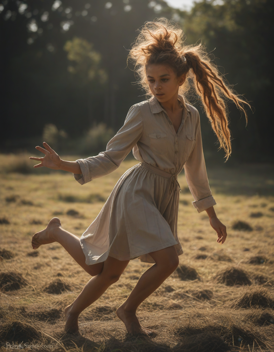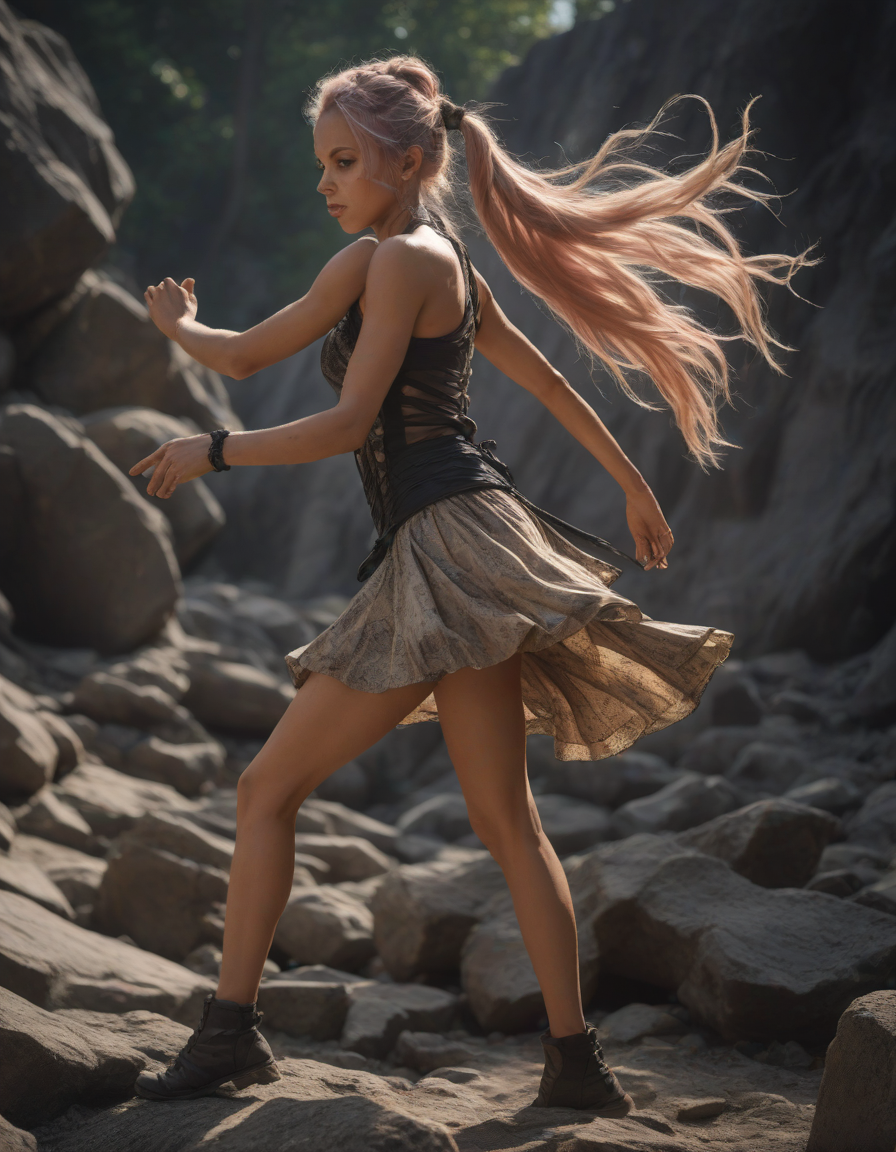 pigtails, shadows, rockstar with wild hair, Shame, Nature, Swift, agile movements of a dancer in perfect harmony