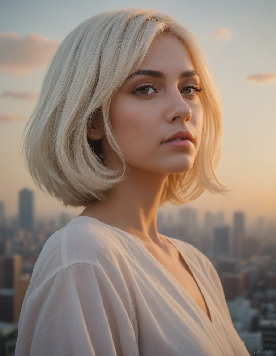 Bliss, preoccupied, Yearning in gaze, tangerine skyline