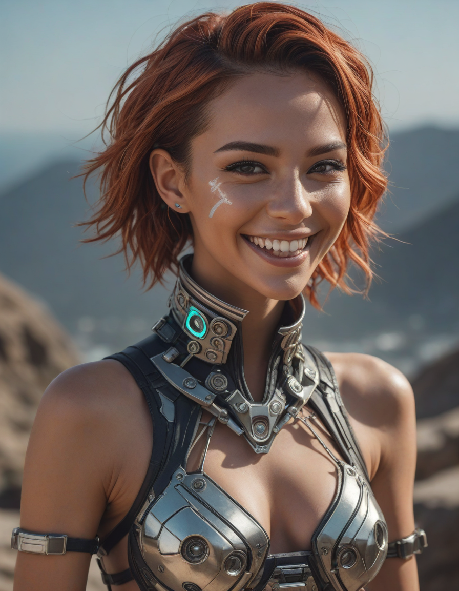 futuristic cyberpunk outfit with glowing accents, joyful laughing expression, eyes crinkled with mirth