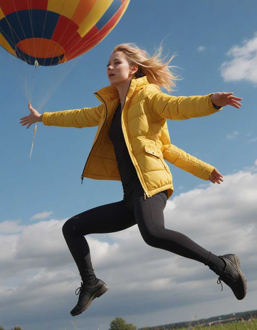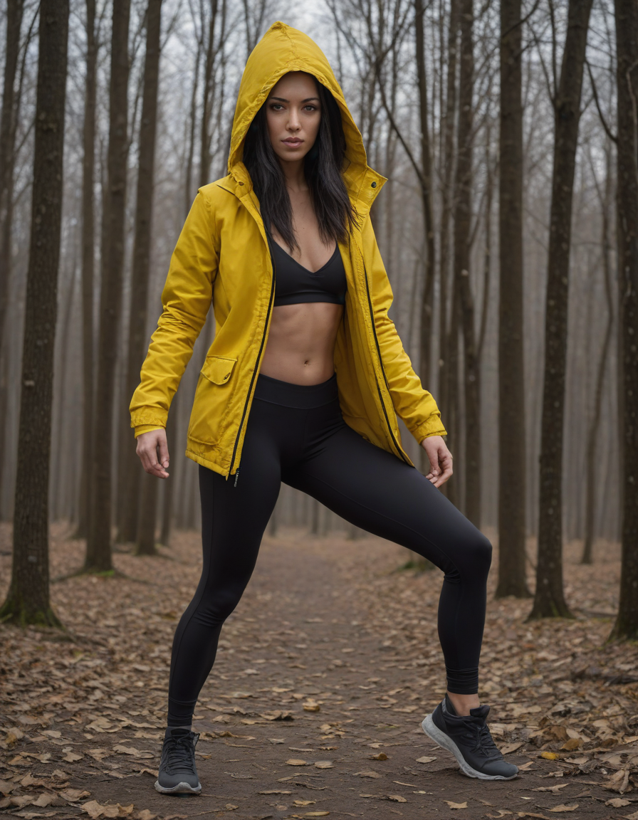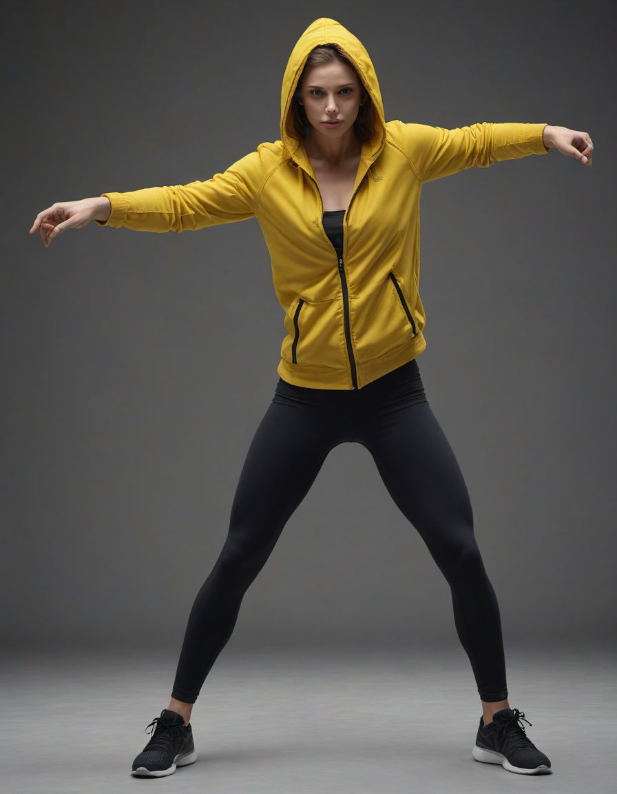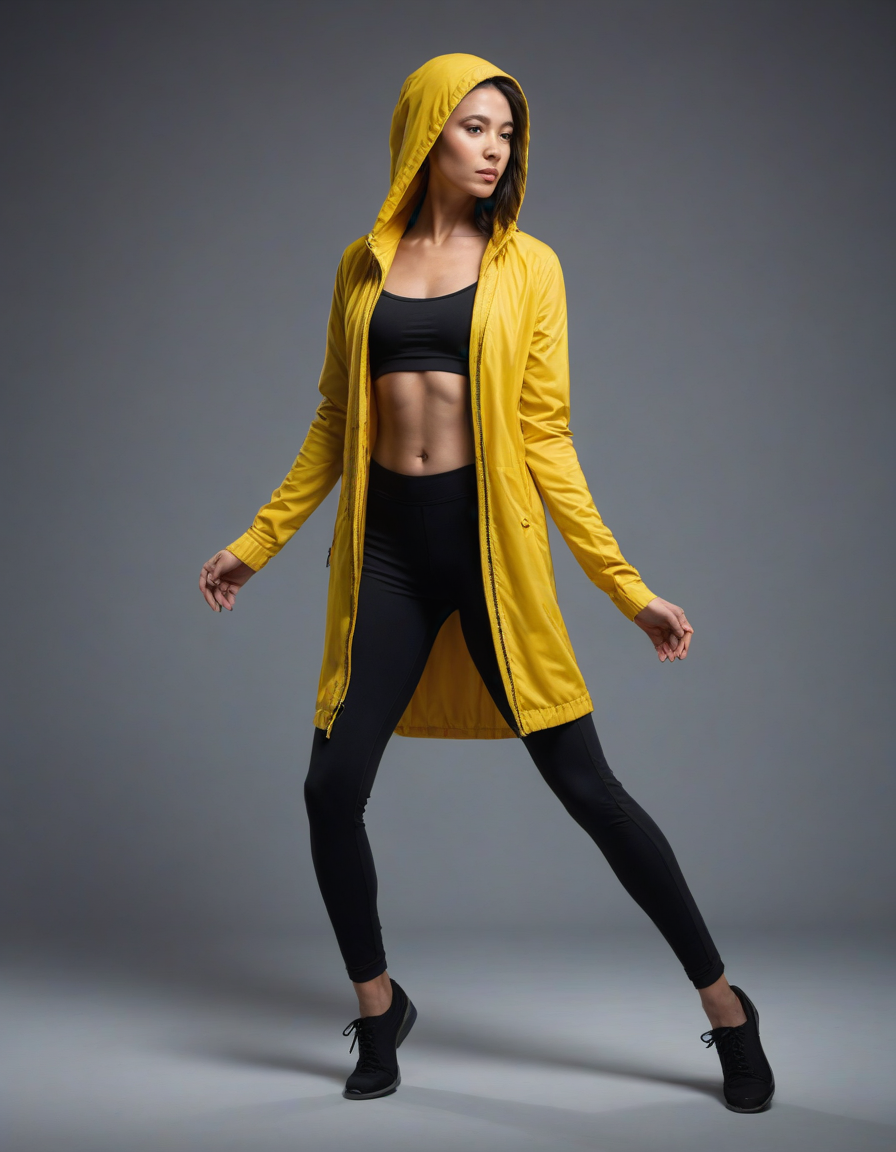 contemporary dancer onstage, a lady wearing a hooded yellow parka and a pair of formfitting black leggings, muscular physique