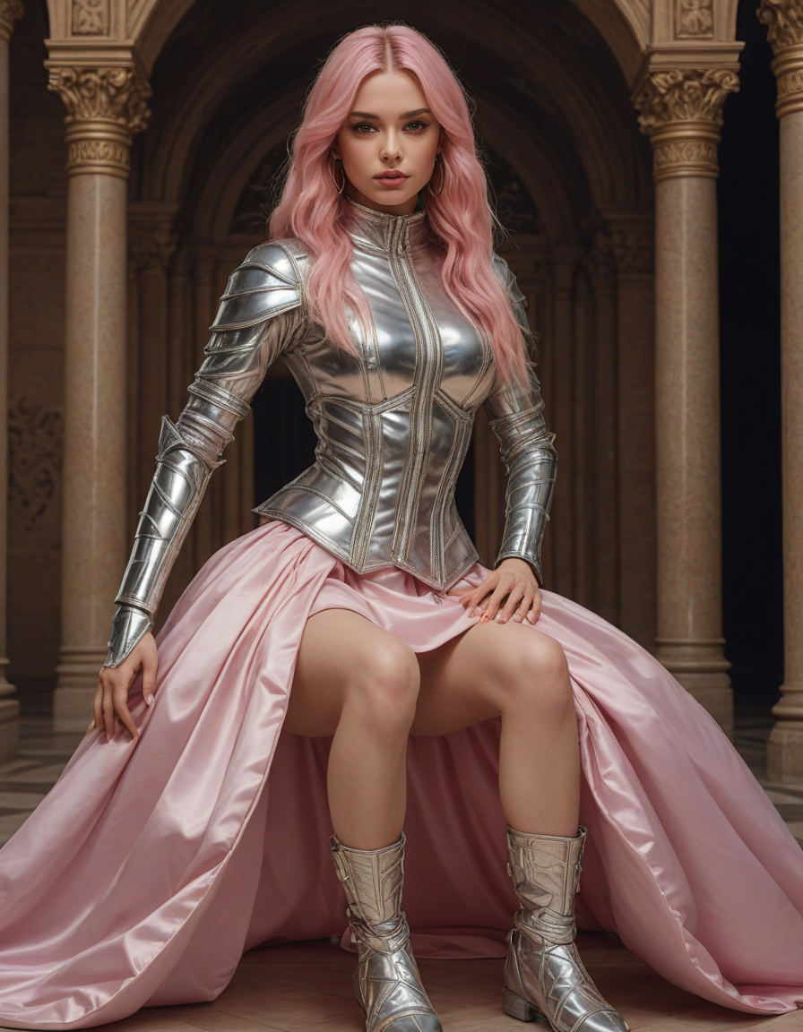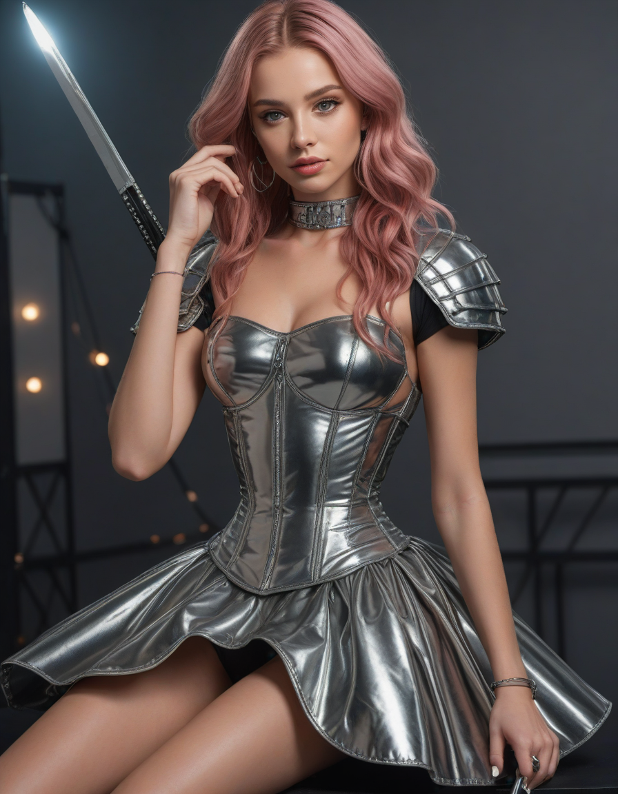 life of the party, Wide Skirt, wide ballgown hem, a line skirt, petticoat skirt, , looking at viewer, shiny, glossy PVC outfit, (shiny glossy PVC cloth textures), clothes made from pvc, plastic, Visualize a photorealistic portrayal of an 18-year-old high school senior girl, epitomizing the e-girl aesthetic with a blend of internet culture's vibrancy and personal audacity. Clad in an oversized striped shirt under a black graphic t-shirt dress, her style is a testament to e-girl fashion's layered intricacy, complemented by fishnet tights and chunky boots. Her makeup features dramatic winged eyeliner, neon eyeshadow, and dark lipstick, with blush bringing her face to life. Accessories like silver chains and a heart pendant choker, along with pastel or neon hair streaks, enhance her playful rebellion. Standing hands-on-hips, she exudes confidence and individuality against a backdrop suggestive of e-girl life, with neon signs and string lights. This scene captures her bold identity and expressive spirit at this pivotal moment., wearing complete set of armor, wearing full armor, Wearing chest armor, wearing leg armor, wearing feet armor, wearing bracer, wearing pauldrons,, Holding a sword in both hands in a confident pose, detailed grip, detailed fuller, detailed pommel, detailed blade, detailed edge, , brick wall -> great window view, Lip fillers, thick full lips, enhanced lip volume, accented cupid's bow, Rhinoplasty, refined nose shape, straightened nasal profile, facial symmetry, Botox injections, smoothed facial lines, reduced wrinkles, youthful appearance, Cheek fillers, pronounced cheekbones, sculpted contours, lifted cheeks, brightened eyes, reduced under-eye bags, rejuvenated area, Liposuction contoured shape, reduced excess fat, sculpted physique, Dermal fillers, restored volume, smoothed texture, diminished lines, strengthened definition, balanced proportions, enhanced jawline, Facelift, tightened skin, reduced sagging, improved skin tone, reduced imperfections, enhanced clarity, Blepharoplasty, Reduced puffiness, restored youthful eye contour, Enhanced chin shape, improves facial harmony, strengthened jawline definition, symmetry facial features, golden_ratio