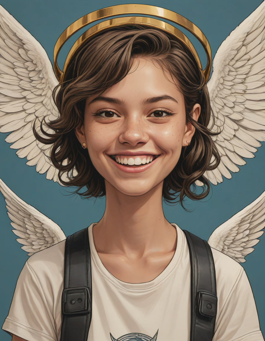 Smiling angel with halo, skater punk, Glorious, exaggerated, caricatured comic style