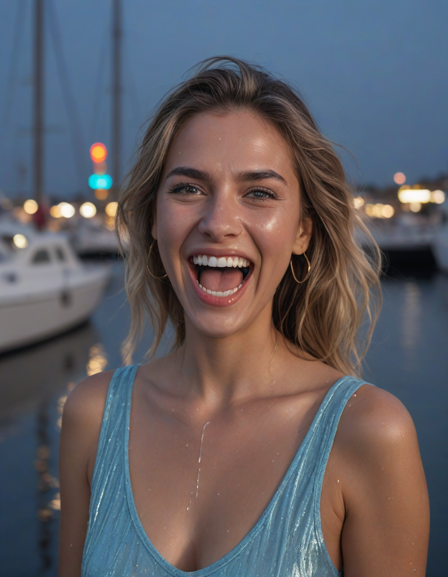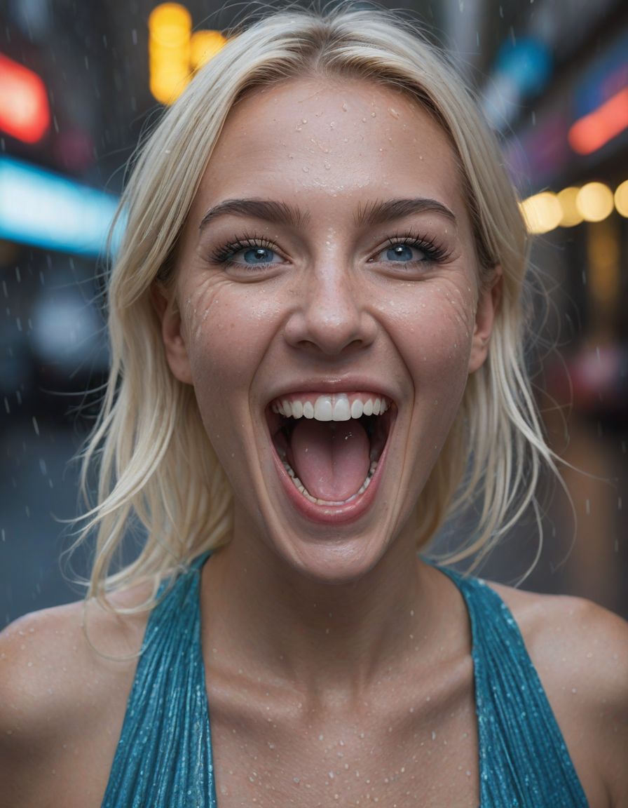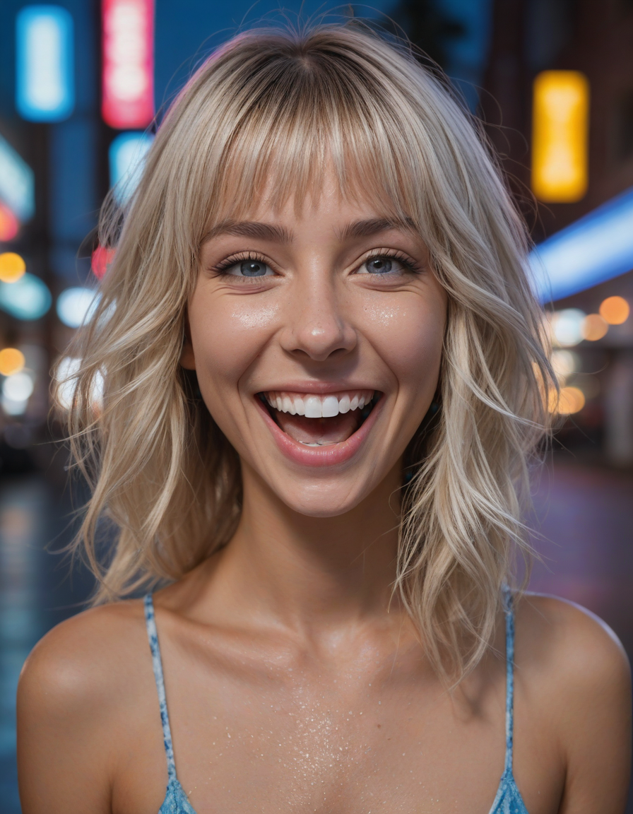 Teeth-filled grin, drunk santa yelling, a stunning, breathtaking beauty, light blue colored iris pigment, light blue colored eyes, blue-iris-color, blue-eye-color,, Rain-streaked pavement, neon lights reflecting, laughing