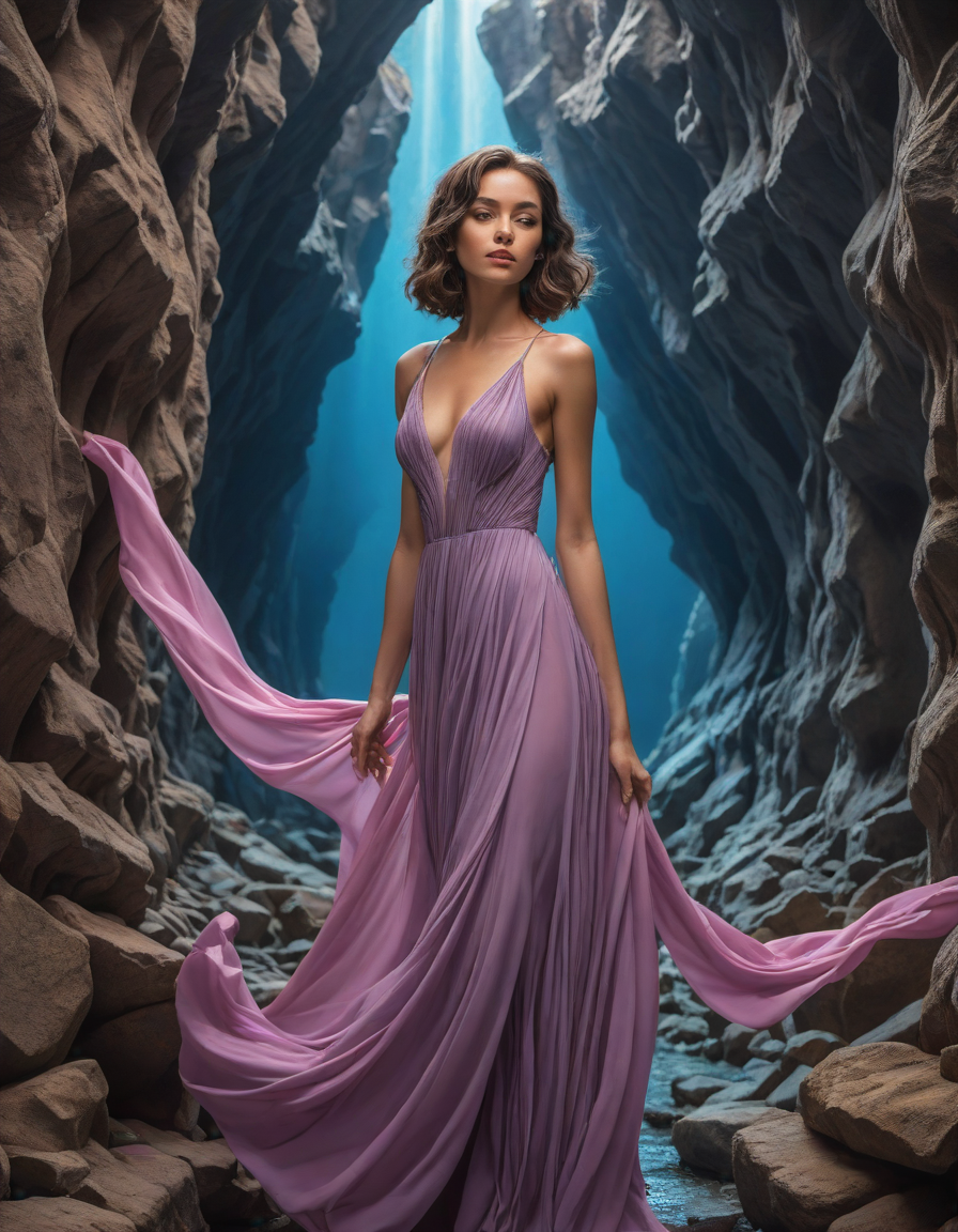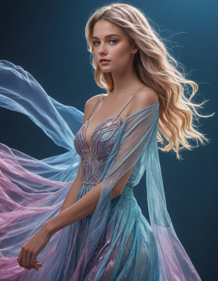Rose colored long dress flowing in the wind in a curious way, laser background, colorful, radiant sunlight on skin, Wise-looking, light blue colored iris pigment, light blue colored eyes, blue-iris-color, blue-eye-color,, azure sky, Prismatic renaissance