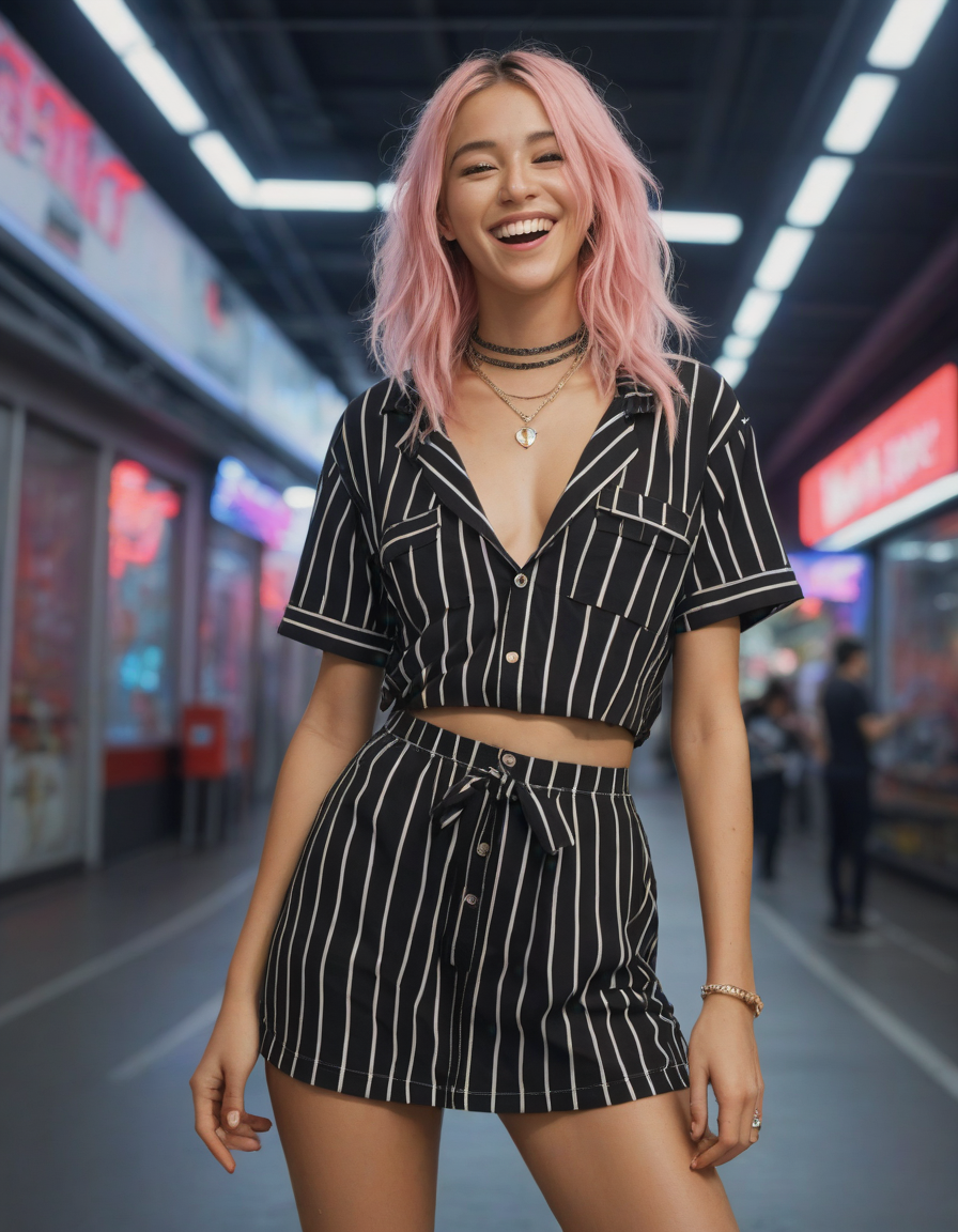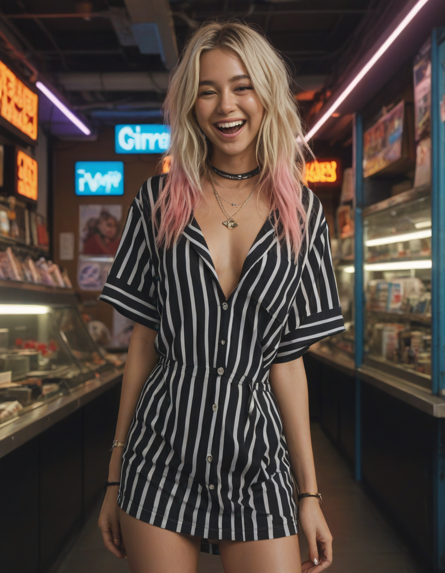 laughing, Visualize a photorealistic portrayal of an 18-year-old high school senior girl, epitomizing the e-girl aesthetic with a blend of internet culture's vibrancy and personal audacity. Clad in an oversized striped shirt under a black graphic t-shirt dress, her style is a testament to e-girl fashion's layered intricacy, complemented by fishnet tights and chunky boots. Her makeup features dramatic winged eyeliner, neon eyeshadow, and dark lipstick, with blush bringing her face to life. Accessories like silver chains and a heart pendant choker, along with pastel or neon hair streaks, enhance her playful rebellion. Standing hands-on-hips, she exudes confidence and individuality against a backdrop suggestive of e-girl life, with neon signs and string lights. This scene captures her bold identity and expressive spirit at this pivotal moment., excessive cleavage, low neckline, revealing chest, revealing cleavage, cleavage-baring, revealing, excessively revealing, very revealing, lowcut, lowrise,