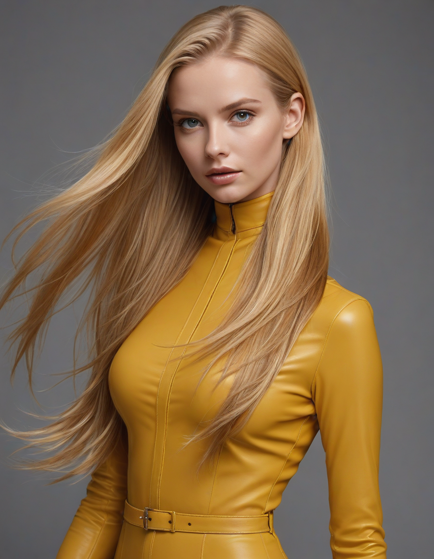 yellow team, admiration, passionate, sheer amazement, Dressed in the sleekest leather ensemble, long, flowing, wavy locks, flat straight hair, flat hair, straight hair, straightened hair,