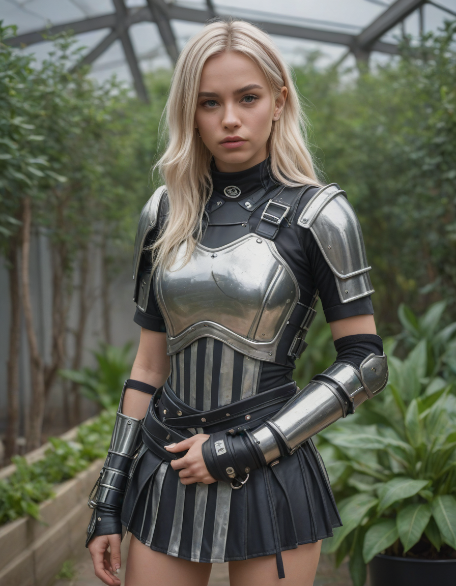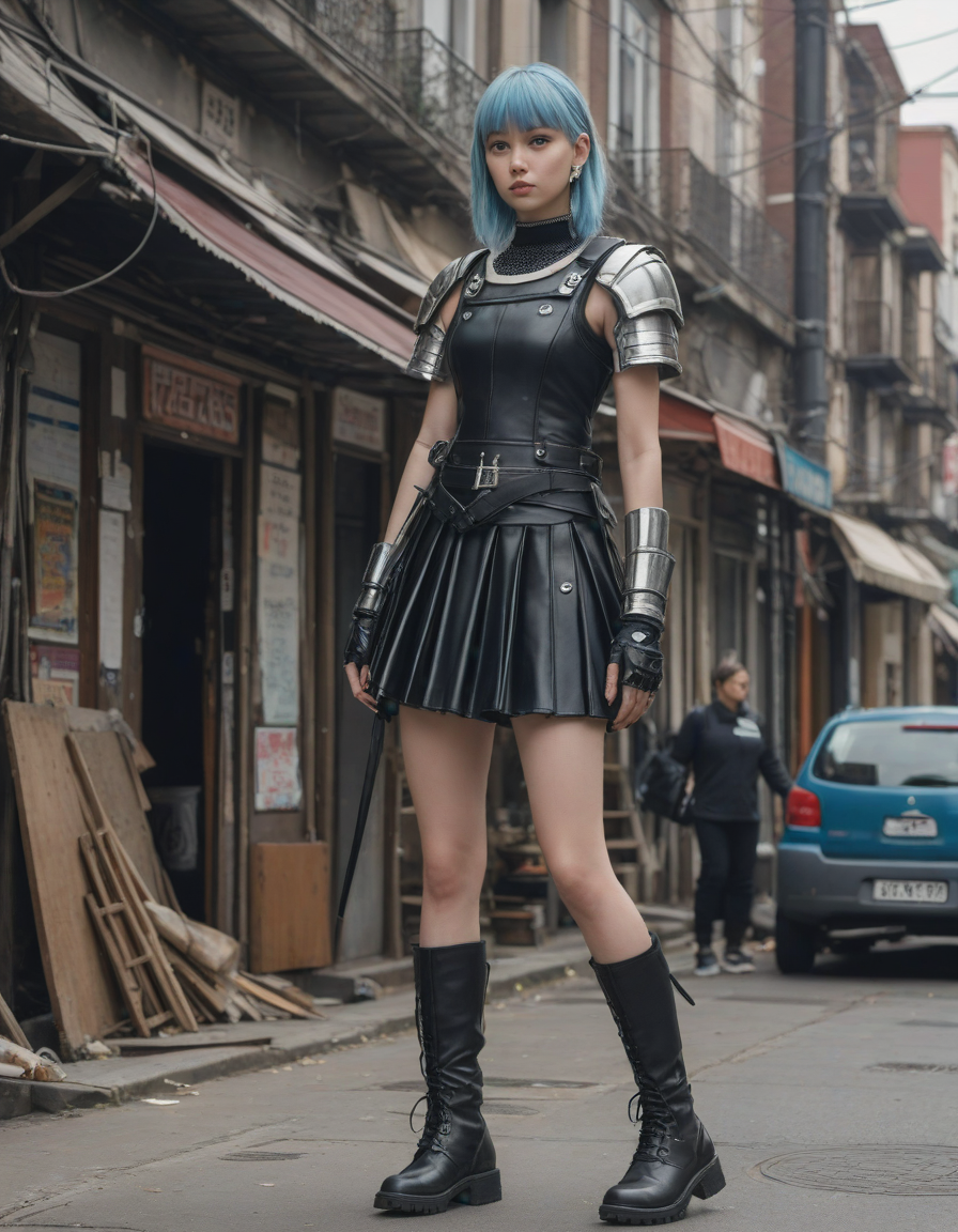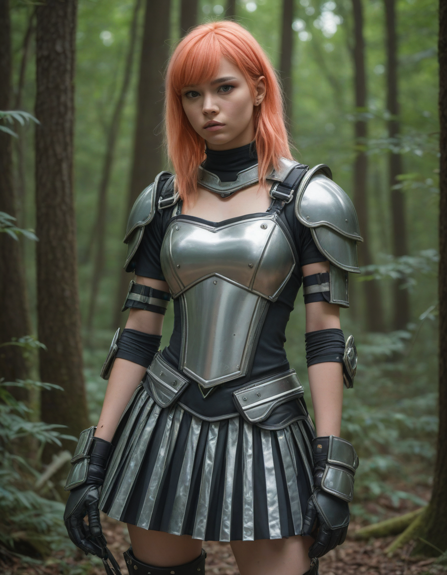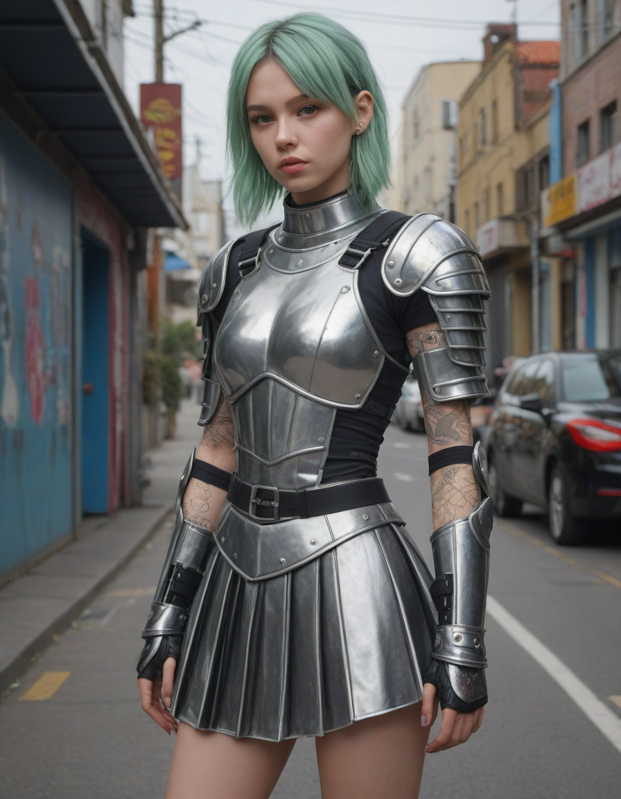 Wide Skirt, wide ballgown hem, a line skirt, petticoat skirt, , Wielding a one-handed weapon in both hands, one-handed weapon, weapon, , Visualize a photorealistic portrayal of an 18-year-old high school senior girl, epitomizing the e-girl aesthetic with a blend of internet culture's vibrancy and personal audacity. Clad in an oversized striped shirt under a black graphic t-shirt dress, her style is a testament to e-girl fashion's layered intricacy, complemented by fishnet tights and chunky boots. Her makeup features dramatic winged eyeliner, neon eyeshadow, and dark lipstick, with blush bringing her face to life. Accessories like silver chains and a heart pendant choker, along with pastel or neon hair streaks, enhance her playful rebellion. Standing hands-on-hips, she exudes confidence and individuality against a backdrop suggestive of e-girl life, with neon signs and string lights. This scene captures her bold identity and expressive spirit at this pivotal moment., wearing complete set of armor, wearing full armor, Wearing chest armor, wearing leg armor, wearing feet armor, wearing bracer, wearing pauldrons, Wearing helmet, Wearing breastplate, Wearing gauntlets, Wearing greaves, Wearing pauldrons, Wearing vambraces, Wearing cuisses, Wearing sabatons, Wearing gorget, Wearing tassets, Wearing bracers, Wearing cuirass, Wearing faulds, Wearing plackart, Wearing spaulders, Wearing besagews