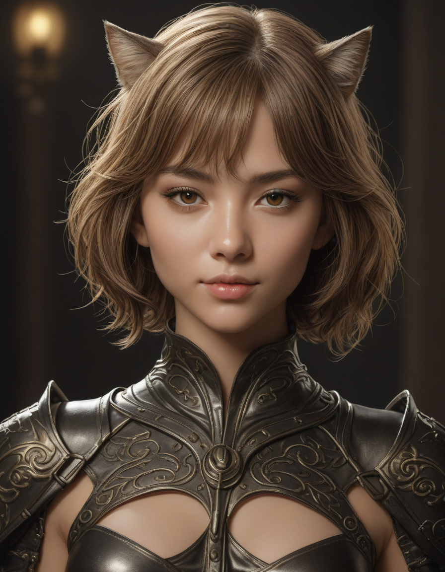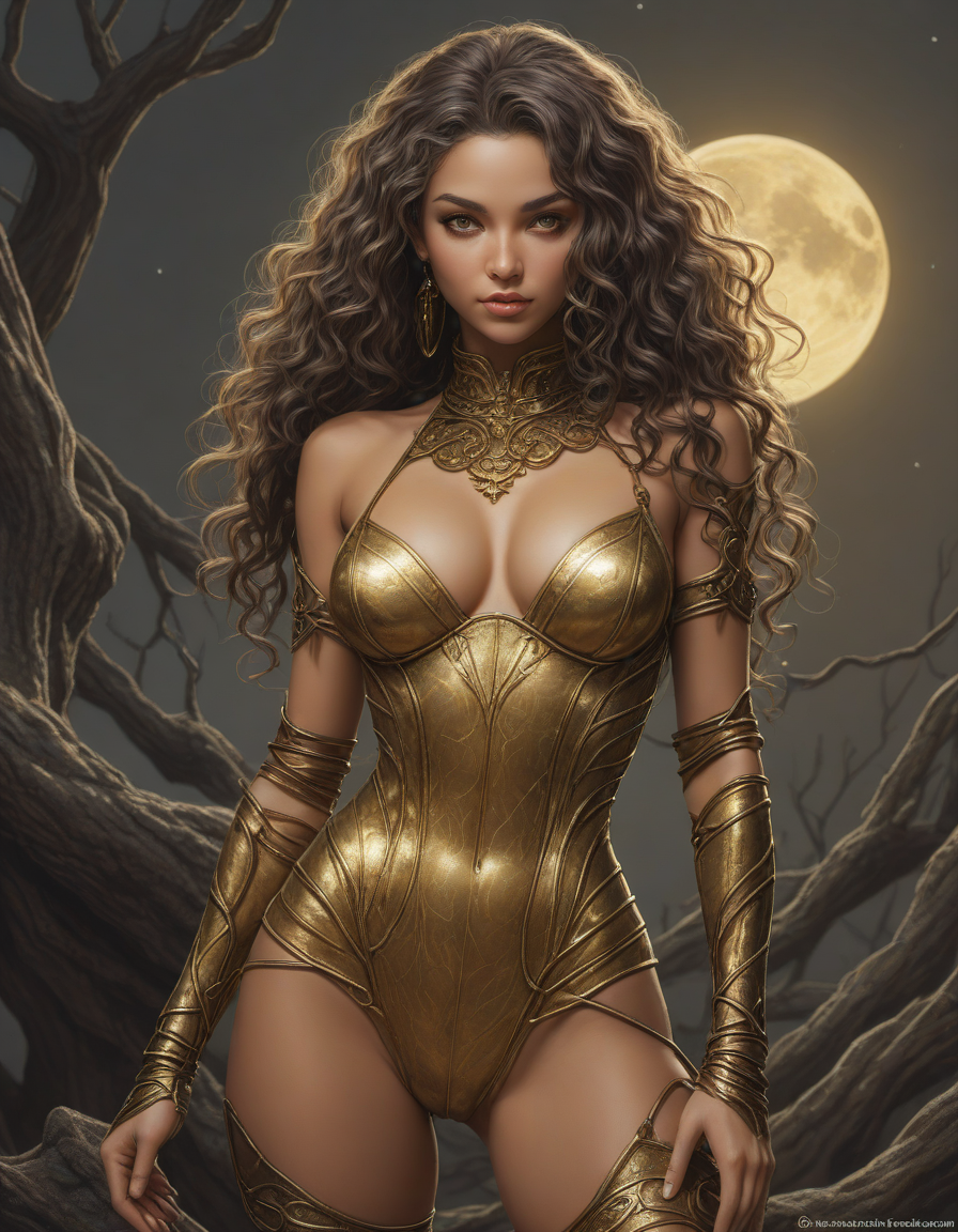 high quality, best quality, highly detailed, high quality, realistic, exceptional quality, exception, masterpeice, breathtaking, logical, logical detail, , muted colors, Brom art, Larry Elmore art, Keith Parkinson art, retro 90s fantasy art style, retro fantasy art, fantasy art, retro fantasy art, soft, subdued, desaturated, pastel, low-saturation, understated, neutral, earthy, faded, washed-out, toned-down, dull, matte, whispery, subtle, pale, gentle, hushed, dusty, smoky, dim, restrained, somber, muted, tarnished, weathered, muted-earth, shadowed, grayed, muted-jewel, and vintage, sepia-toned, aged, antique, and ethereal,, yellow cat-like eyes, pleased, Glistening in moonlight, Dressed in the sleekest leather ensemble, Anime-style hourglass figure