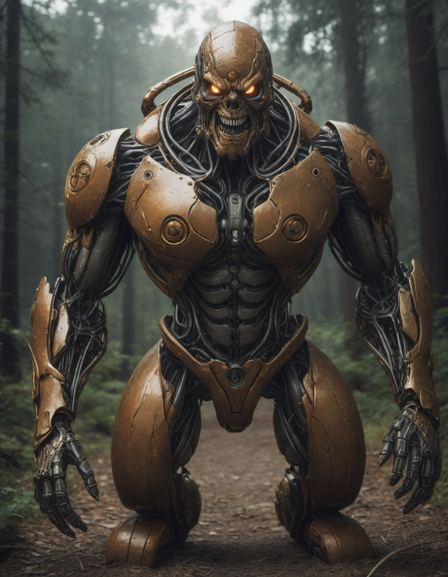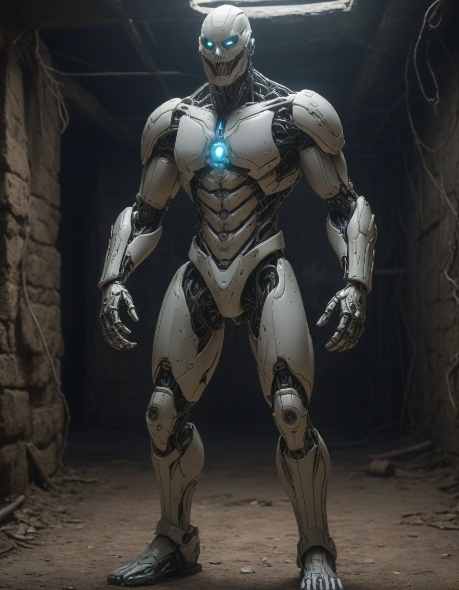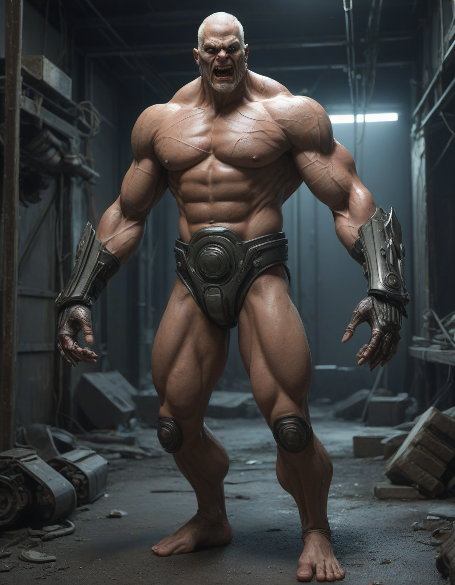 excited, robot santa claus, evil villain, Ethereal, evanescent, otherworldly, Grunting for control, muscular physique, standing rigidly present