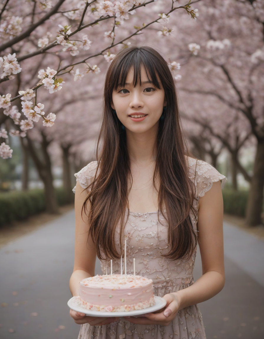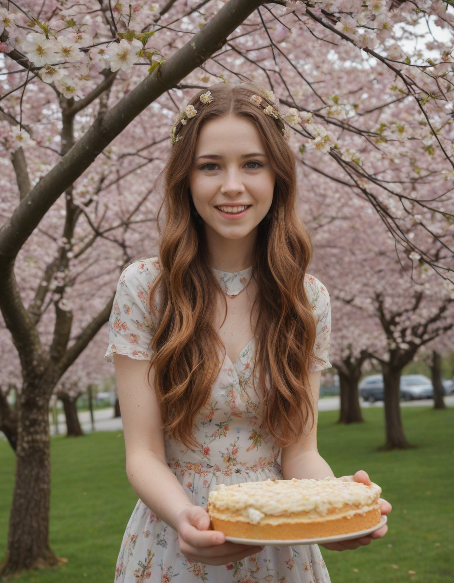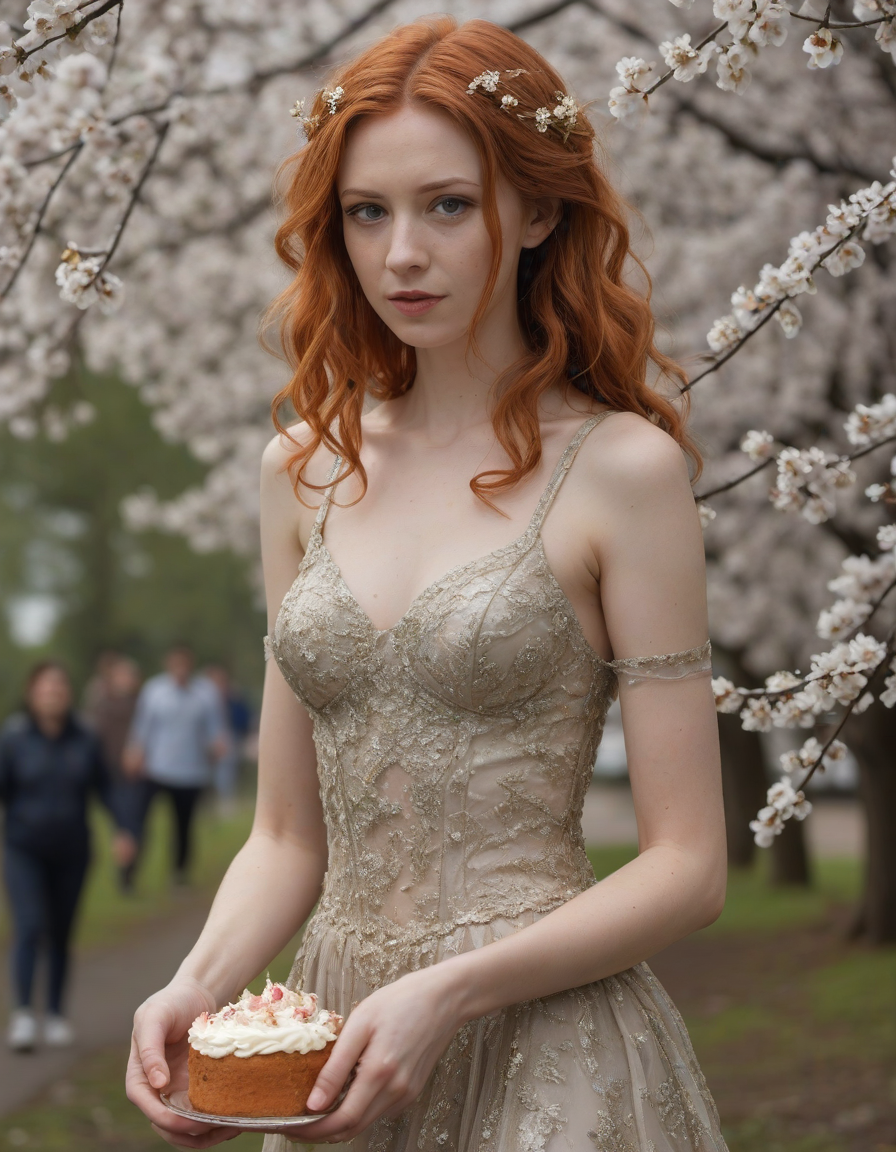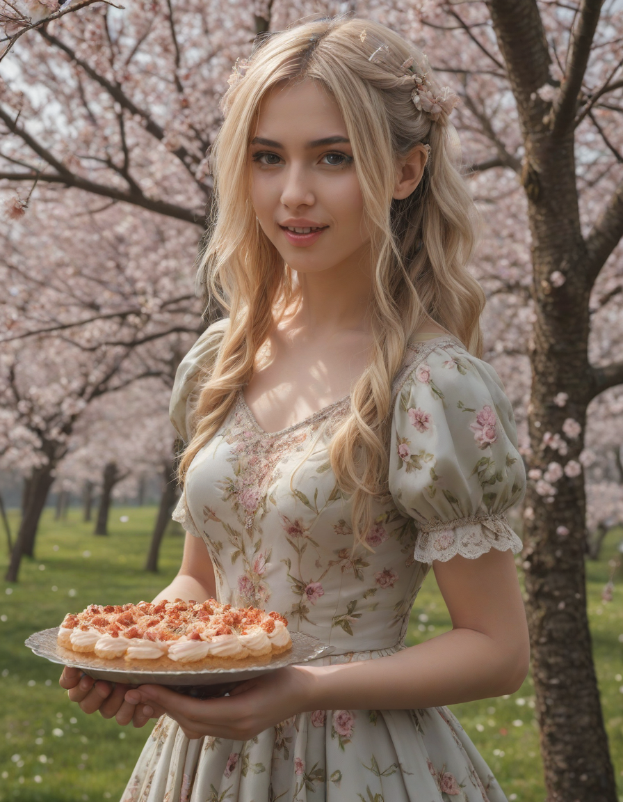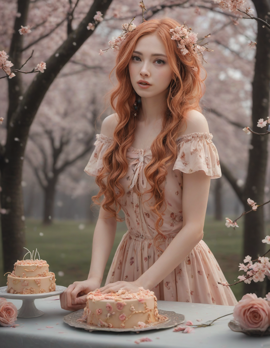 excited, mad, eating cake, florals in spring, glittering dress, nervously wringing damp trembling hands, Blossoming cherry trees, petals falling like snow, selkie
