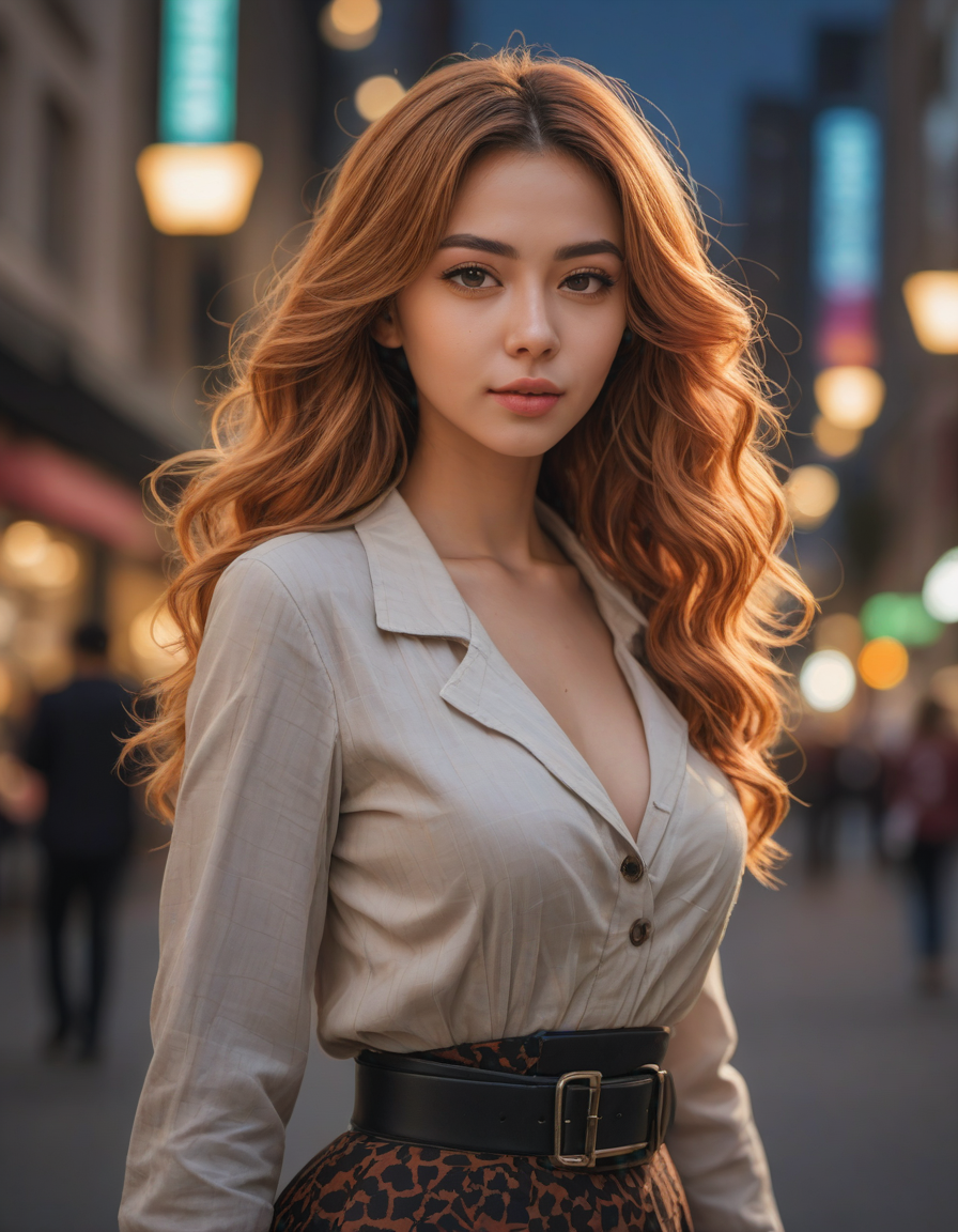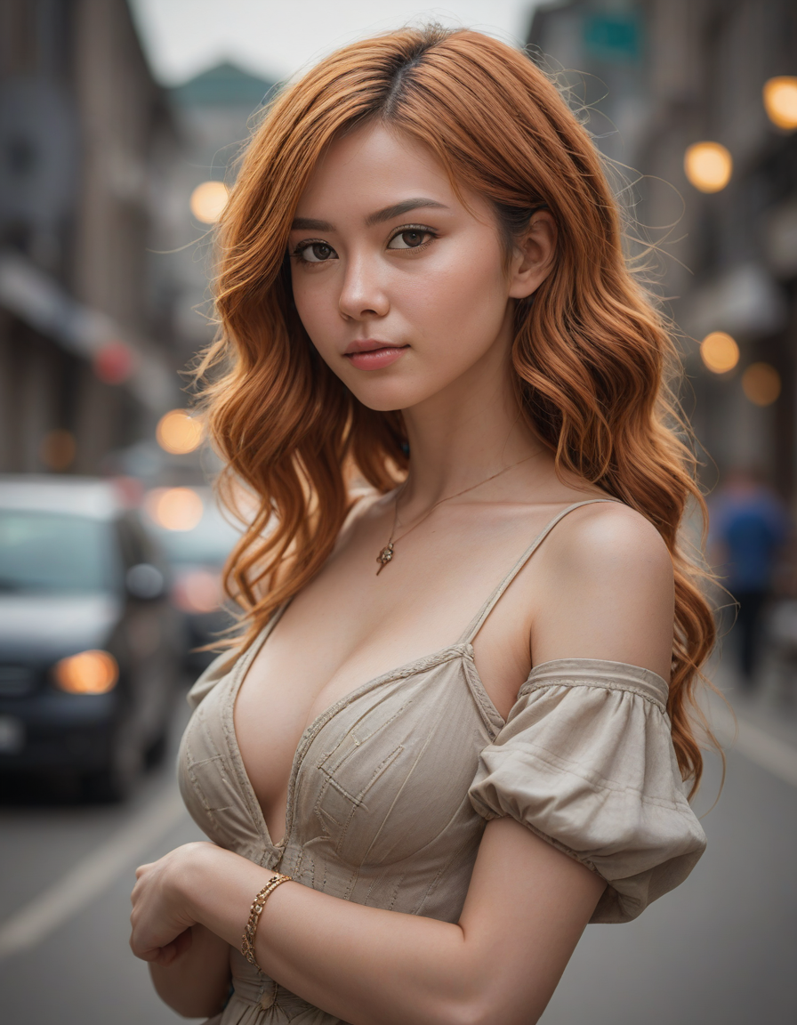 a sharp, first portrait with bokeh effect, Anime-style hourglass figure