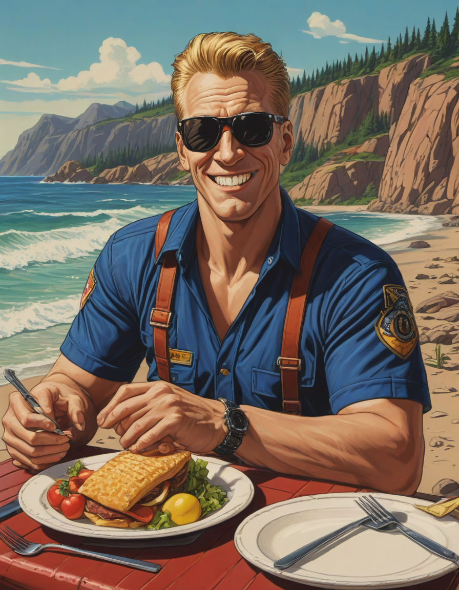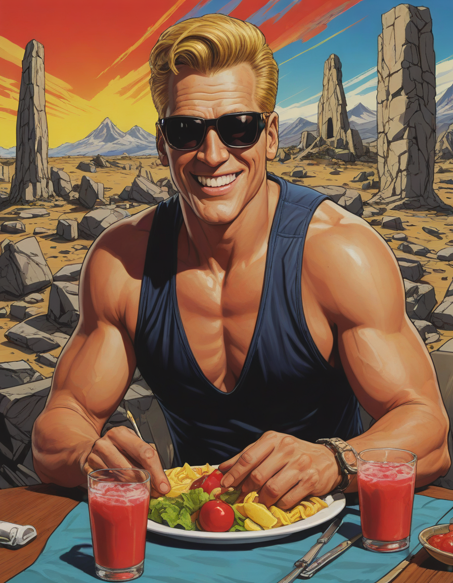 pop art, duke nukem, An almost imperceptible smile, Having lunch