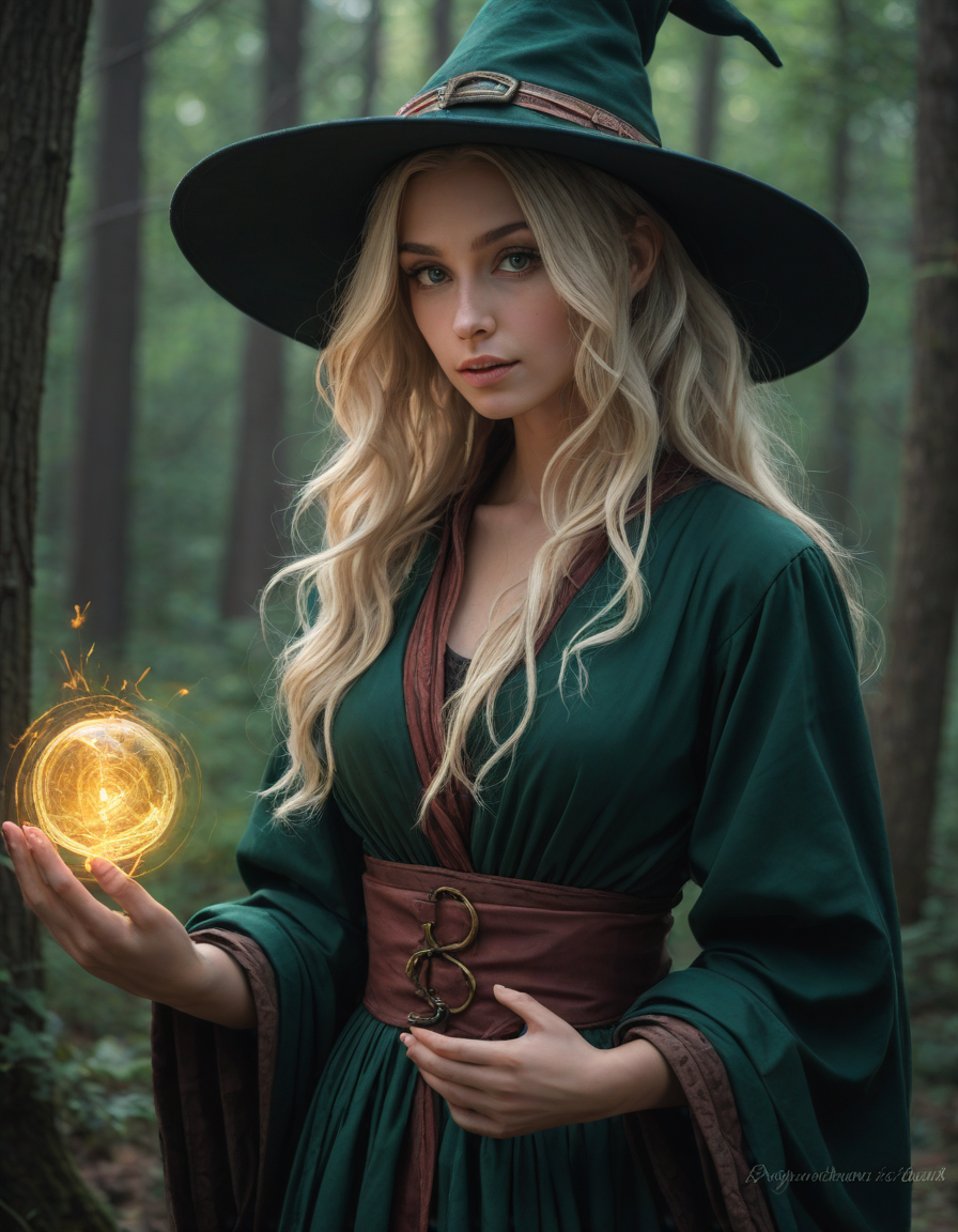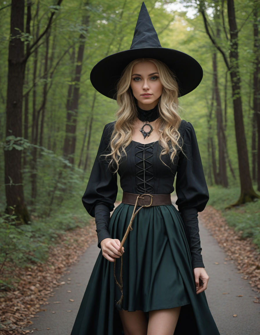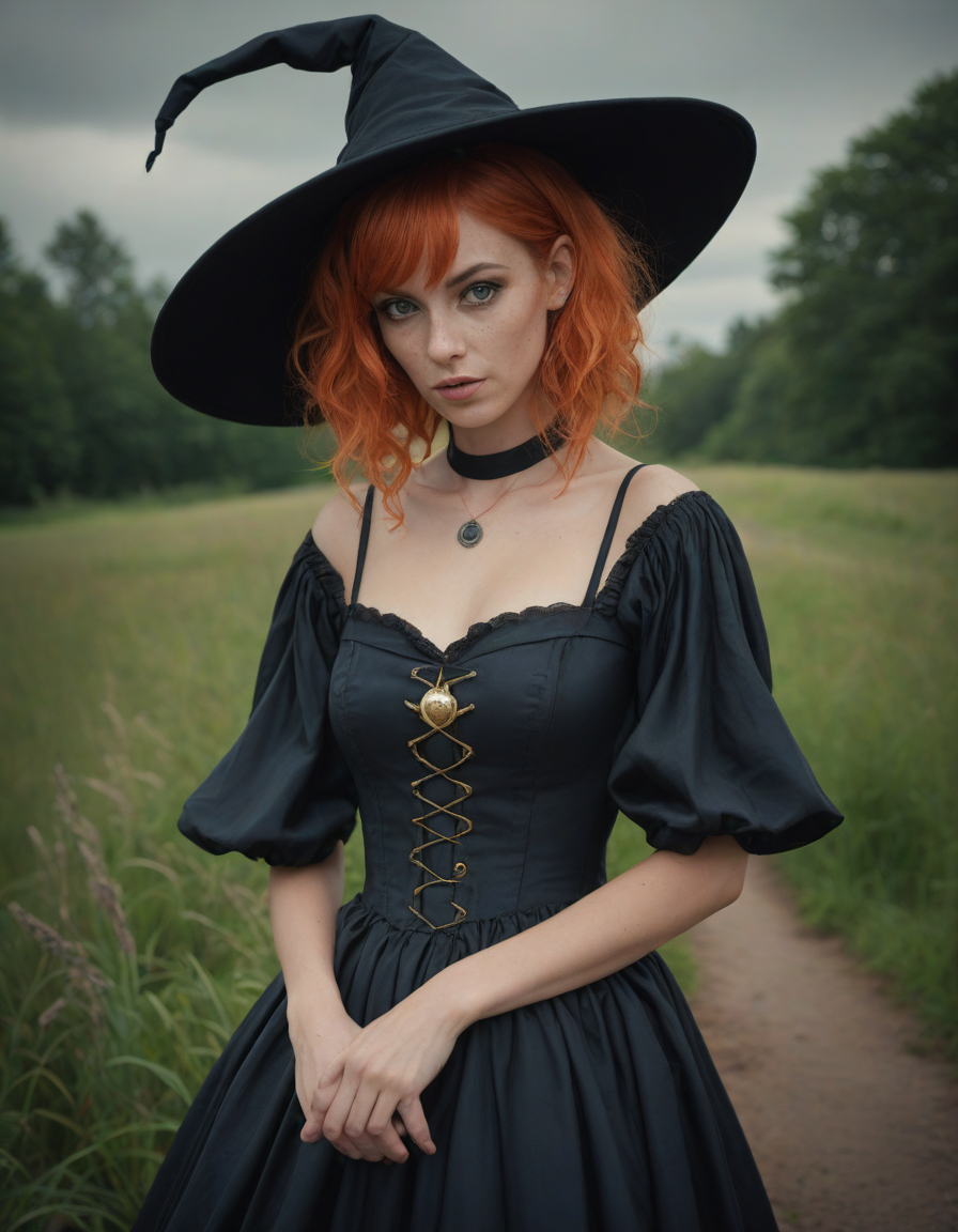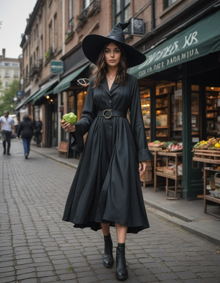 Projected, heart skipping a beat, appalled, short telephoto lens, dressed as a witch, love, radiant green eyes, briskly walking towards