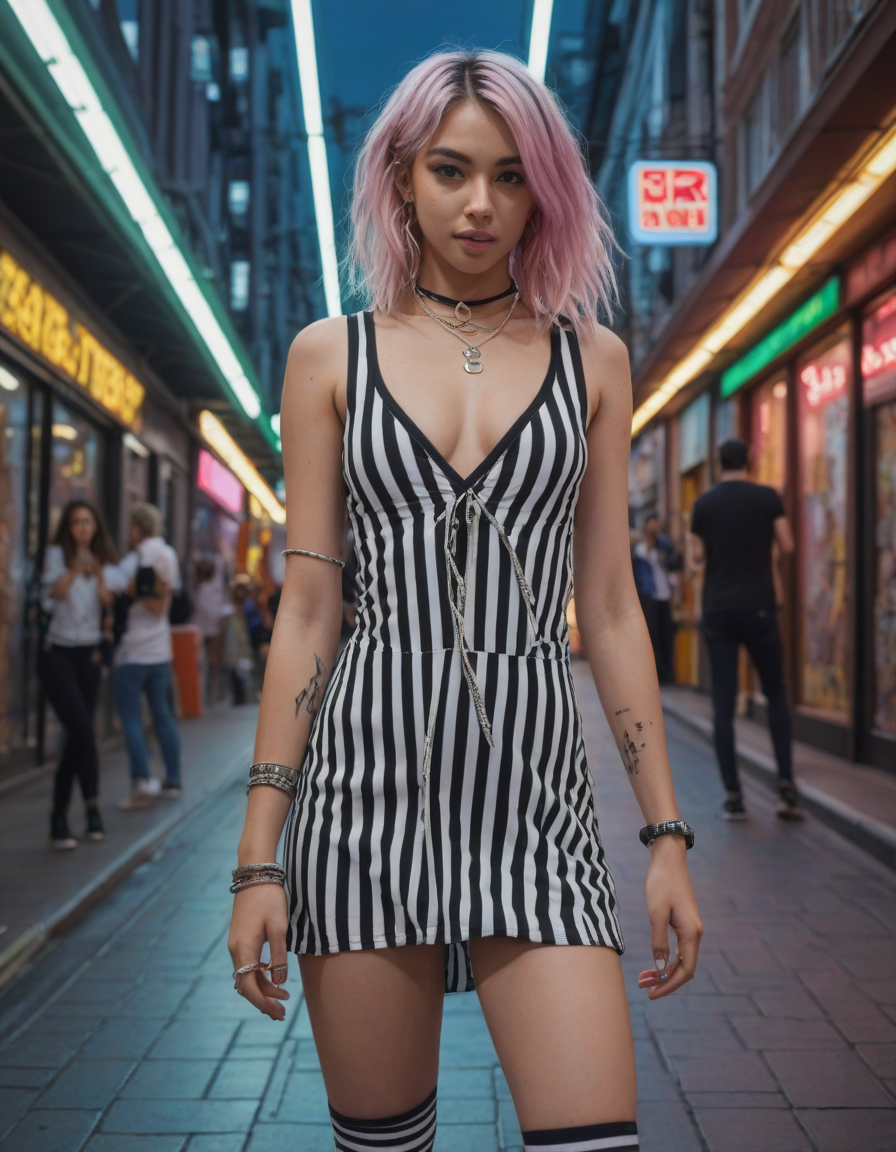 wearing sleeveless leotard, wearing one peice clothing, leotard, sleeveless, , life of the party, Wielding a one-handed weapon in both hands, one-handed weapon, weapon, , Visualize a photorealistic portrayal of an 18-year-old high school senior girl, epitomizing the e-girl aesthetic with a blend of internet culture's vibrancy and personal audacity. Clad in an oversized striped shirt under a black graphic t-shirt dress, her style is a testament to e-girl fashion's layered intricacy, complemented by fishnet tights and chunky boots. Her makeup features dramatic winged eyeliner, neon eyeshadow, and dark lipstick, with blush bringing her face to life. Accessories like silver chains and a heart pendant choker, along with pastel or neon hair streaks, enhance her playful rebellion. Standing hands-on-hips, she exudes confidence and individuality against a backdrop suggestive of e-girl life, with neon signs and string lights. This scene captures her bold identity and expressive spirit at this pivotal moment., excessive cleavage, low neckline, revealing chest, revealing cleavage, cleavage-baring, revealing, excessively revealing, very revealing, lowcut, lowrise,