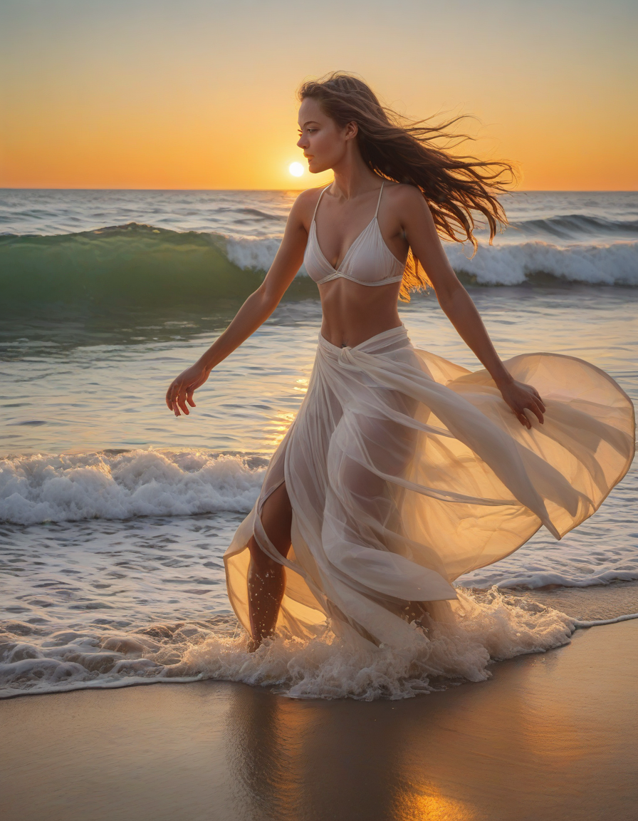 the feeling of achieving max power, Edges blurred, colors saturated, Passionate, raised chin, Look of pride, friend hugging, A painting of splendid beauty, Honeyed curves and secret sighs, perky, Surfer catching wave in beach sunset, glistening silk