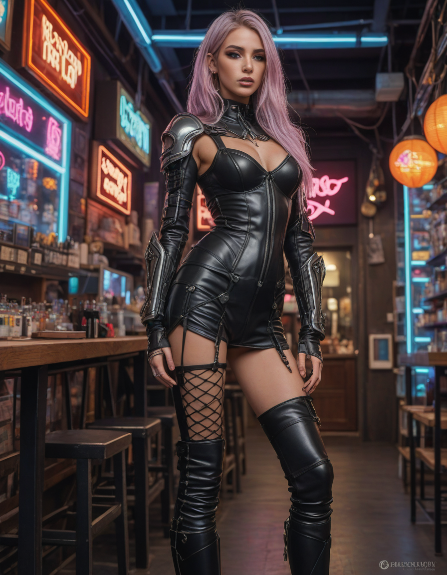 bohemian, "free spirit", jewelry, tattoo, spring dress, elegant, high waist tight overknee stiletto boots, Visualize a photorealistic portrayal of an 18-year-old high school senior girl, epitomizing the e-girl aesthetic with a blend of internet culture's vibrancy and personal audacity. Clad in an oversized striped shirt under a black graphic t-shirt dress, her style is a testament to e-girl fashion's layered intricacy, complemented by fishnet tights and chunky boots. Her makeup features dramatic winged eyeliner, neon eyeshadow, and dark lipstick, with blush bringing her face to life. Accessories like silver chains and a heart pendant choker, along with pastel or neon hair streaks, enhance her playful rebellion. Standing hands-on-hips, she exudes confidence and individuality against a backdrop suggestive of e-girl life, with neon signs and string lights. This scene captures her bold identity and expressive spirit at this pivotal moment., wearing complete set of armor, wearing full armor, Wearing chest armor, wearing leg armor, wearing feet armor, wearing bracer, wearing pauldrons,