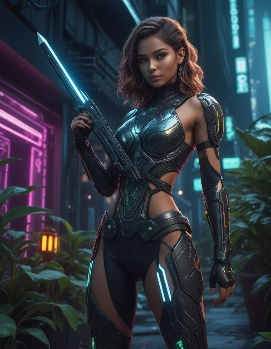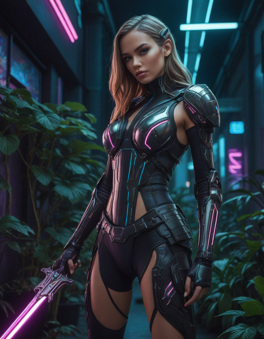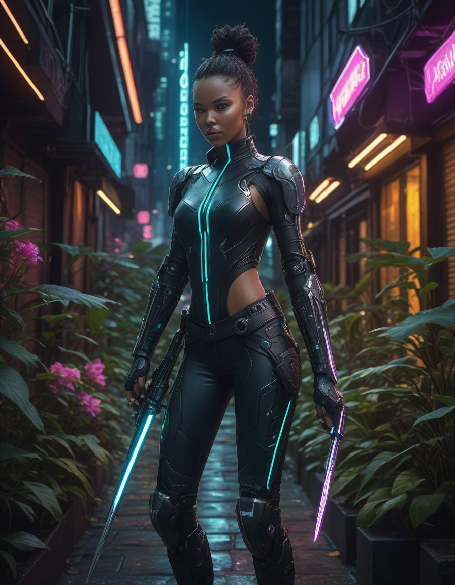 futuristic cyberpunk outfit with glowing accents, lush garden setting with flowers and vines, vibrant colors, highly stylized, artistic, cyberpunk, neon lights, futuristic cityscape, minimalist, dramatic cinematic lighting, high contrast shadows and highlights, Holding a sword in both hands in a confident pose, detailed grip, detailed fuller, detailed pommel, detailed blade, detailed edge,