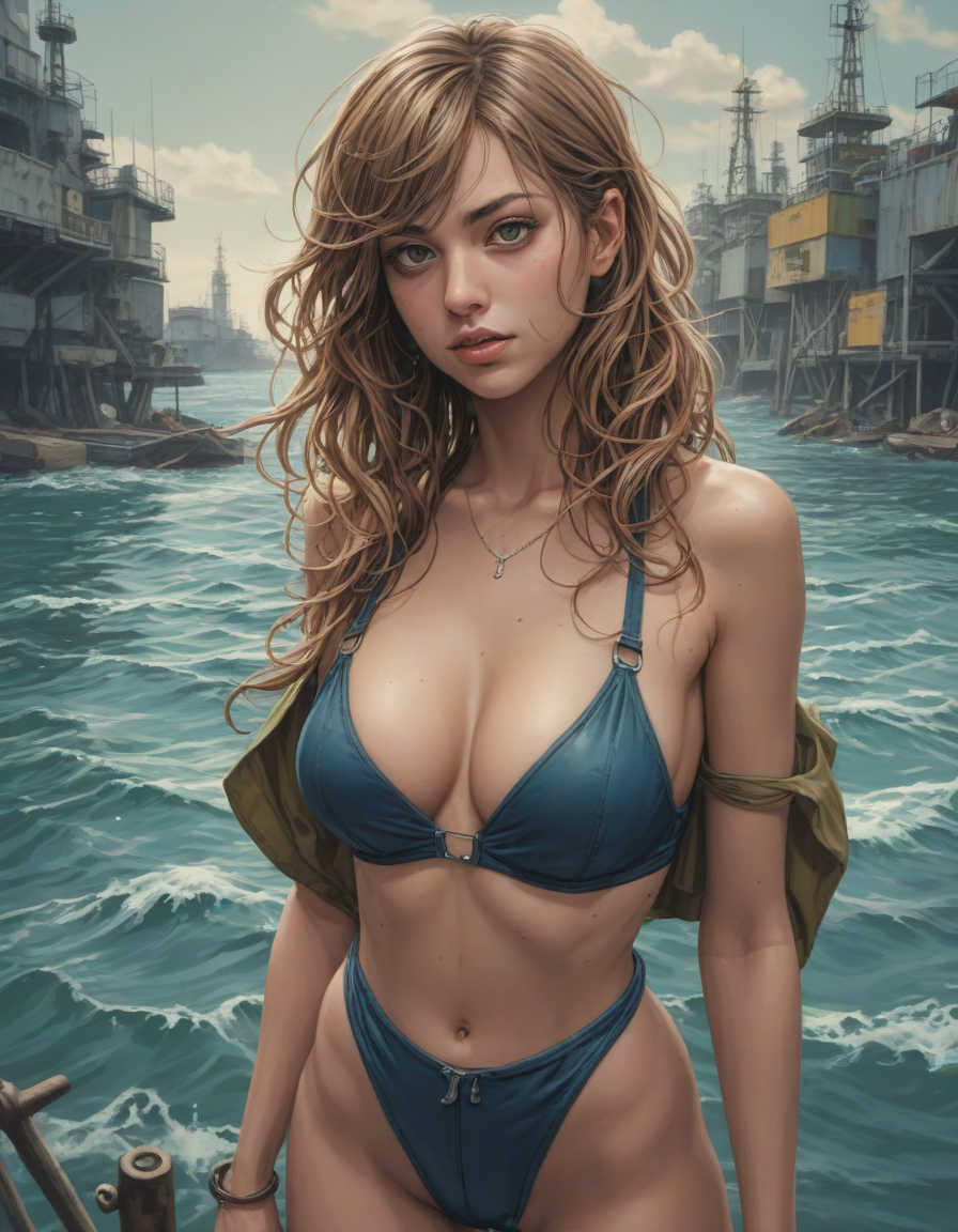 bulging eyes, sparkling sea spray, fade haircut, glassy, Scrutinizing, prostitute, hooker, streetwalker, whore, skin blemishes, flaws,, travel-hardened, driven mad god, Women in vibrant Anime costumes, Blissful meadow, post apocalypse