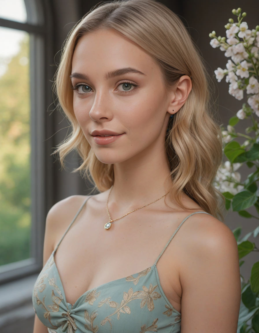 wearing sleeveless leotard, wearing one peice clothing, leotard, sleeveless, , laughing, bohemian, "free spirit", jewelry, tattoo, spring dress, Wide Skirt, wide ballgown hem, a line skirt, petticoat skirt, , Wielding a one-handed weapon in both hands, one-handed weapon, weapon, , oval face shape, almond-shaped eyes, voluminous lashes, slightly arched eyebrows, narrow nasal bridge, rounded nose tip, symmetrical nostrils, full lips, pronounced cupid's bow, slightly fuller lower lip, defined cheekbones, rounded chin, smooth complexion, softly contoured jawline, balanced facial proportions, symmetrical features, gently curved eyelids, soft brow ridge, harmonious cheek to jawline transition, subtle philtrum, delicate ear lobes, straight blonde hair, clear skin, hooded eyelids, light pink lip color, slightly pouty expression, casual pose with hand on face, slight head tilt, indoor lighting, Light blue irises, Medium-thickness eyebrows, Softly angled eyebrows, A hint of freckles across the nose and cheeks, Natural makeup, Gentle frown lines between the eyebrows, Soft nasolabial folds, Smooth forehead, Subtle dimple on the chin, Clear facial contour without distinct shadows, Even skin tone with a hint of natural pink undertones, Slightly rosy cheeks, Tapered jawline, Fine hair texture with gentle waves, Youthful appearance with soft facial features, Holding a sword in both hands in a confident pose, detailed grip, detailed fuller, detailed pommel, detailed blade, detailed edge, , brick wall -> great window view