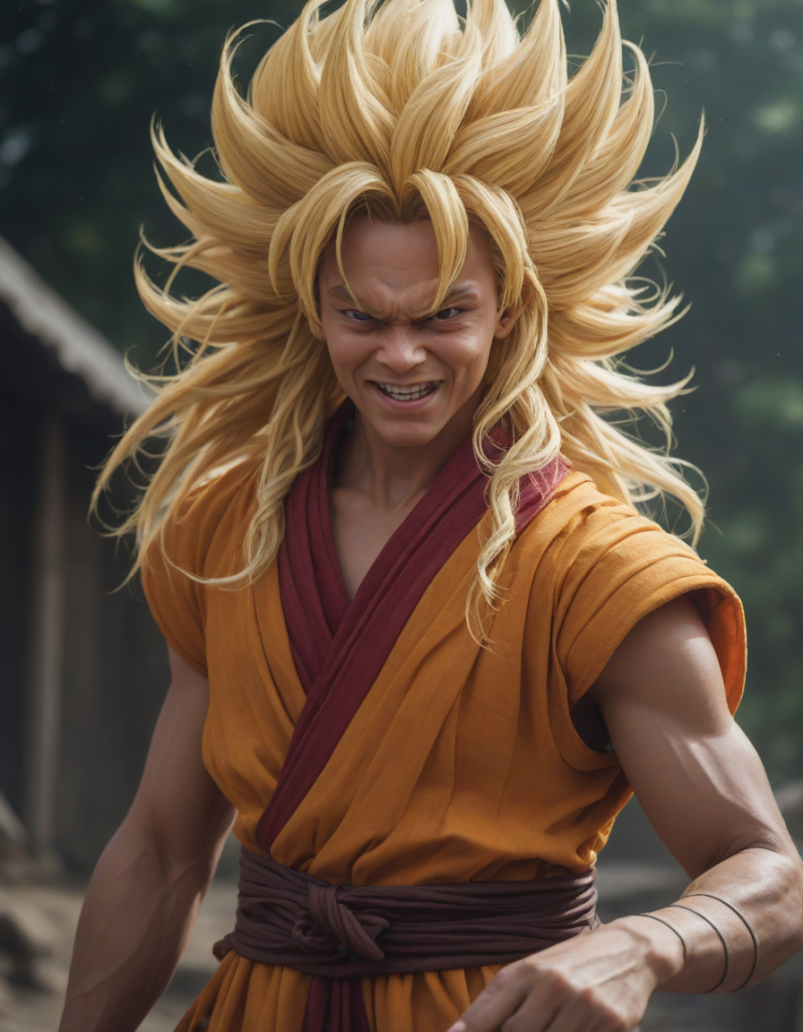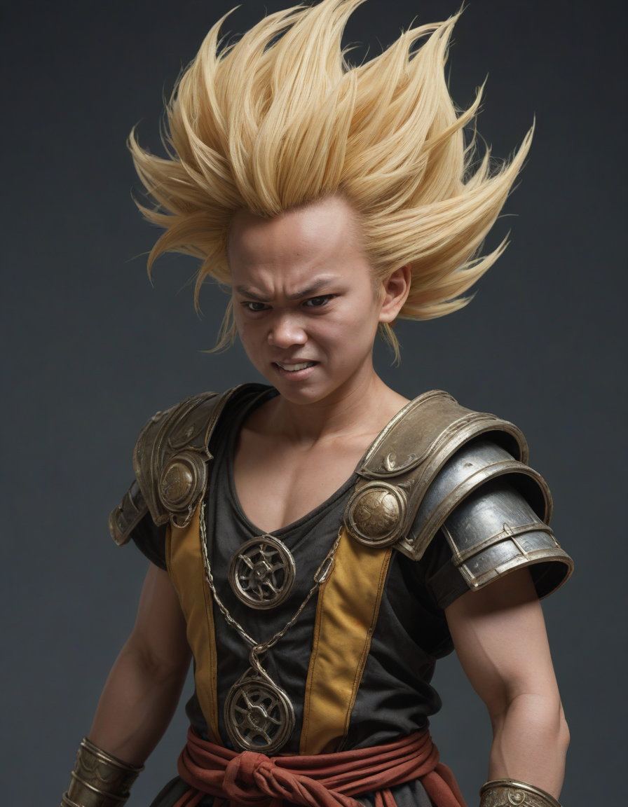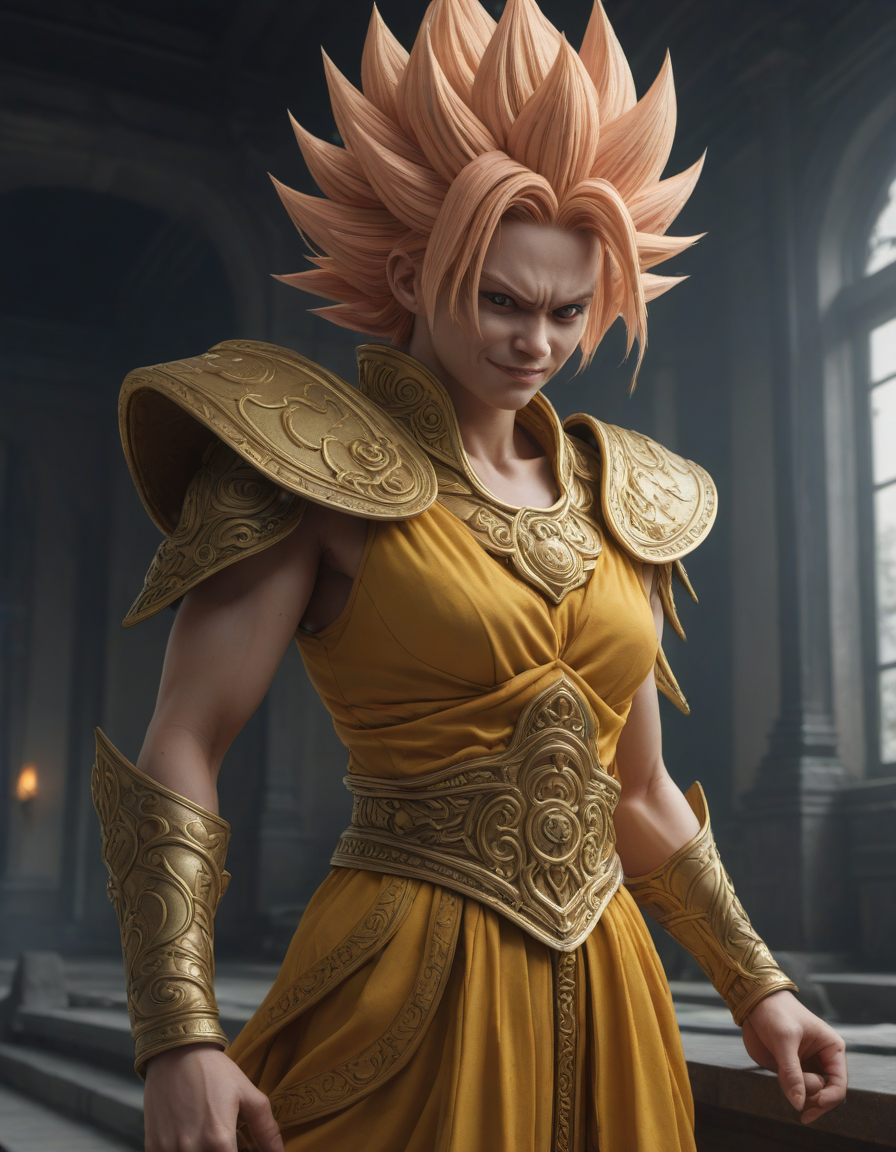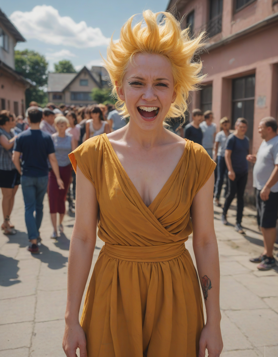 Haunting hue, very upset, going supersaiyan, smiling brightly in a fancy dress