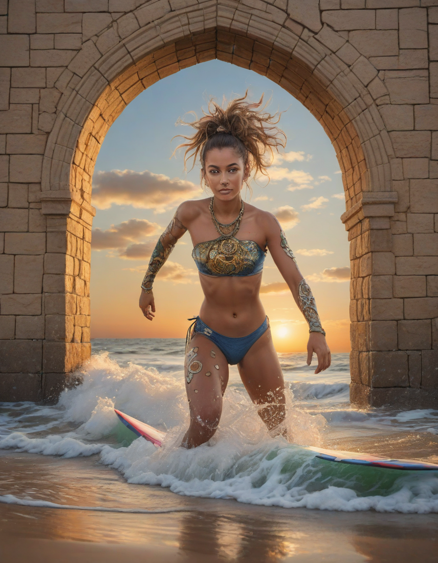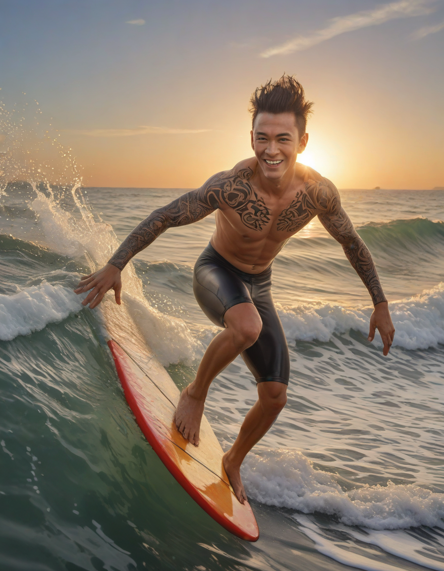 mohawk, superhero, symetrical, whimsical graffiti, perky, Surfer catching wave in beach sunset, photorealistic portrait