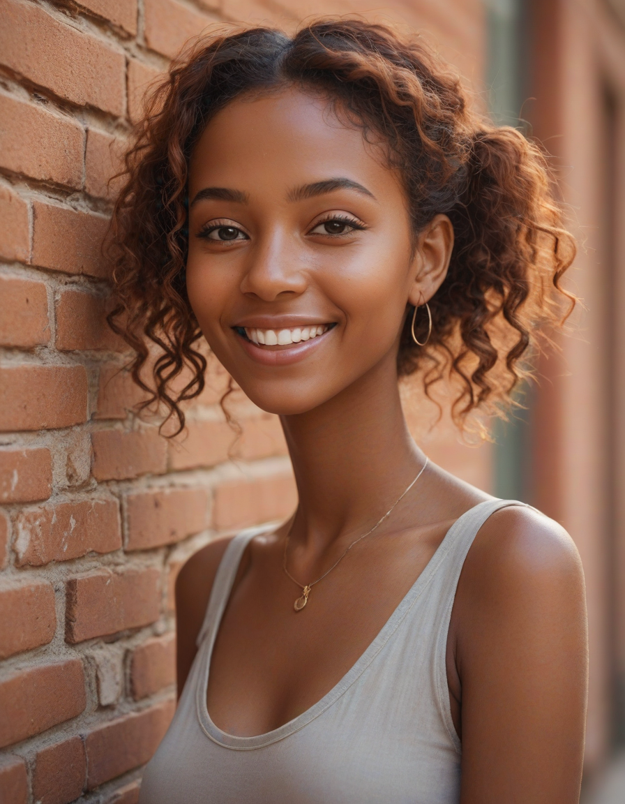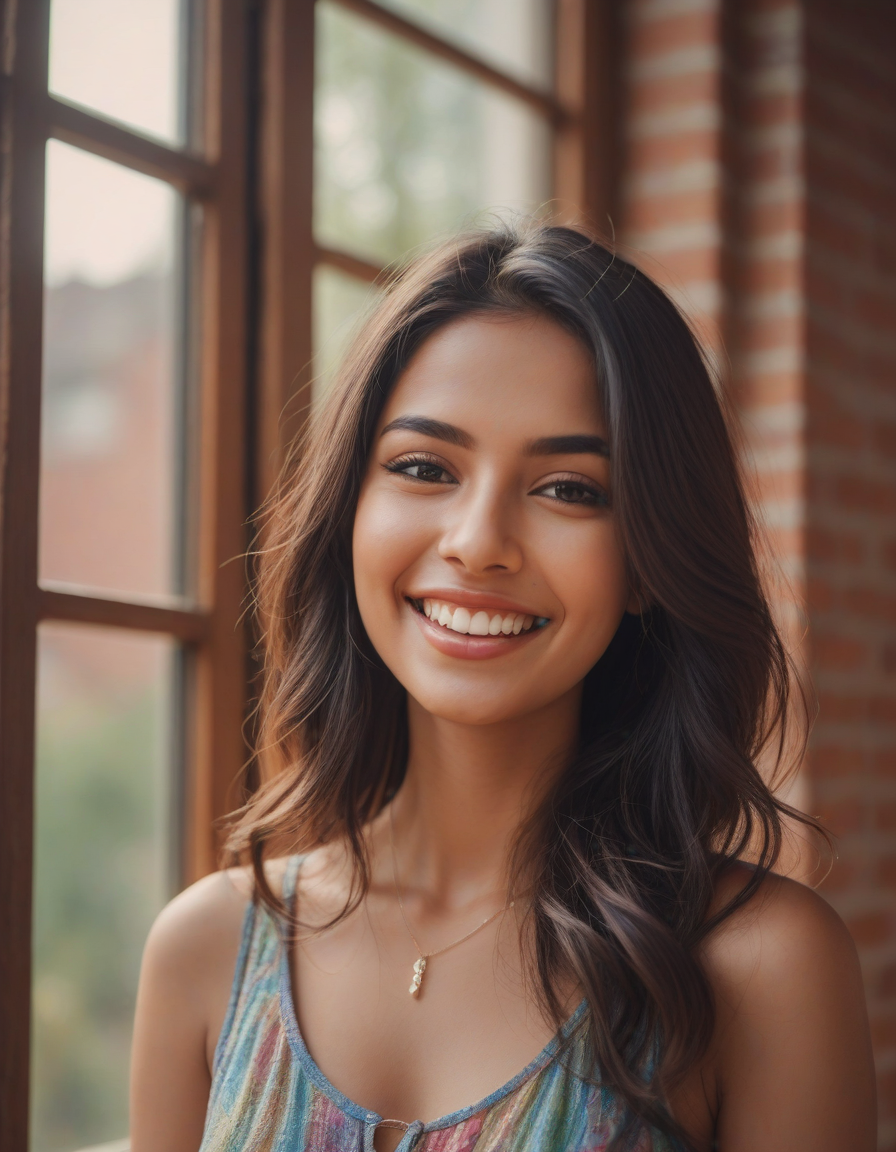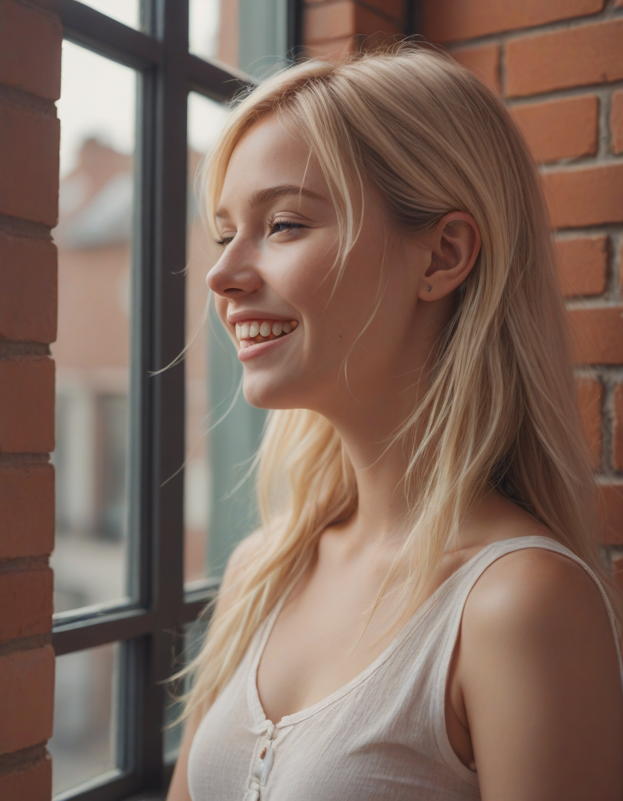 soft dreamy lighting, hazy ethereal glow, laughing, abstract, surreal, close-up, macro, cute, adorable, vibrant saturated colors, bold contrasting palette, brick wall -> great window view