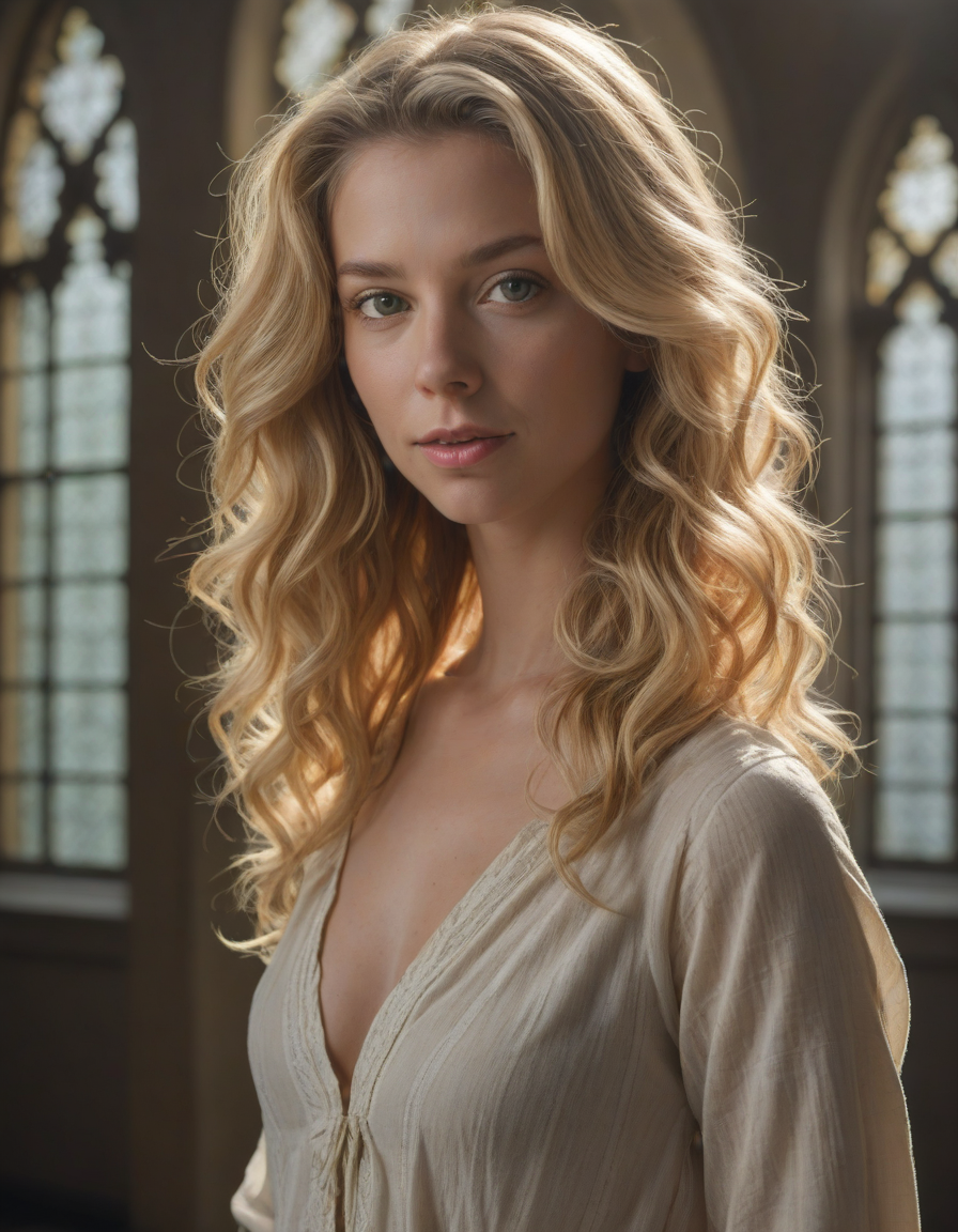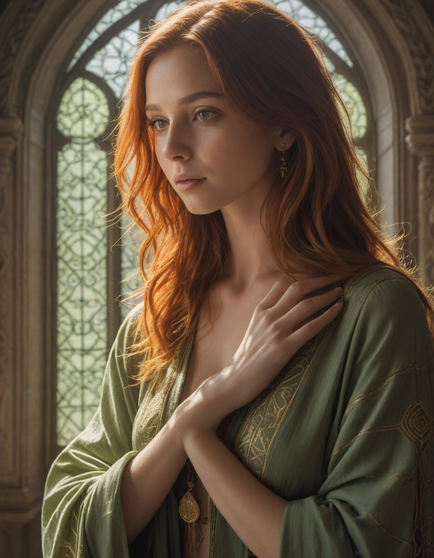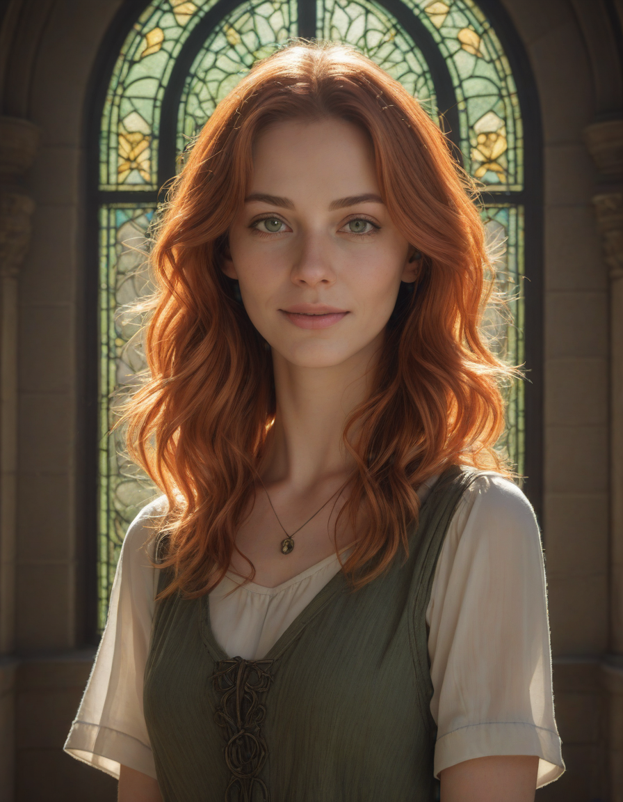 Soft morning, WTF reaction, Sunlit strands, radiant green eyes, nice hands, acting smug, Rays of sunlight beaming through stained glass overhead