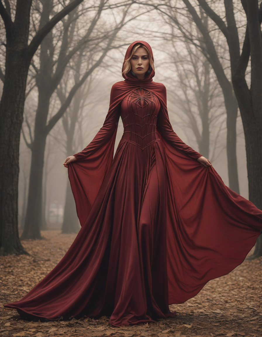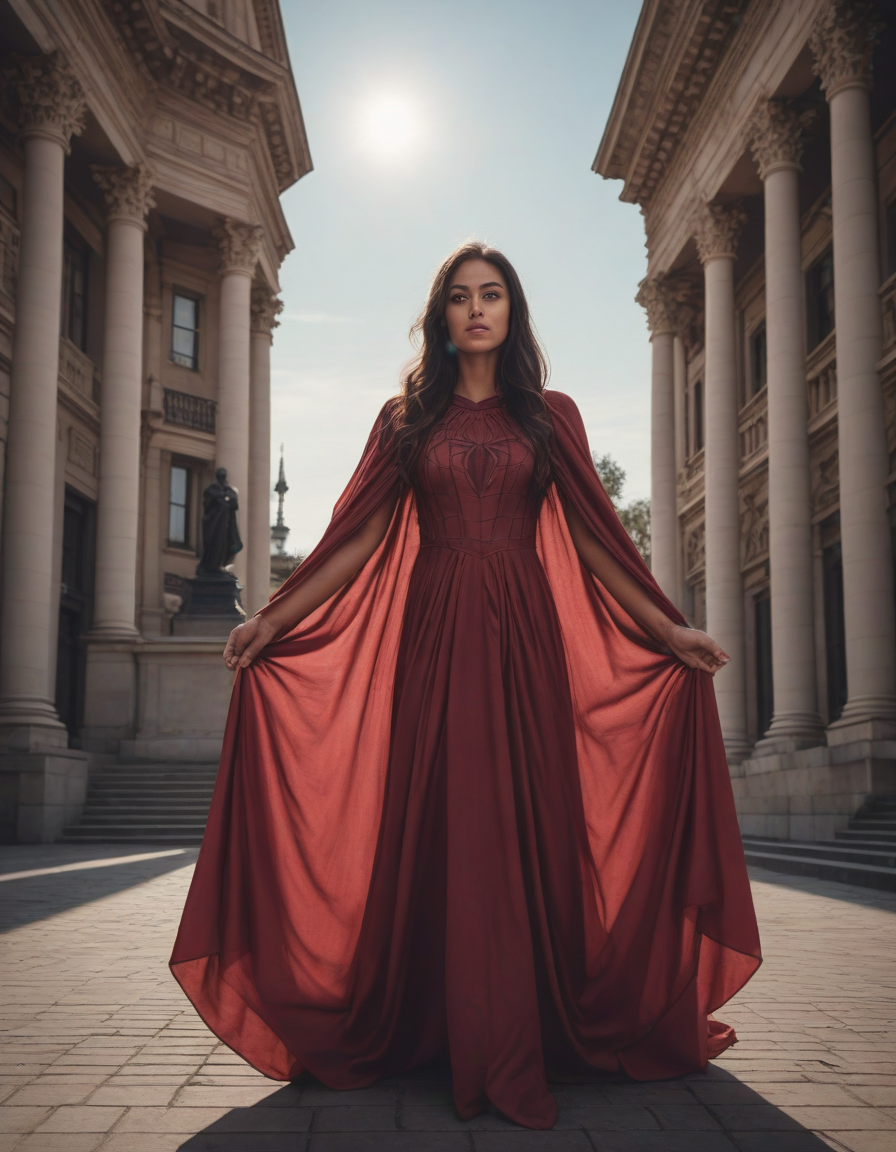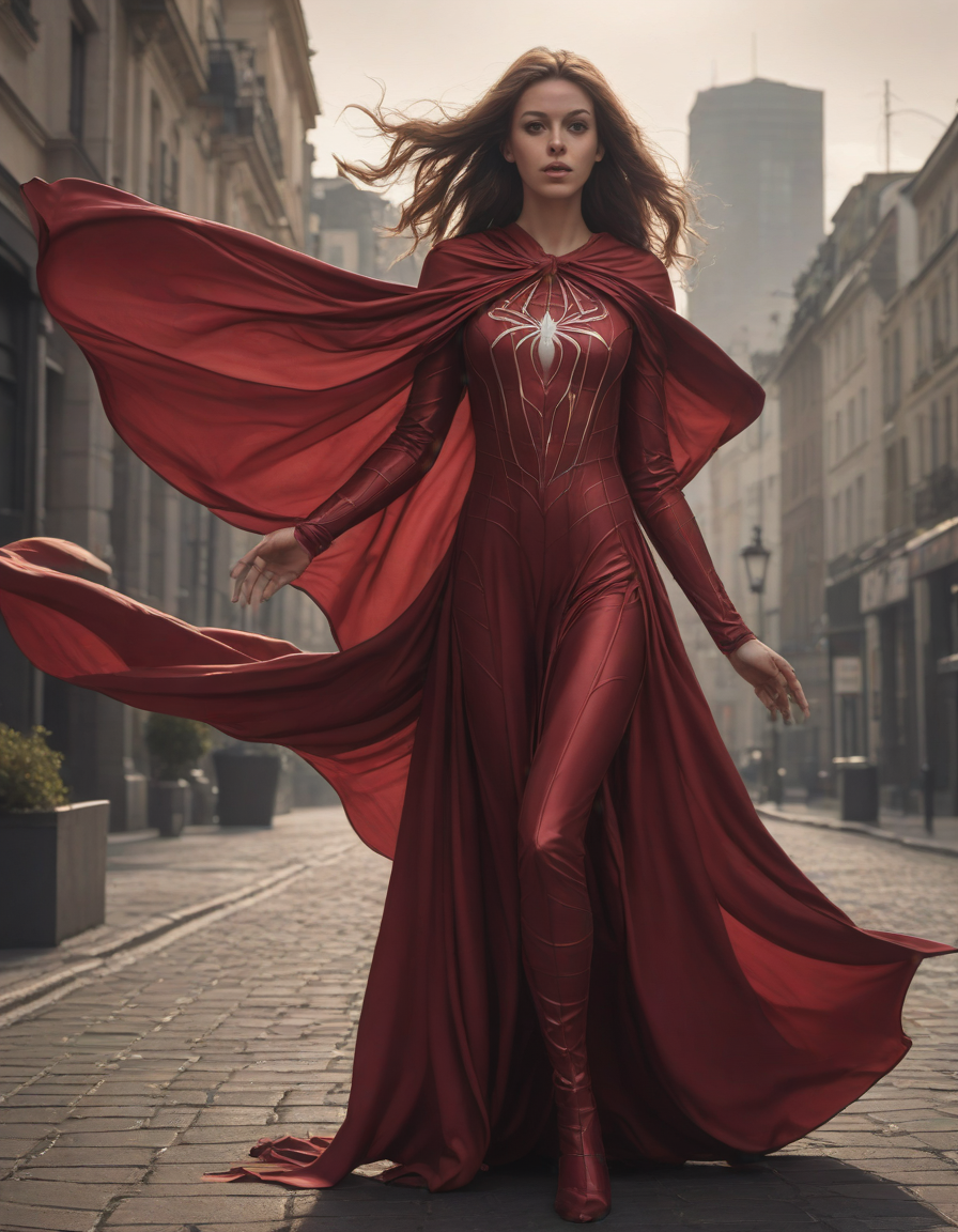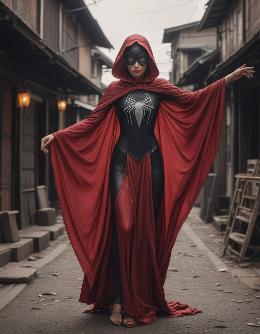 wearing a spiderman costume, very upset, Rose colored long dress flowing in the wind in a curious way, Cloaked shadow, casting a spell, Blinding luminosity