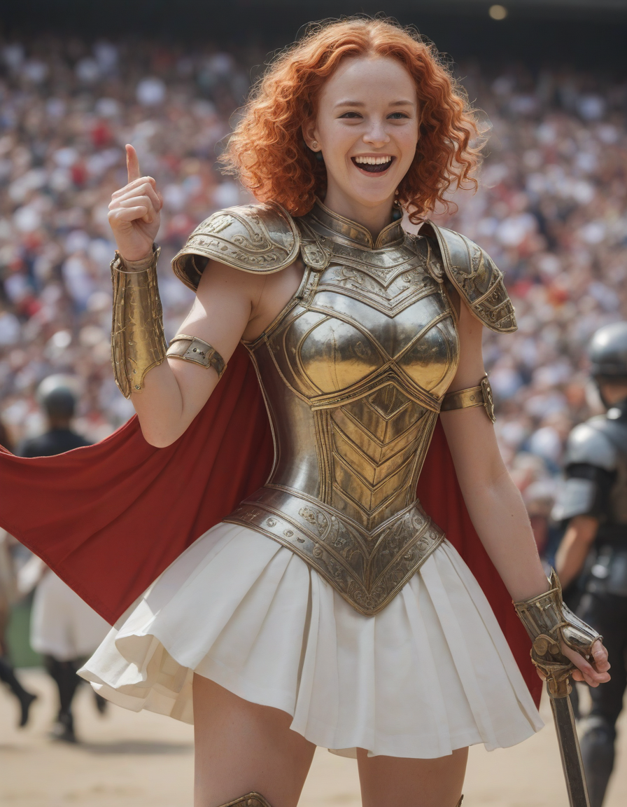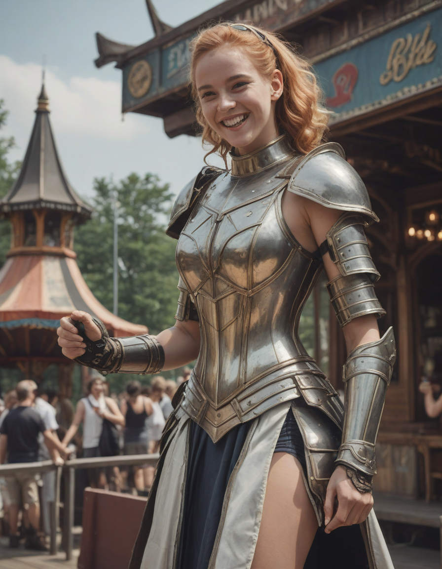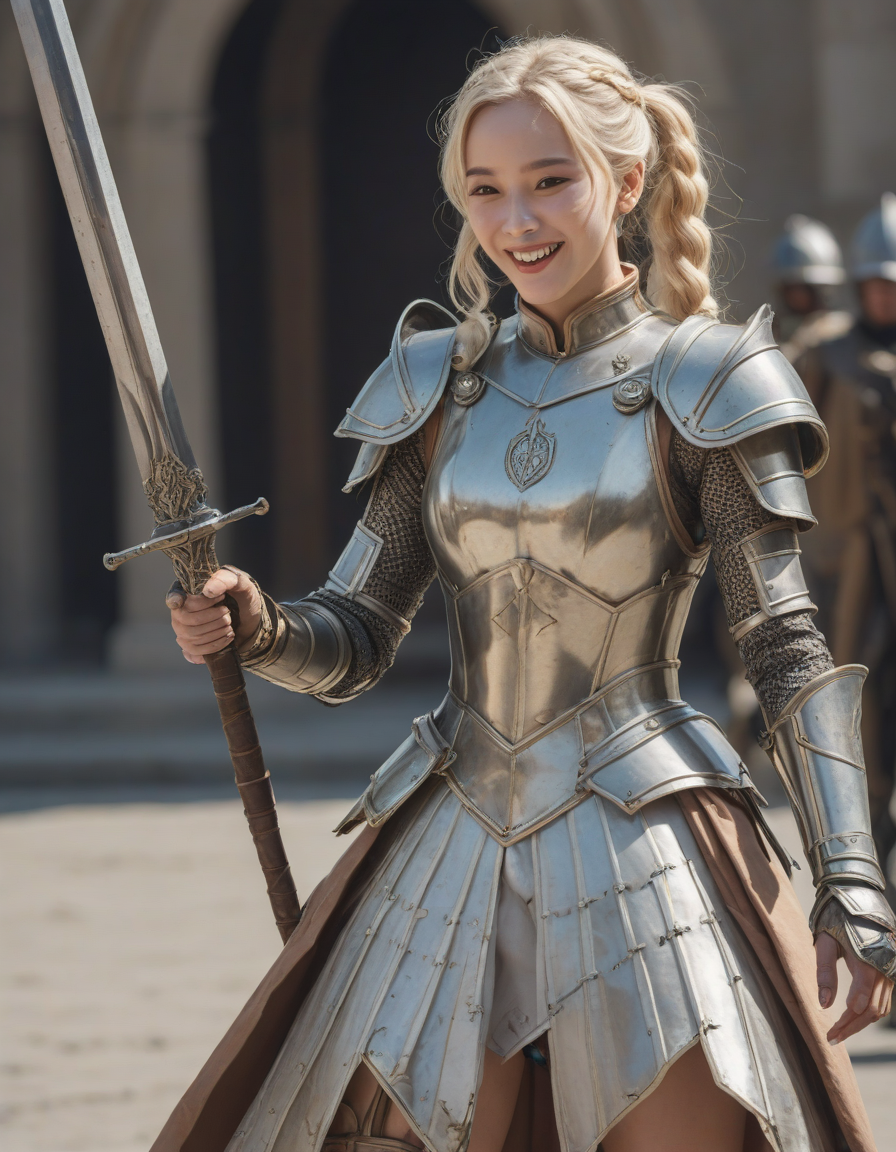wearing sleeveless leotard, wearing one peice clothing, leotard, sleeveless, , laughing, life of the party, Wide Skirt, wide ballgown hem, a line skirt, petticoat skirt, , looking at viewer, Wielding a one-handed weapon in both hands, one-handed weapon, weapon, , wearing complete set of armor, wearing full armor, Wearing chest armor, wearing leg armor, wearing feet armor, wearing bracer, wearing pauldrons, Wearing helmet, Wearing breastplate, Wearing gauntlets, Wearing greaves, Wearing pauldrons, Wearing vambraces, Wearing cuisses, Wearing sabatons, Wearing gorget, Wearing tassets, Wearing bracers, Wearing cuirass, Wearing faulds, Wearing plackart, Wearing spaulders, Wearing besagews