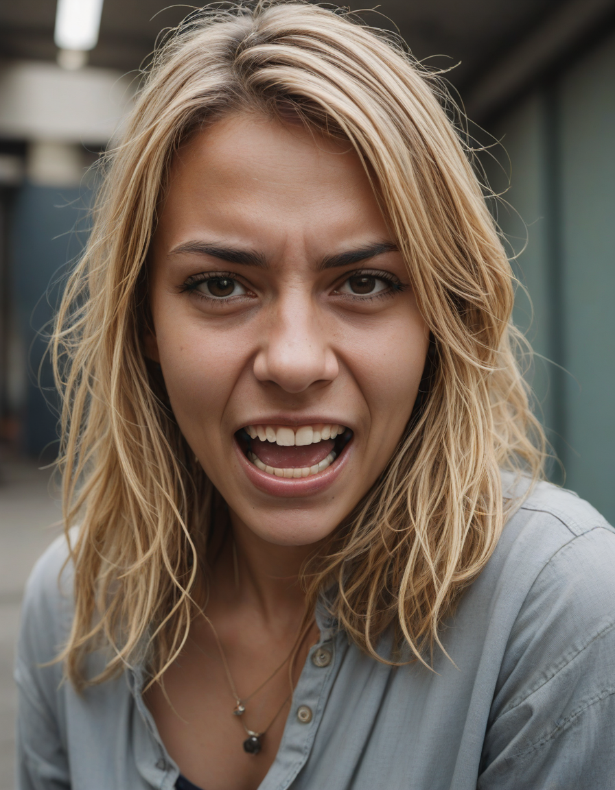 Teeth bared in a snarl, Tattered clothing, wide-angle lens