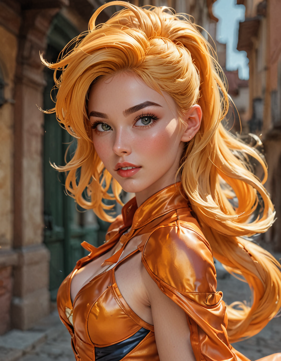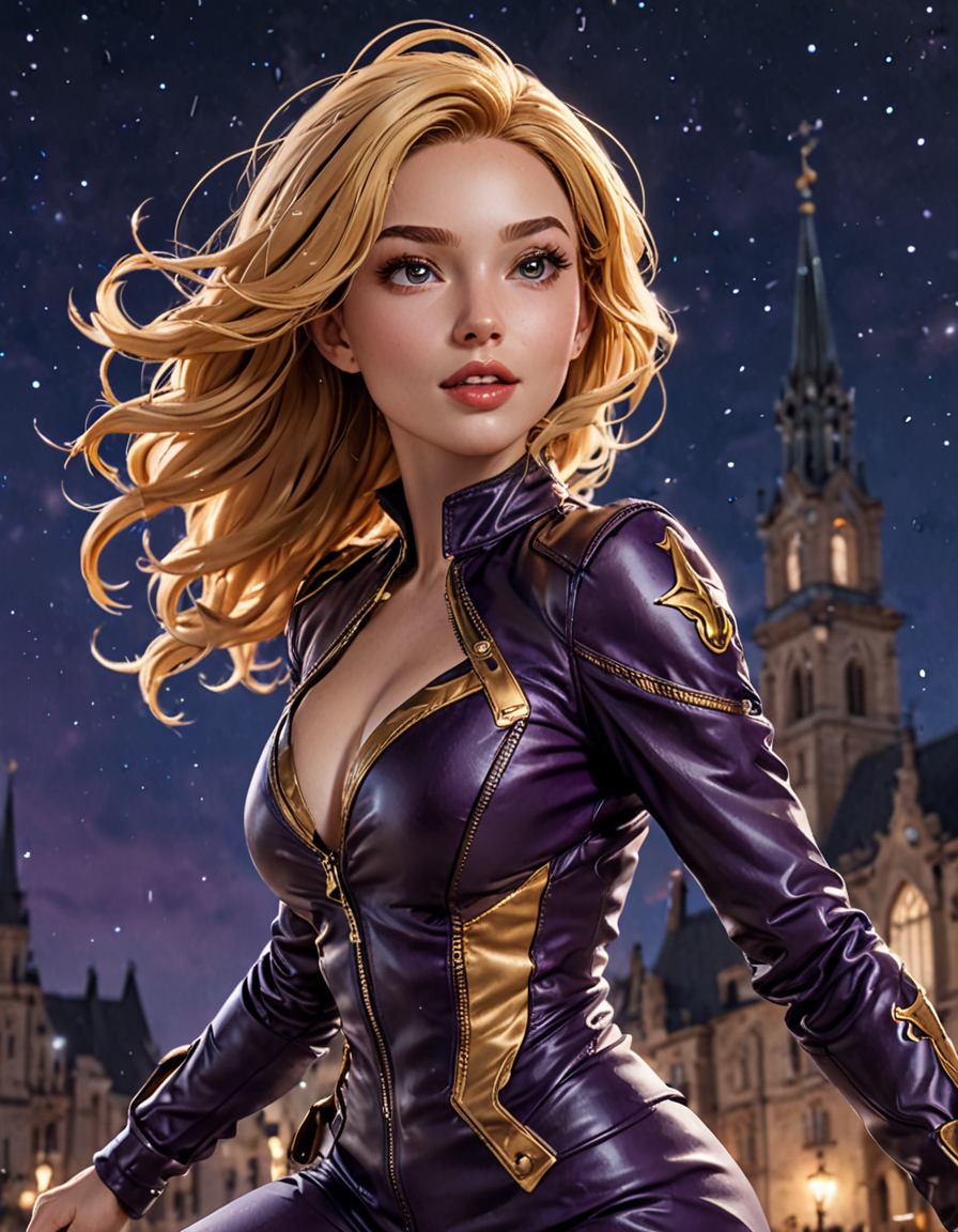static neutral stance, standing straight, arms at sides→dynamic action pose, leaping through the air, superhero landing