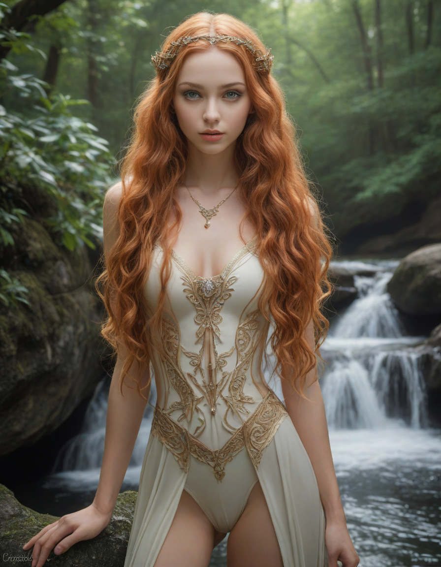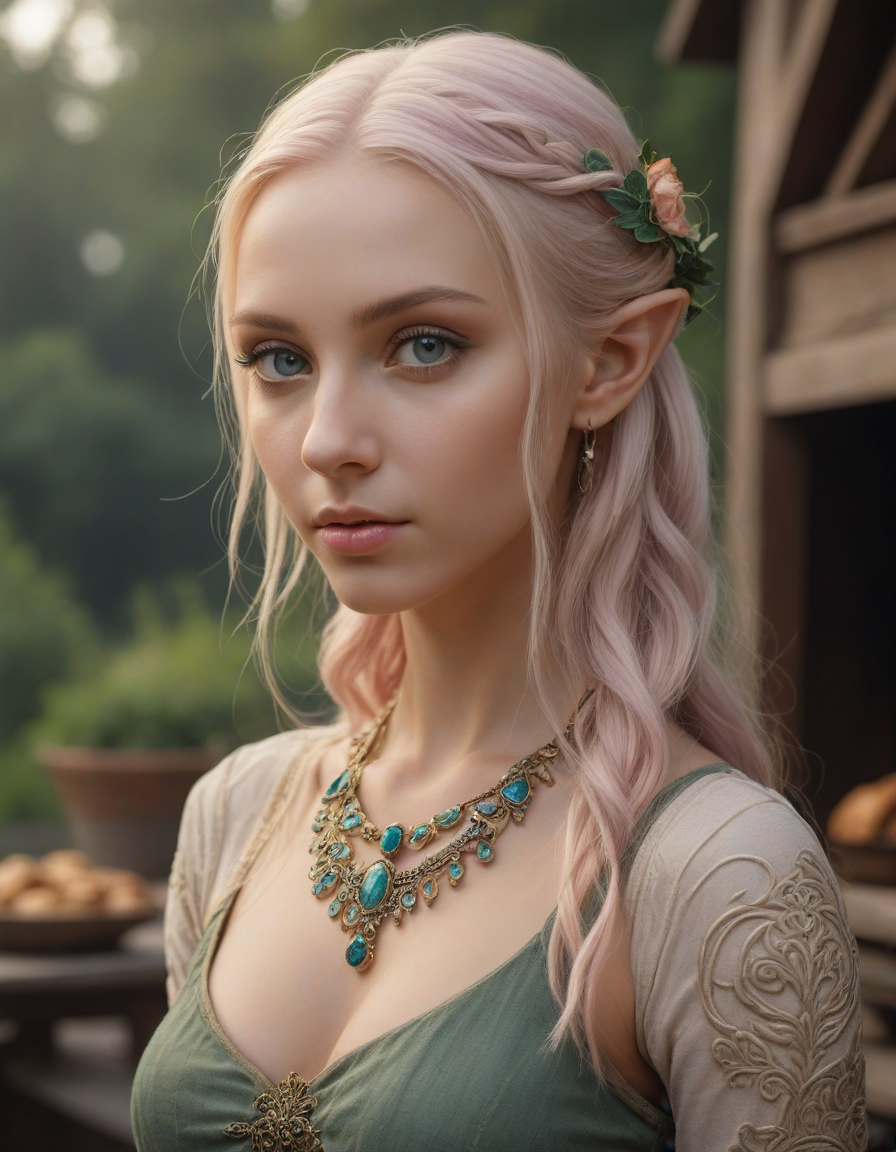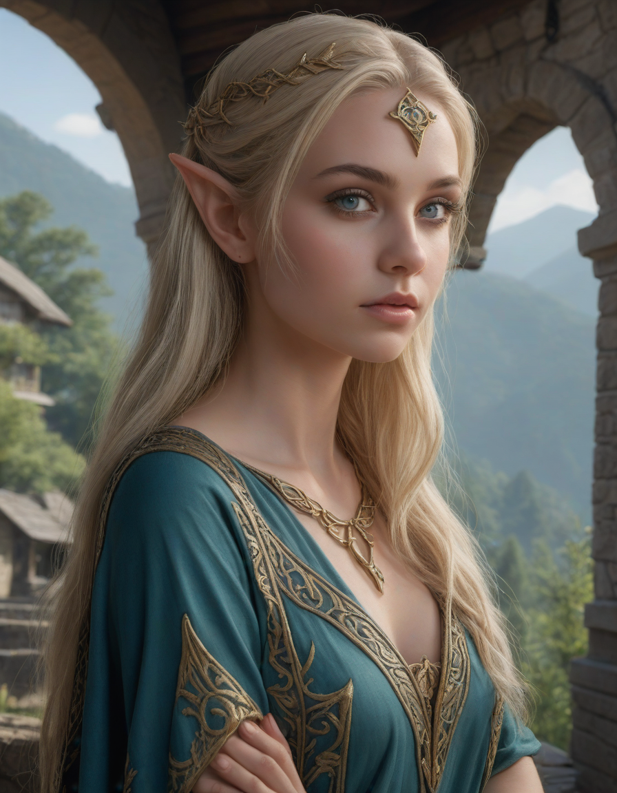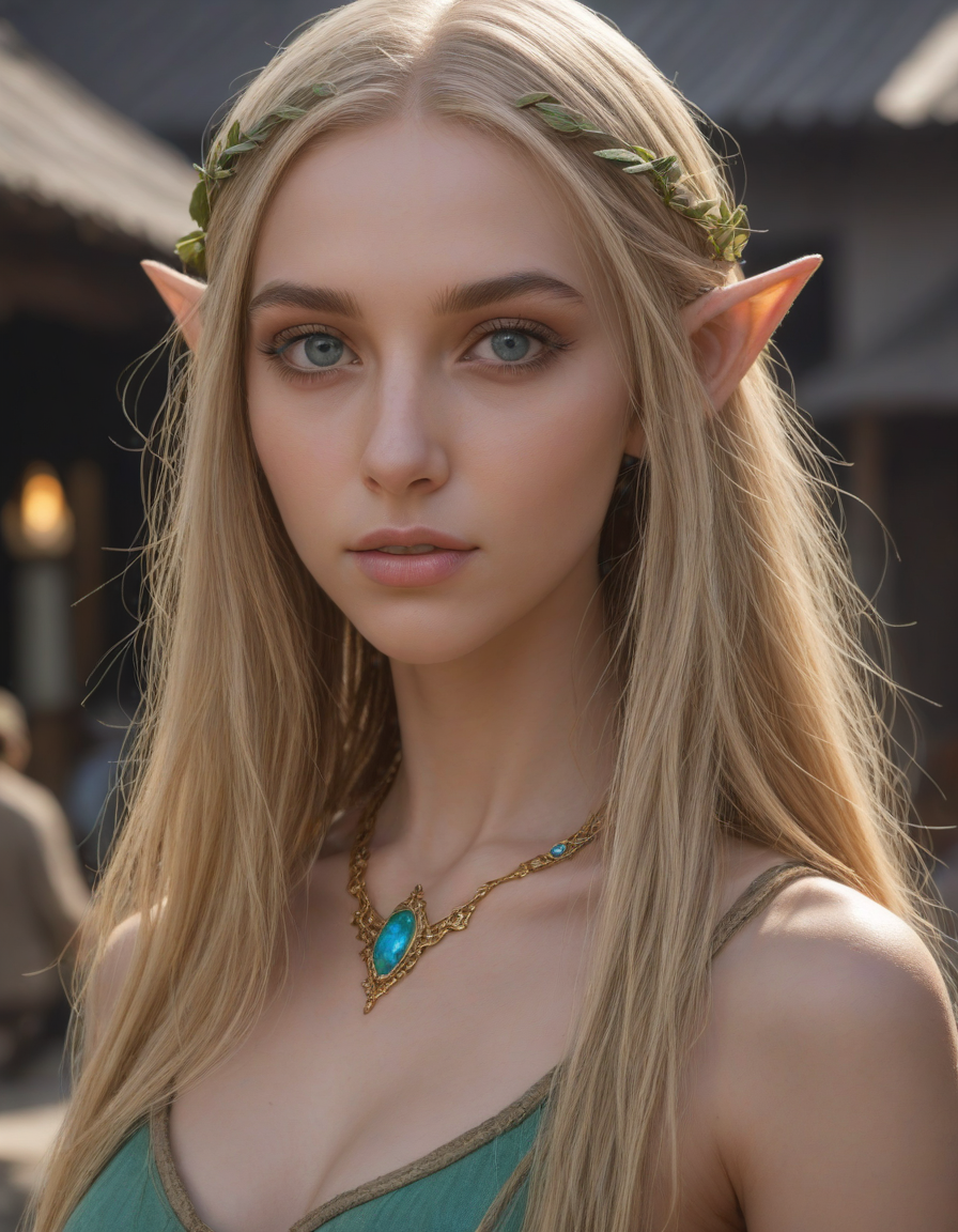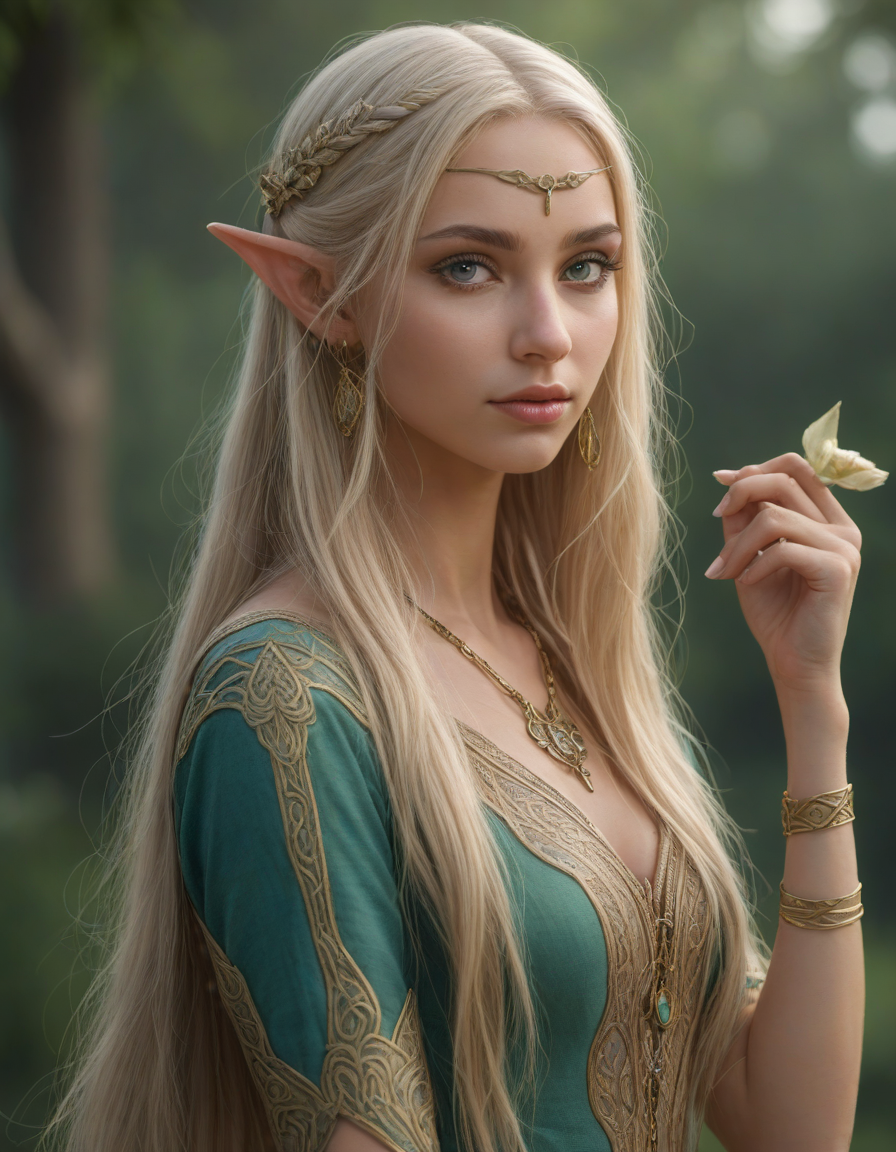 female elf, Elven facial features, elven body, elven, lithe, distinct elven features, long elven legs, Slender, elongated physique, almond-shaped eyes, sharp cheekbones, pointed ears, ethereal beauty, graceful, agile, lithe, smooth skin, exotic, otherworldly aura, delicate features, tall and lean, vibrant eye color, Immaculately Tidy, Intense contrast of, flood, piercing gaze, eyes that dance with delight, Bliss
